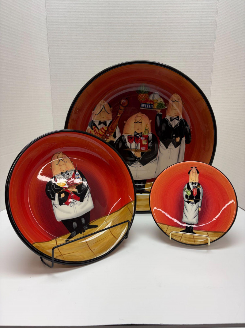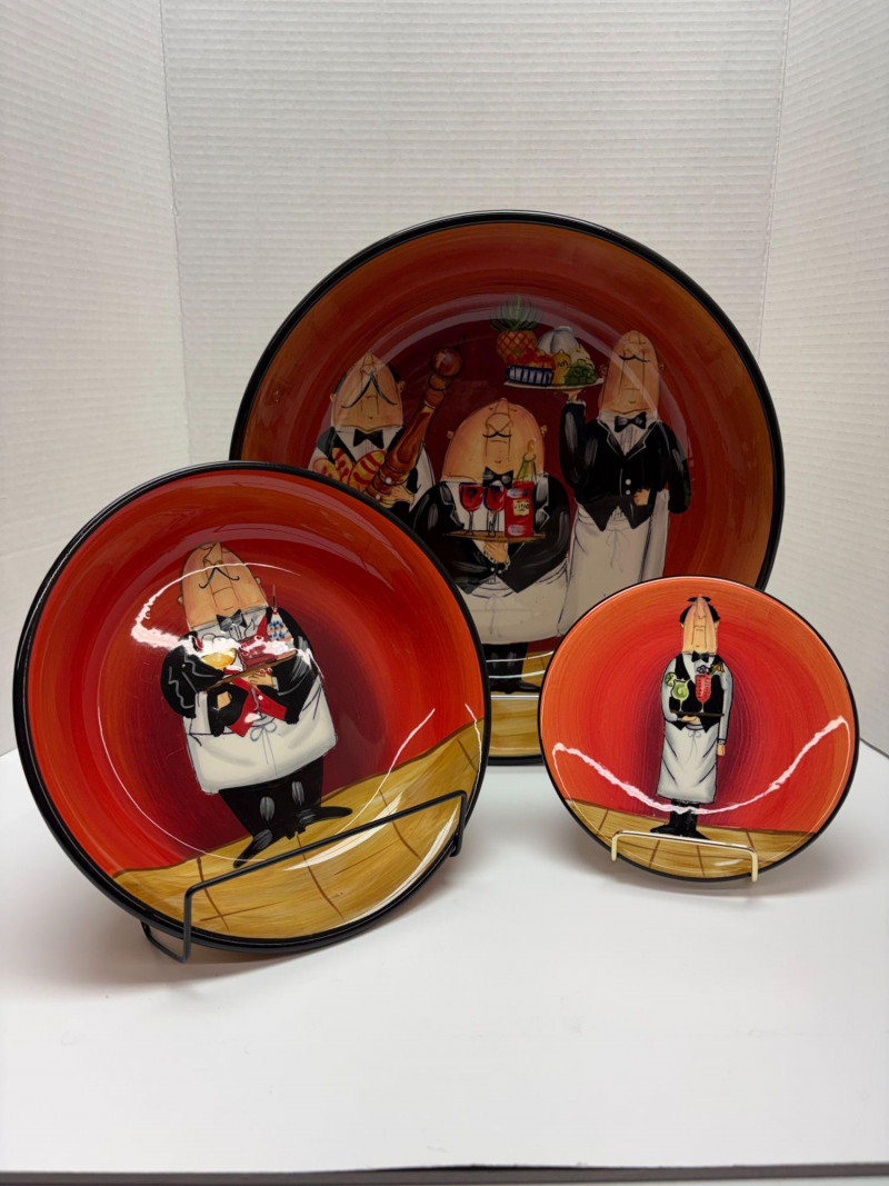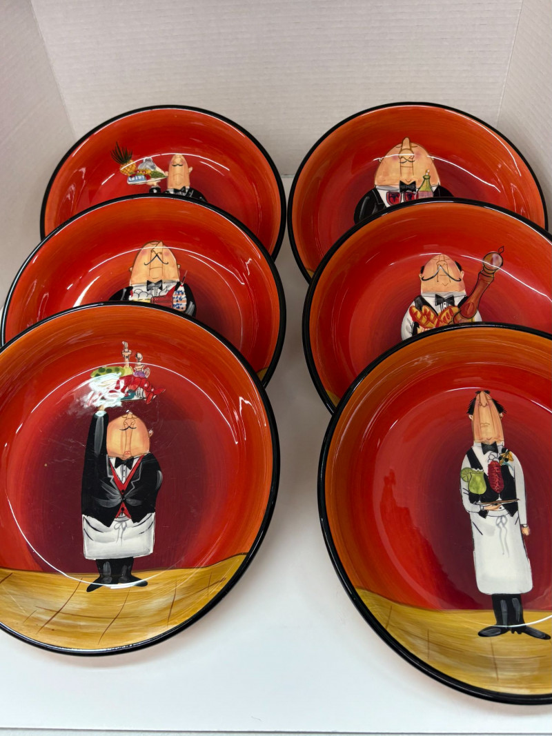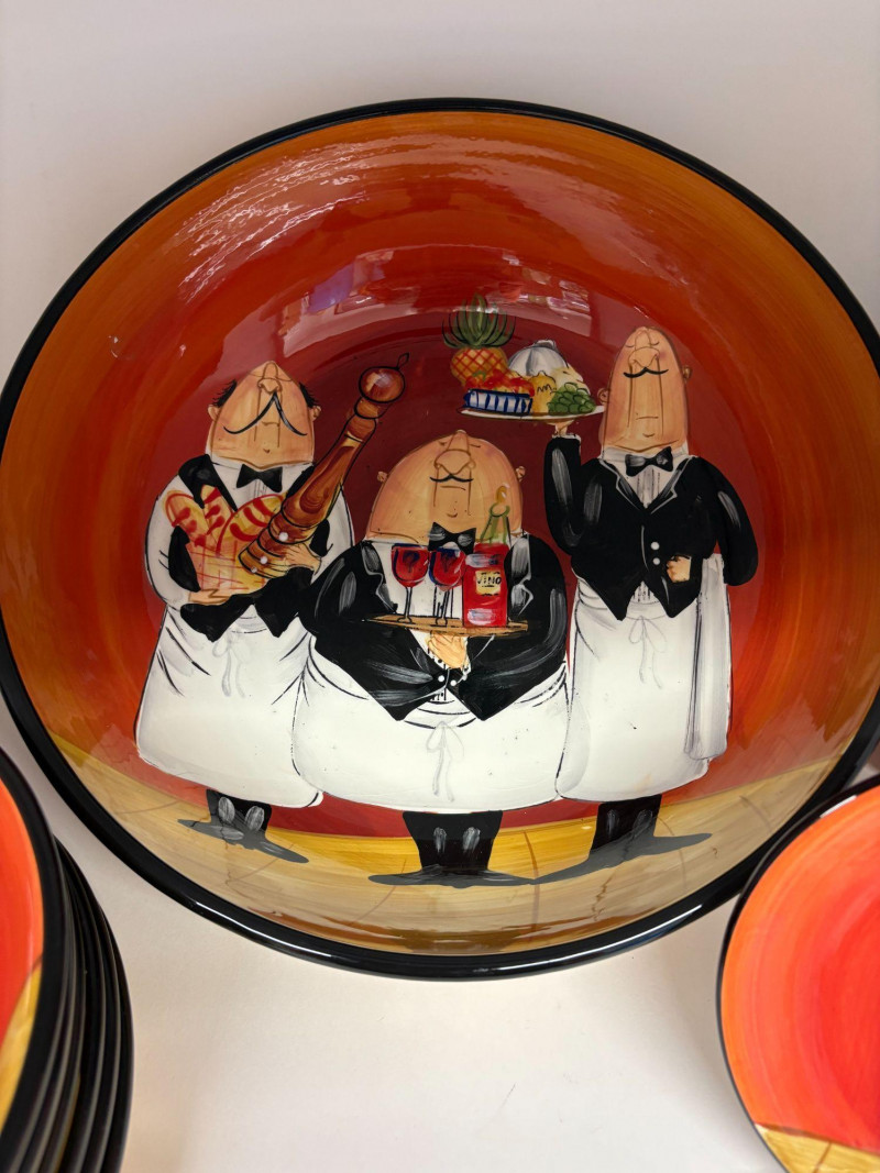 A vibrant seven‑piece pasta bowl set from Certified International, designed by artist Tracy Flickinger. Each piece features her signature whimsical chef illustrations against a rich red backdrop—playful, bold, and perfect for display or service. Includes: One large pasta/serving bowl – 13" diameter Six individual pasta bowls – 9" diameter each The set presents beautifully, with crisp color, charming character work, and a cohesive culinary theme ideal for kitchen décor, entertaining, or adding personality to everyday dining.