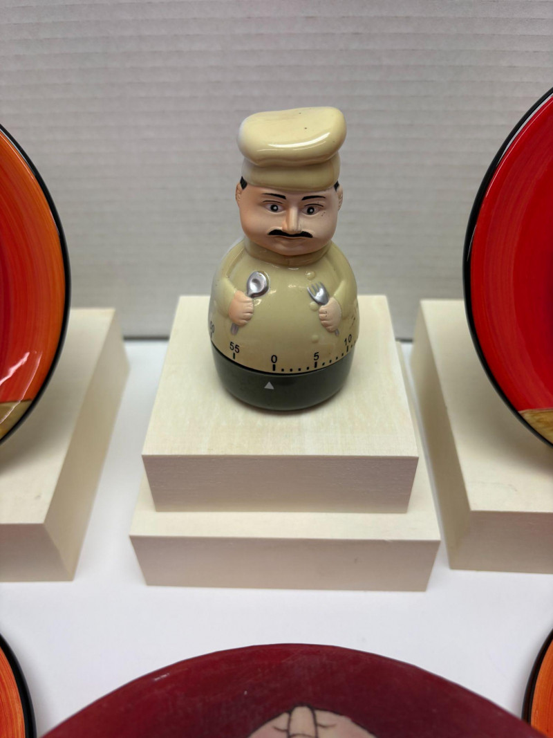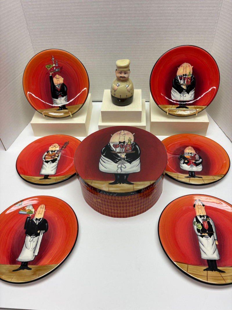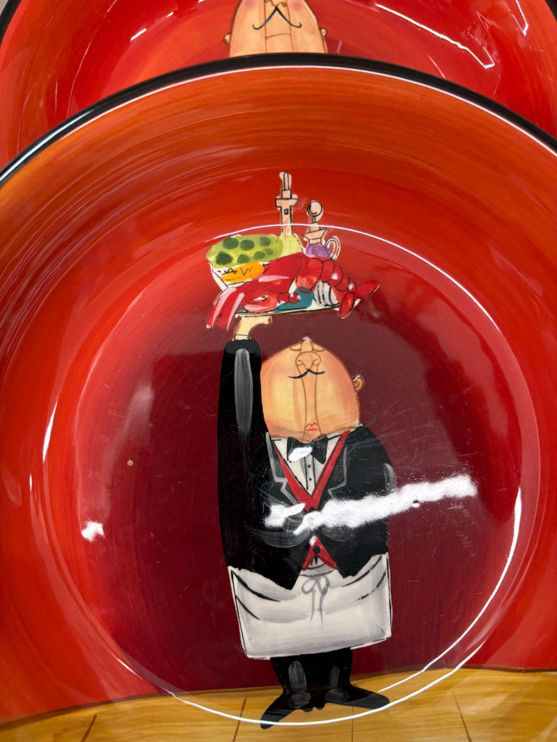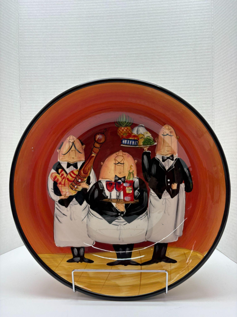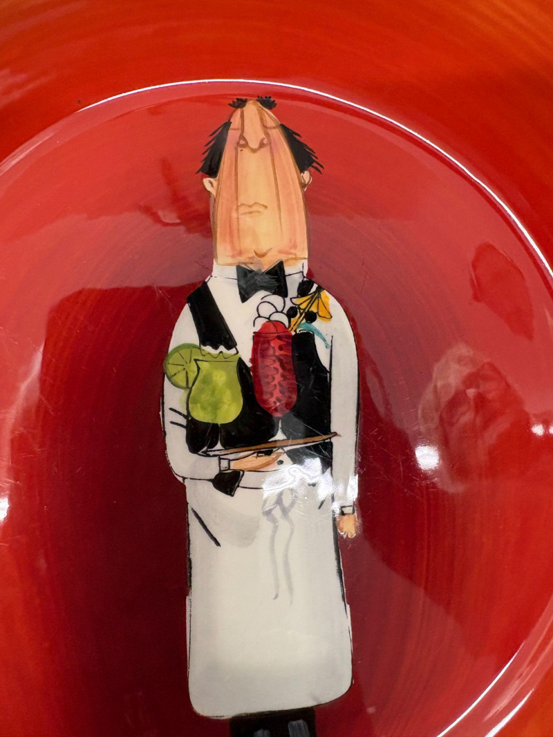 A vibrant seven‑piece pasta bowl set from Certified International, designed by artist Tracy Flickinger. Each piece features her signature whimsical chef illustrations against a rich red backdrop—playful, bold, and perfect for display or service. Includes: One large pasta/serving bowl – 13" diameter Six individual pasta bowls – 9" diameter each The set presents beautifully, with crisp color, charming character work, and a cohesive culinary theme ideal for kitchen décor, entertaining, or adding personality to everyday dining.