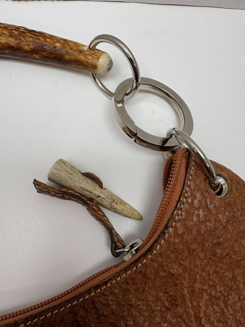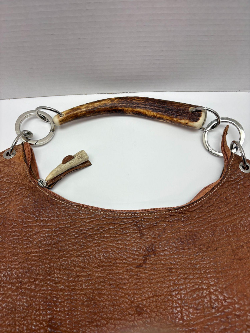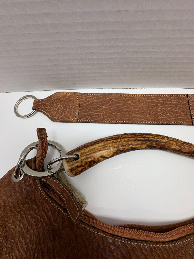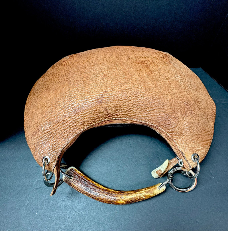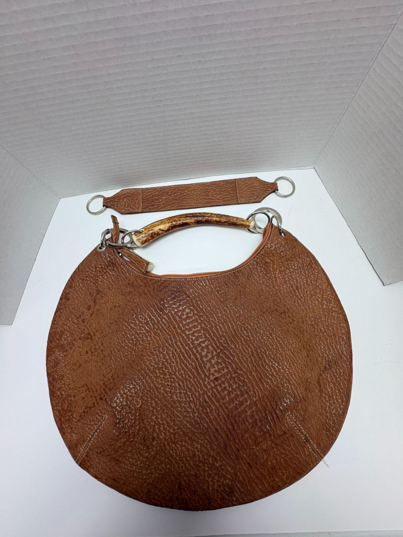 Italian Sirni Roma Handmade Sharkskin Purse with Natural Horn Handle A rare and exquisite handbag from Sirni Roma, a boutique leather atelier nestled in the heart of Italy. Crafted from genuine sharkskin — known for its naturally pebbled texture and exceptional durability — this piece embodies artisanal luxury and timeless style. The asymmetrical oval silhouette is both sculptural and striking, complemented by a distinctive handle fashioned from natural horn. Soft calf leather completes the interior. Secured with metal rings and grommets, the handle adds organic elegance and speaks to the bag’s handcrafted origins. Sirni Pelletteria has long been associated with Roman leather artistry, producing limited-run accessories that blend tradition with innovation. This purse is no exception — a testament to mid-century Italian design and the enduring appeal of exotic materials. This bag also includes an additional handle. https://www.sirnipelletteria.it/it/laboratorio-31