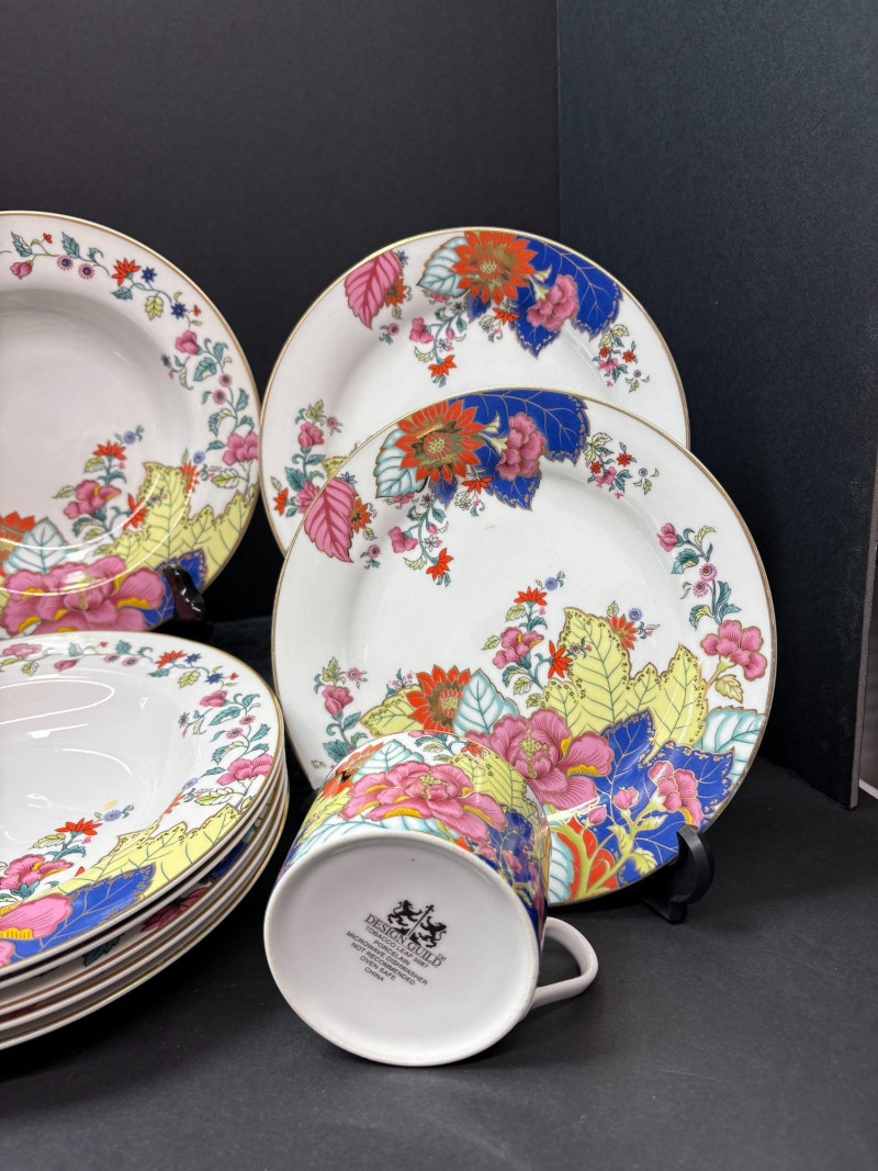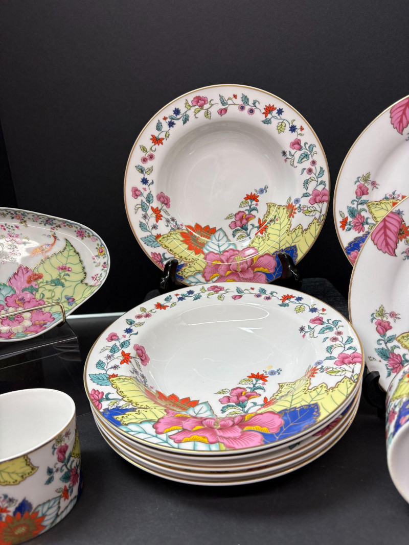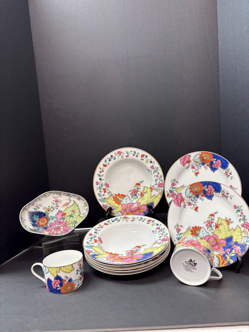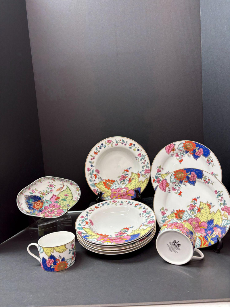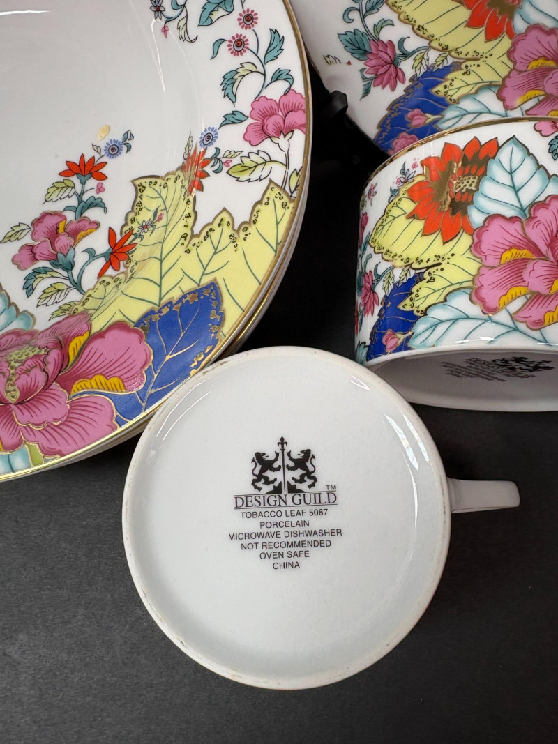 Elevate your table with this exquisite ensemble of Mottahedeh and Design Guild Tobacco Leaf porcelain—an iconic pattern inspired by 18th-century Chinese export ware and beloved by collectors worldwide. Each piece bursts with vibrant florals and gilded accents, showcasing masterful craftsmanship and timeless elegance. This set includes 2 salad plates, 6 bowls, 2 cups, and a tray—ideal for completing or starting your collection. Whether displayed or used for refined entertaining, these pieces embody sophistication and heritage.
