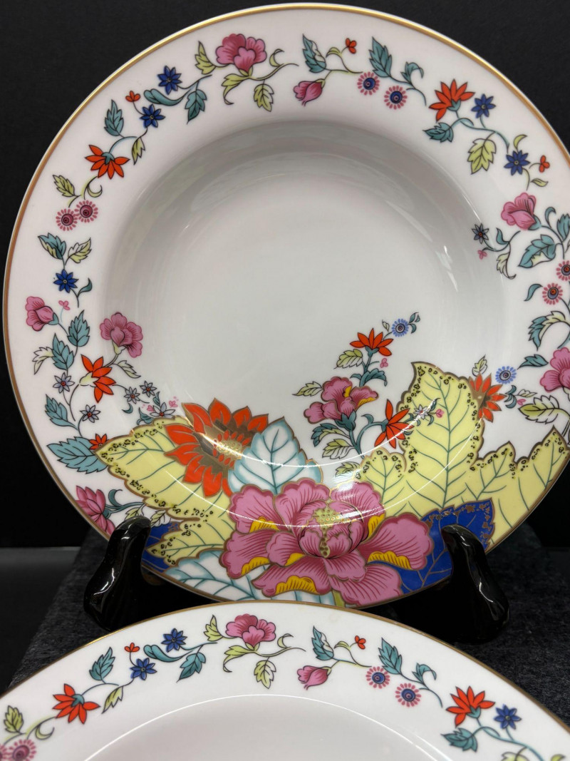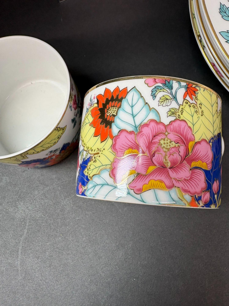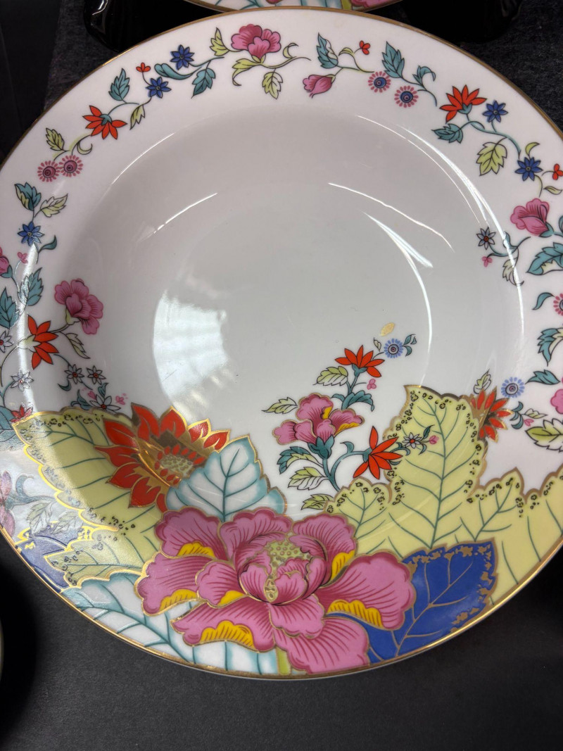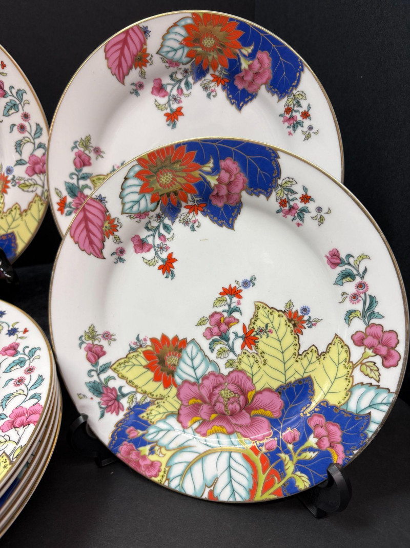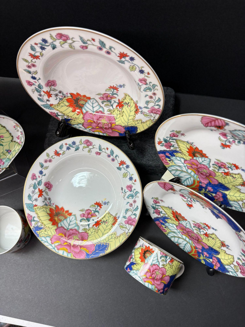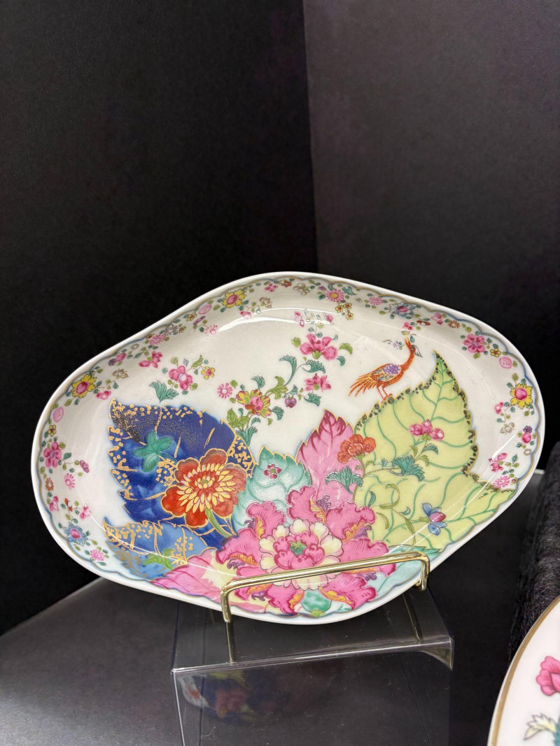 Elevate your table with this exquisite ensemble of Mottahedeh and Design Guild Tobacco Leaf porcelain—an iconic pattern inspired by 18th-century Chinese export ware and beloved by collectors worldwide. Each piece bursts with vibrant florals and gilded accents, showcasing masterful craftsmanship and timeless elegance. This set includes 2 salad plates, 6 bowls, 2 cups, and a tray—ideal for completing or starting your collection. Whether displayed or used for refined entertaining, these pieces embody sophistication and heritage.