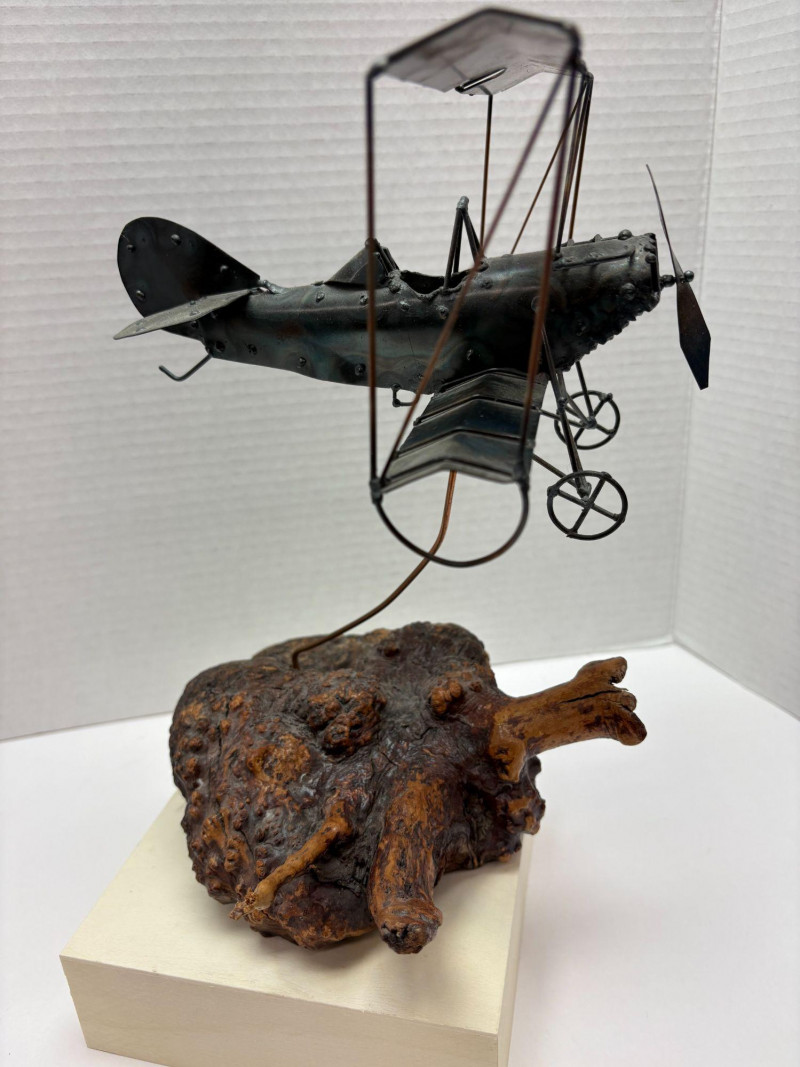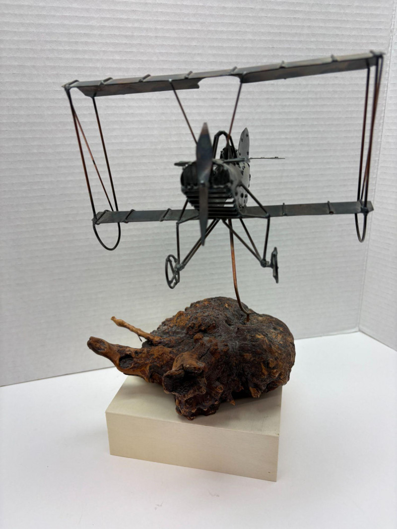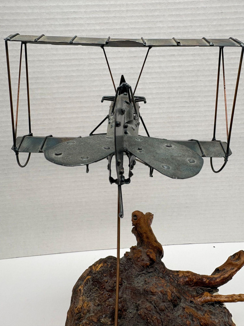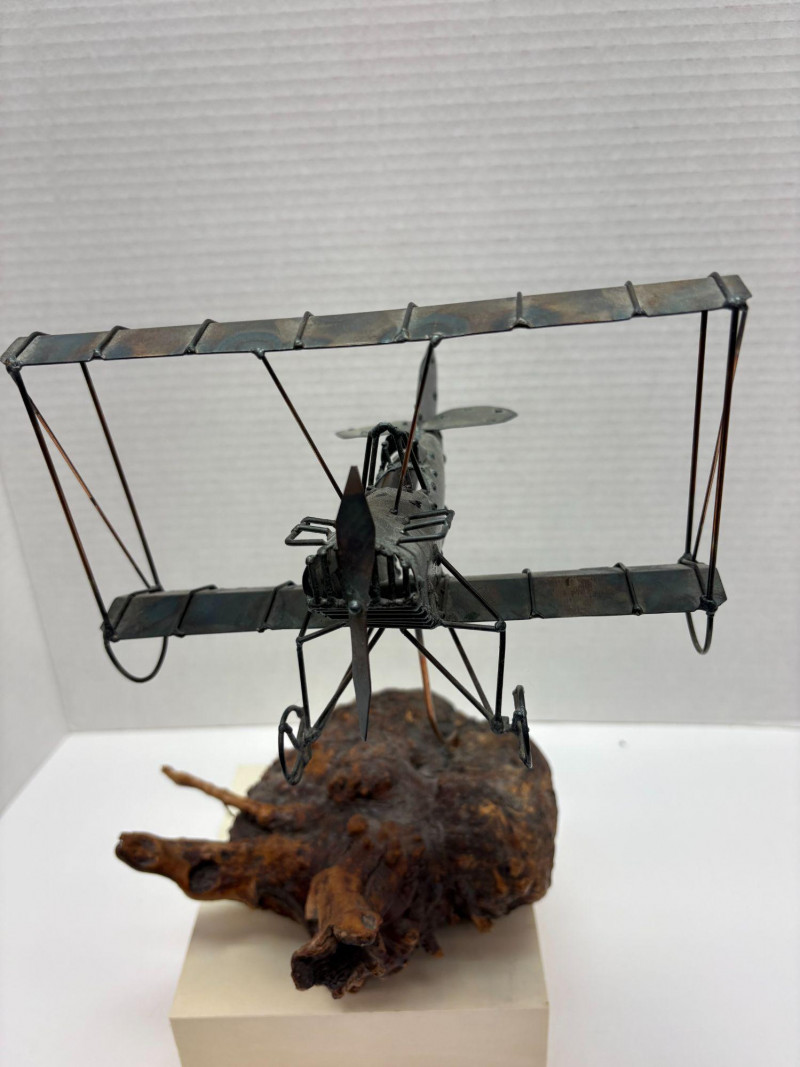 Charming metal biplane model featuring dual wings, detailed struts, and a classic propeller design. Mounted on a sculptural root‑style base that adds texture and visual interest. A distinctive decorative piece with vintage aviation appeal—ideal for collectors or as a unique accent display. Piece measures 10.5" High x 7" Wide