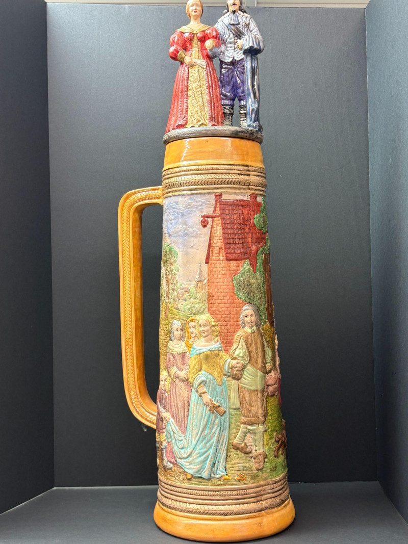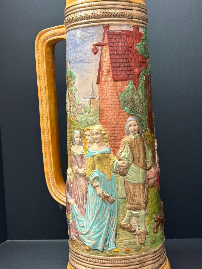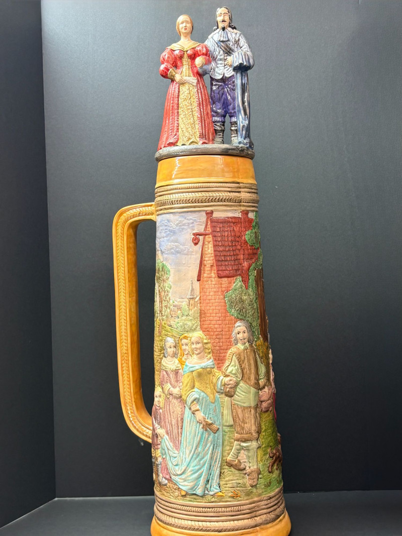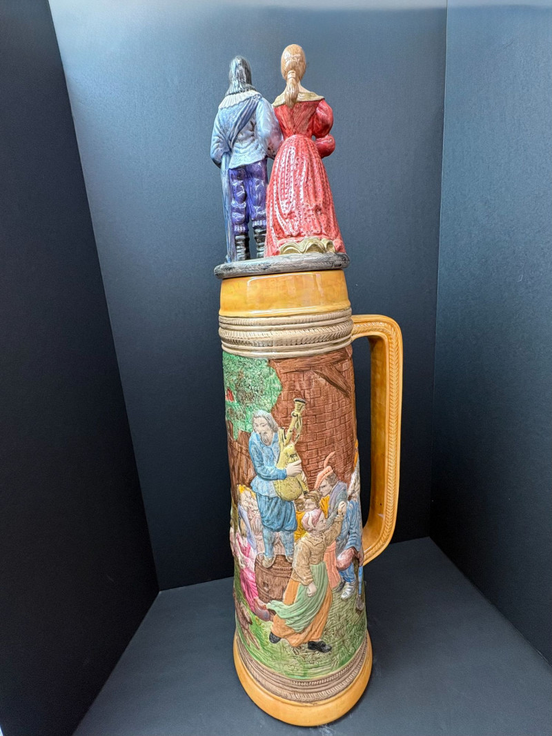 A richly detailed German beer stein showcasing classic relief artistry, this sculptural piece features a full wrap of traditional village figures rendered in deep, dimensional carving. The removable lid is crowned with a finely modeled figural topper, adding height, presence, and collectible appeal. Warm earth‑tone glazes highlight the contours of the scene, while the generous handle and substantial weight give it the feel of an heirloom display piece. A striking addition to any stein collection or Old World décor.