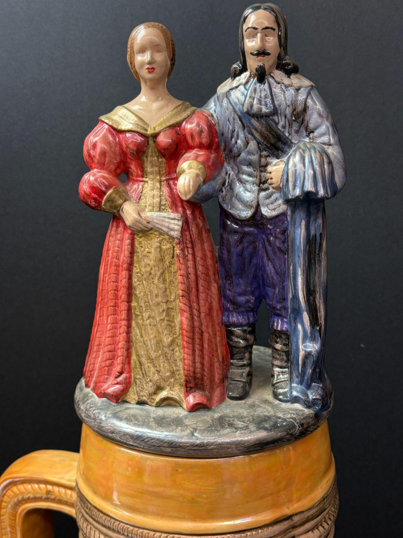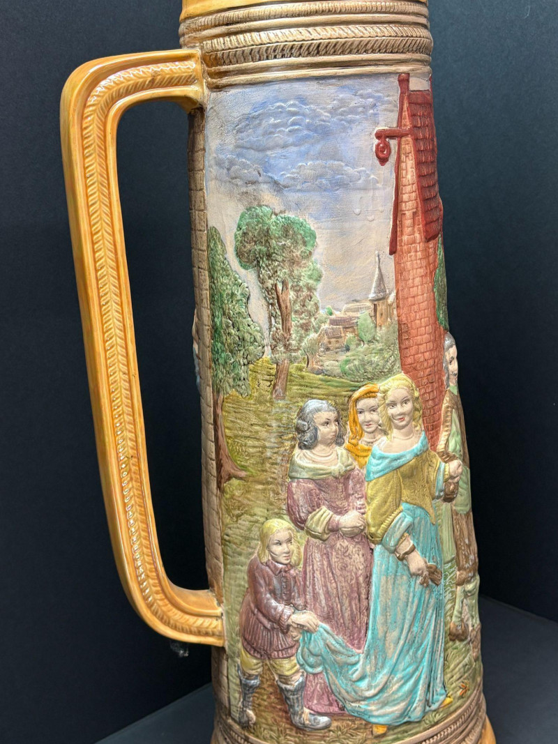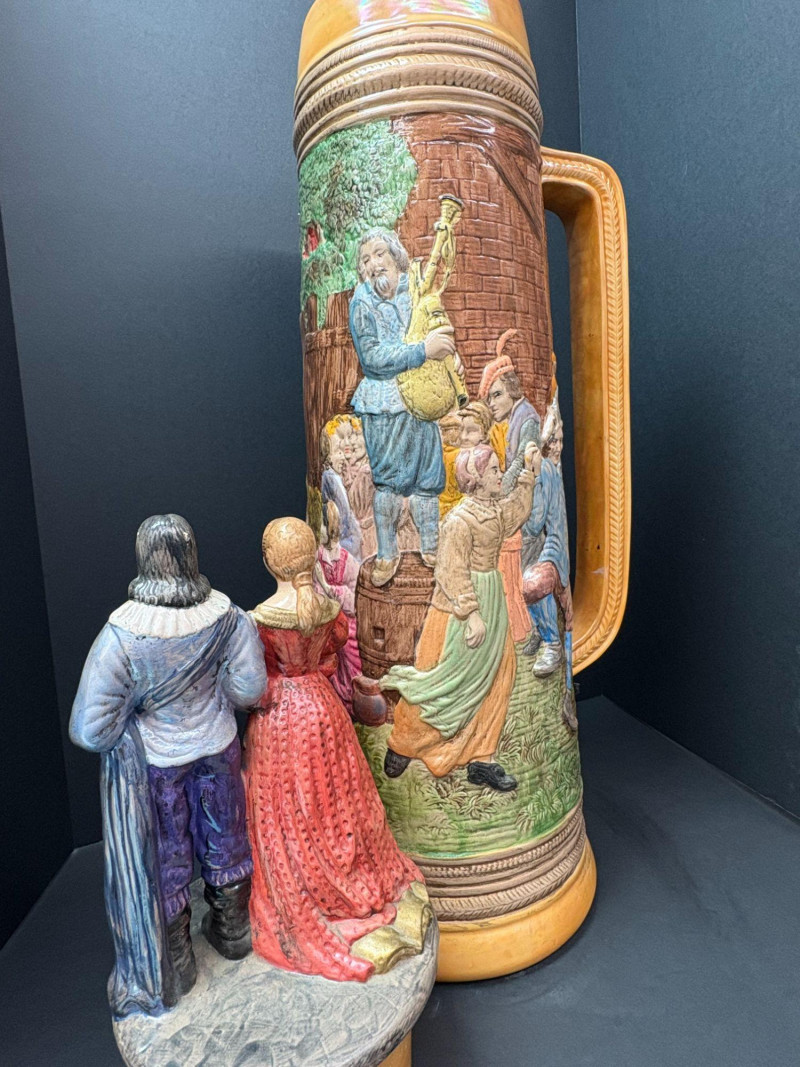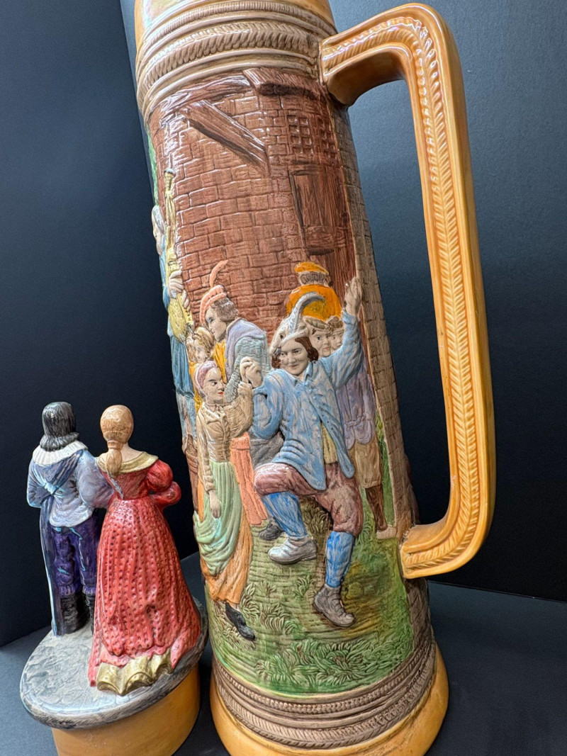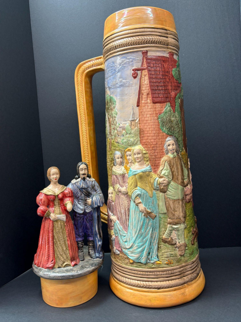 A richly detailed German beer stein showcasing classic relief artistry, this sculptural piece features a full wrap of traditional village figures rendered in deep, dimensional carving. The removable lid is crowned with a finely modeled figural topper, adding height, presence, and collectible appeal. Warm earth‑tone glazes highlight the contours of the scene, while the generous handle and substantial weight give it the feel of an heirloom display piece. A striking addition to any stein collection or Old World décor.
