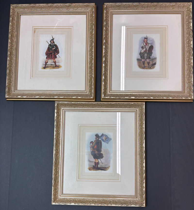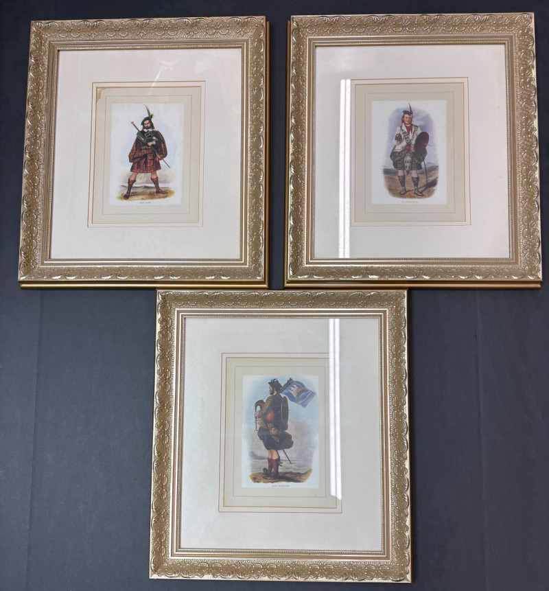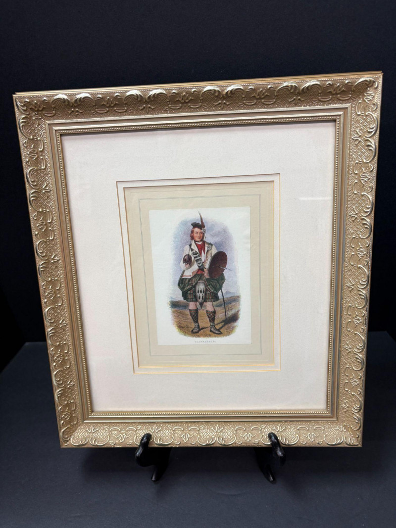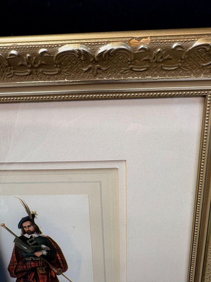 A distinguished trio of hand-colored prints depicting Scottish Highland gentlemen in traditional regalia, each elegantly framed in ornate gold with cream matting. These 19th-century-style illustrations celebrate the heritage of Highland dress—from richly patterned kilts and sporrans to feathered bonnets—capturing the pride and pageantry of Scotland’s cultural legacy. The figures are rendered with fine detail and dignified posture, evoking the romanticism of clan identity and ceremonial tradition. Ideal for collectors of historical prints, Scottish memorabilia, or refined wall décor. All 3 pieces are 15.5' H x 13.5" w Excellent vintage presentation with minor wear consistent with age *Please note small water damage on print corner and a small chip on the upper frame.