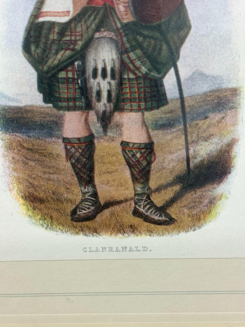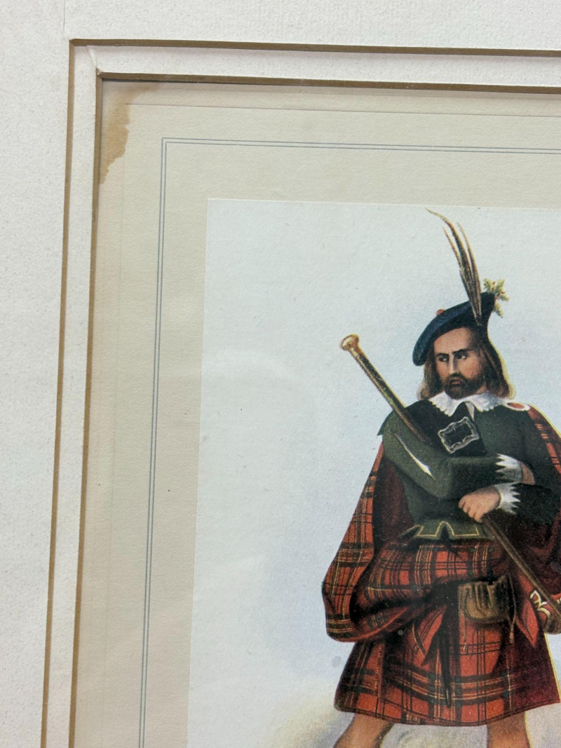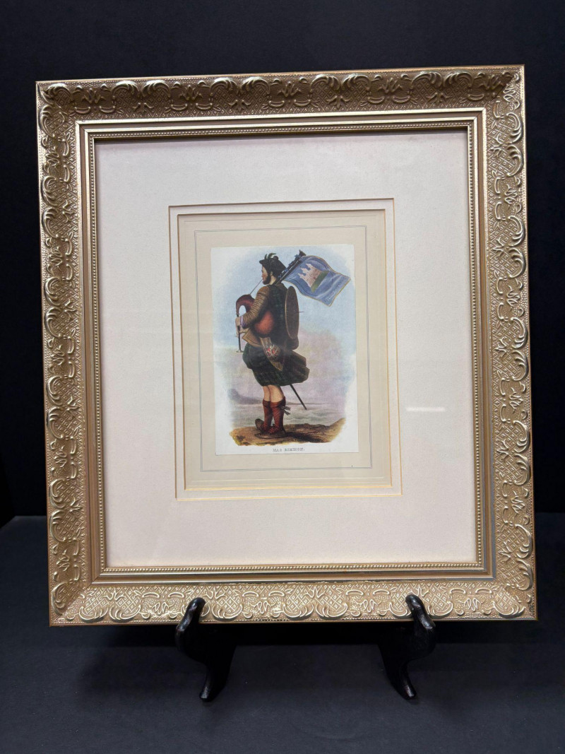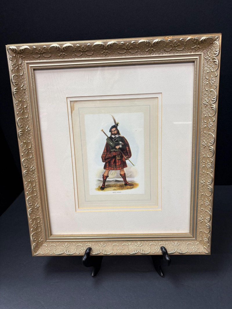A distinguished trio of hand-colored prints depicting Scottish Highland gentlemen in traditional regalia, each elegantly framed in ornate gold with cream matting. These 19th-century-style illustrations celebrate the heritage of Highland dress—from richly patterned kilts and sporrans to feathered bonnets—capturing the pride and pageantry of Scotland’s cultural legacy. The figures are rendered with fine detail and dignified posture, evoking the romanticism of clan identity and ceremonial tradition. Ideal for collectors of historical prints, Scottish memorabilia, or refined wall décor. All 3 pieces are 15.5' H x 13.5" w Excellent vintage presentation with minor wear consistent with age *Please note small water damage on print corner and a small chip on the upper frame.