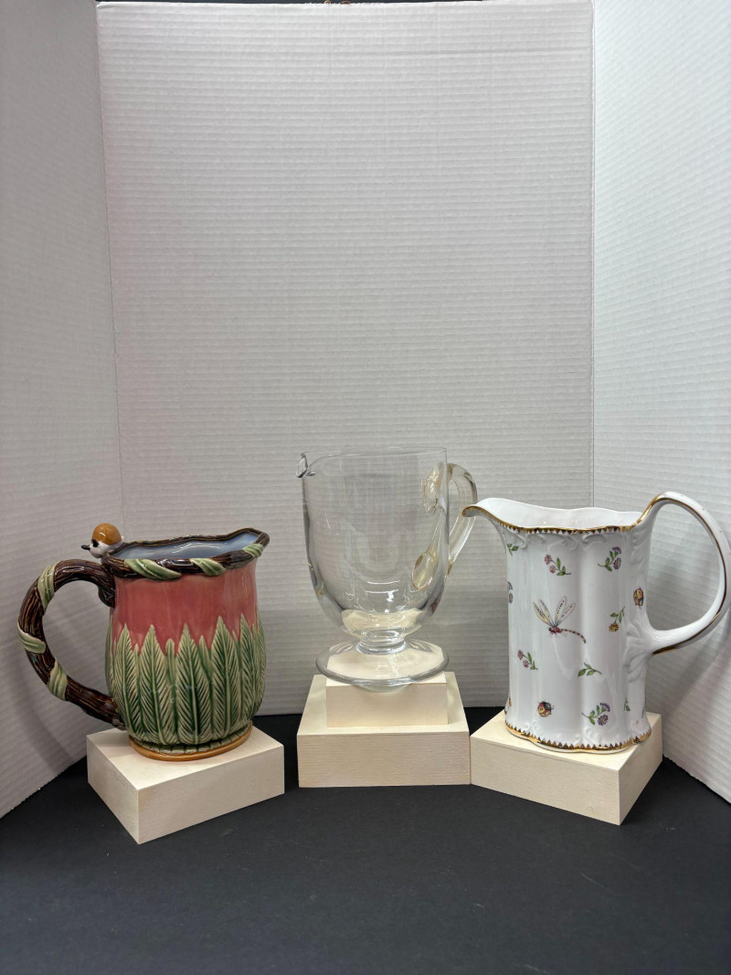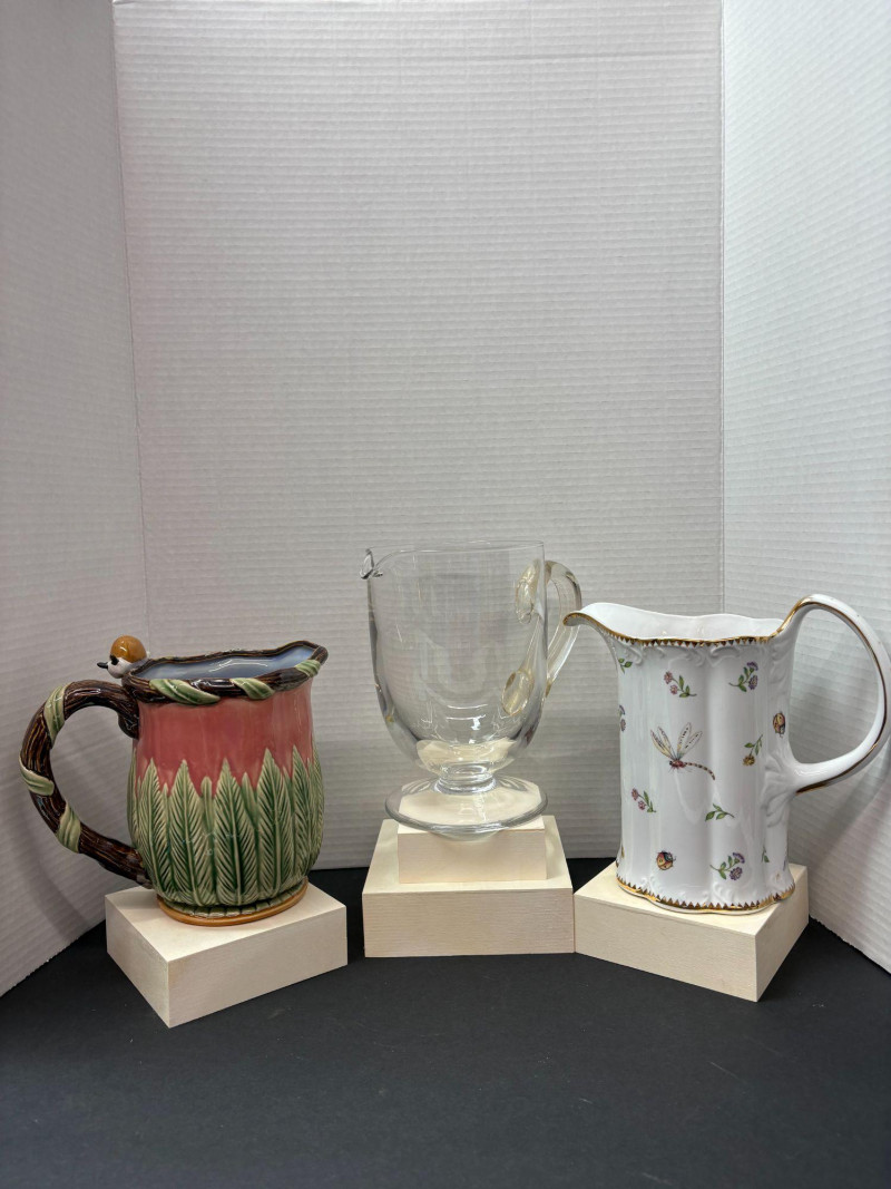 A trio of collectible beverage pitchers, each representing a distinct tradition of artistry and craftsmanship.