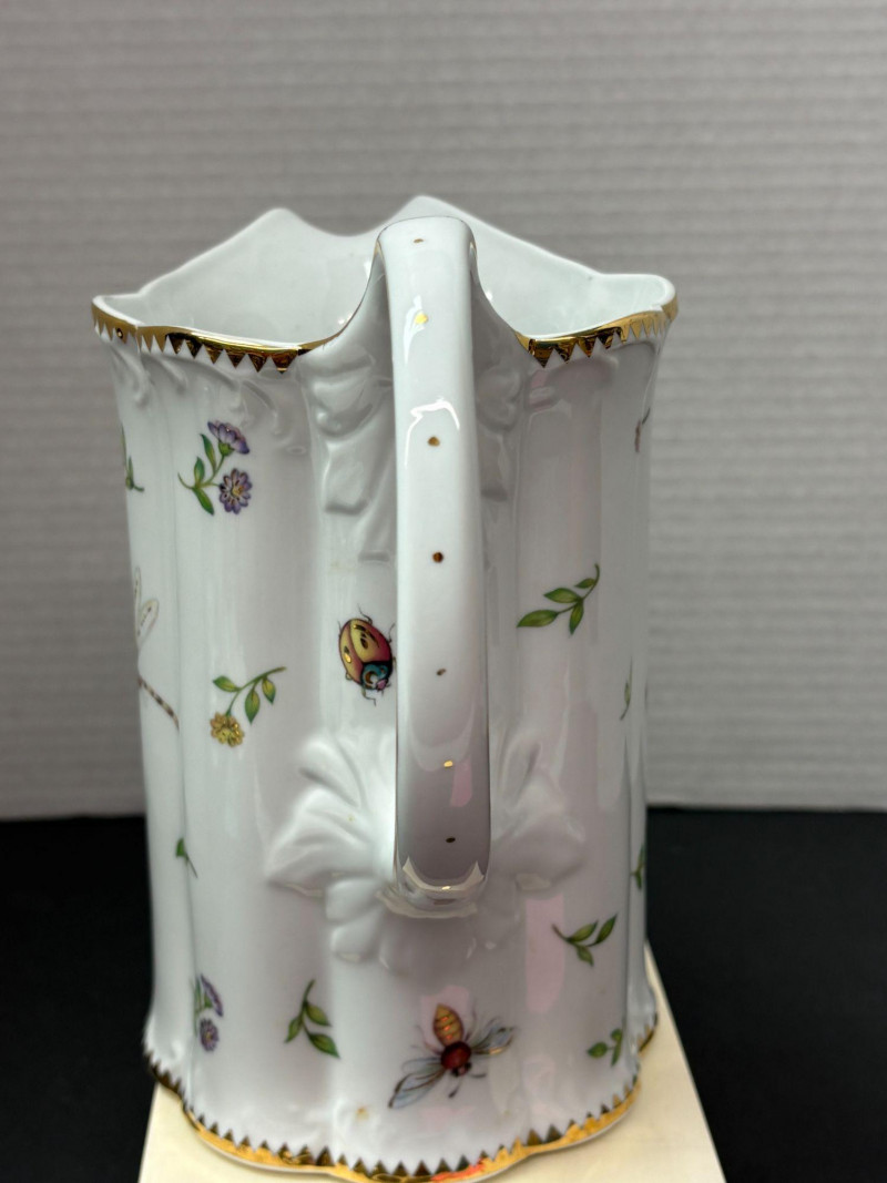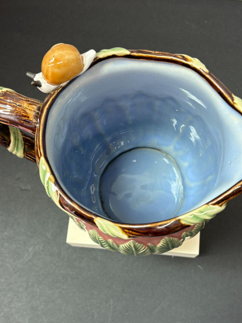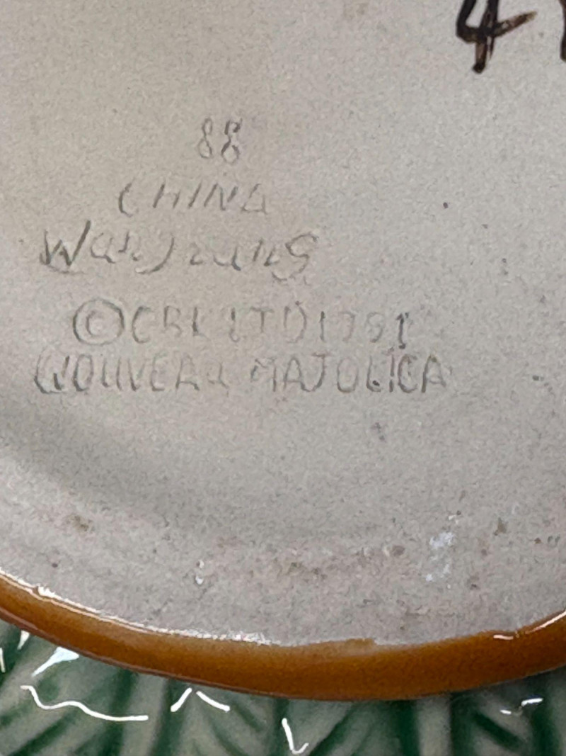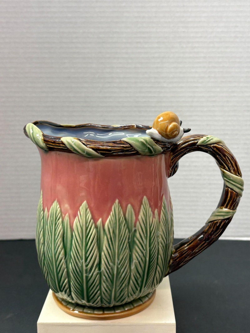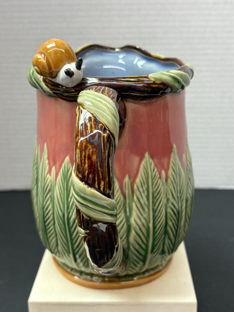 Richly detailed with raised florals and a graceful dragonfly motif, finished with elegant gold accents. A classic expression of Majolica’s warm, old‑world charm. Approx. 7" high × 8" wide.