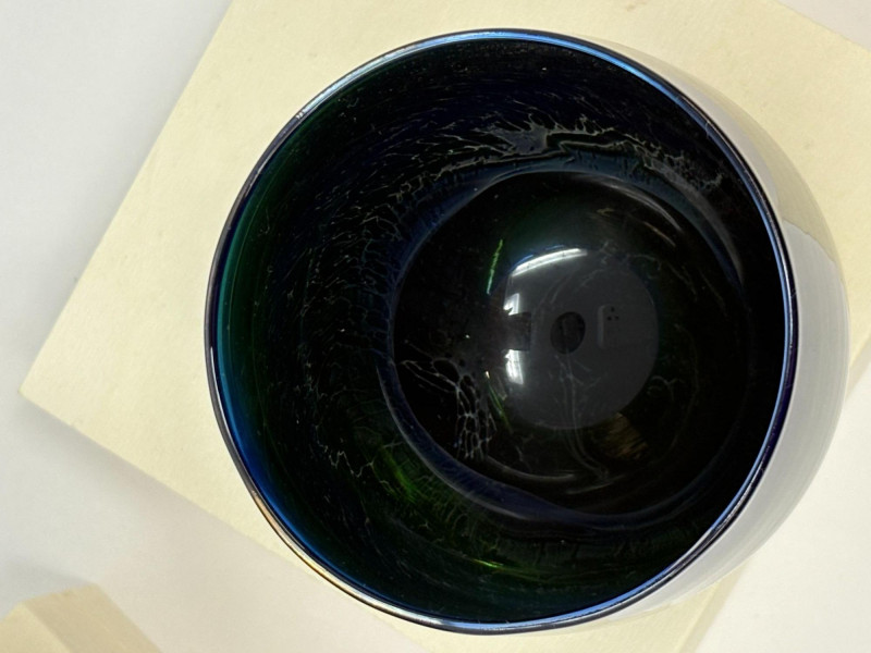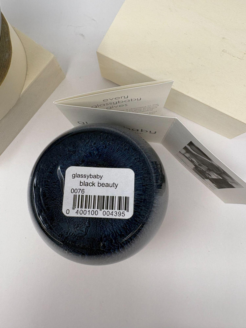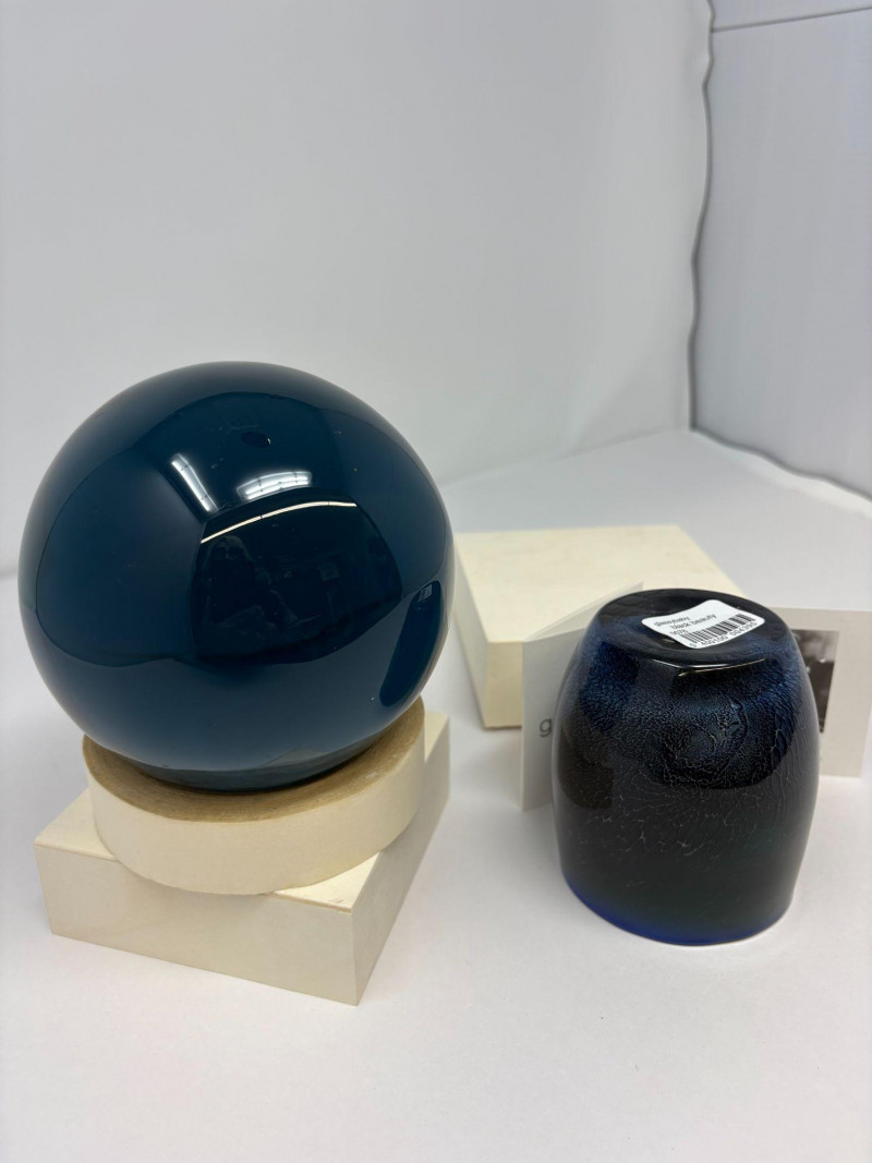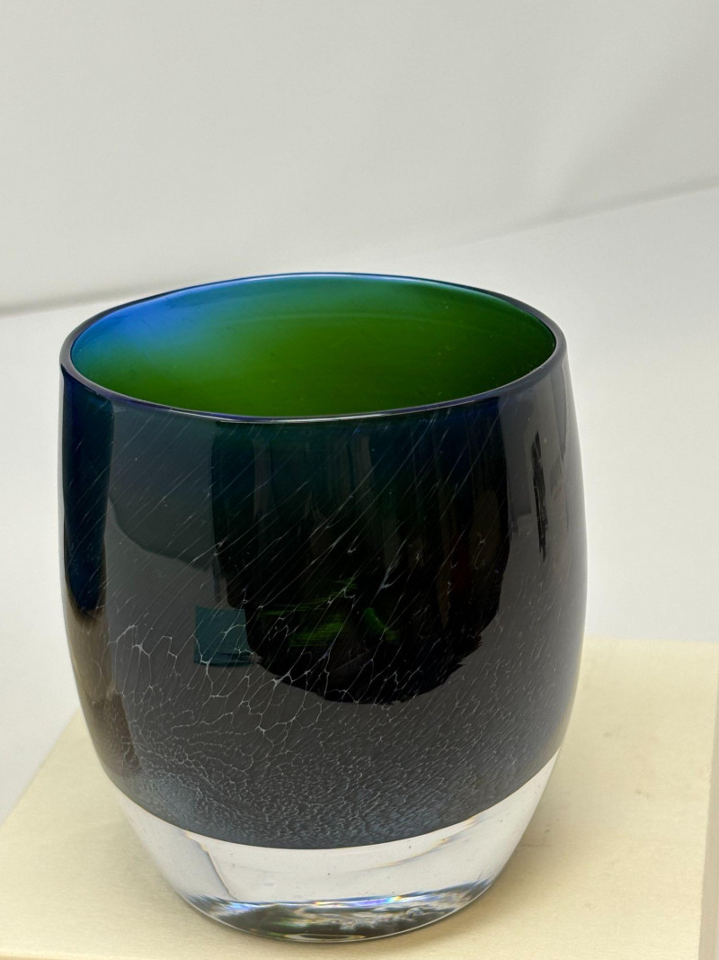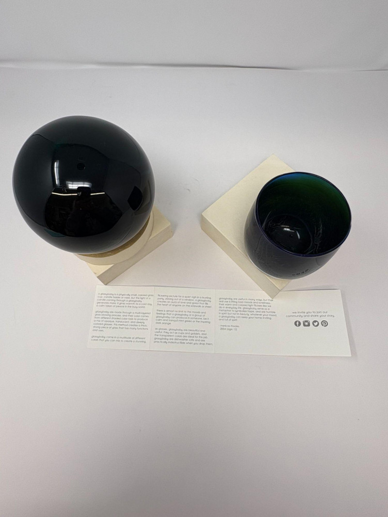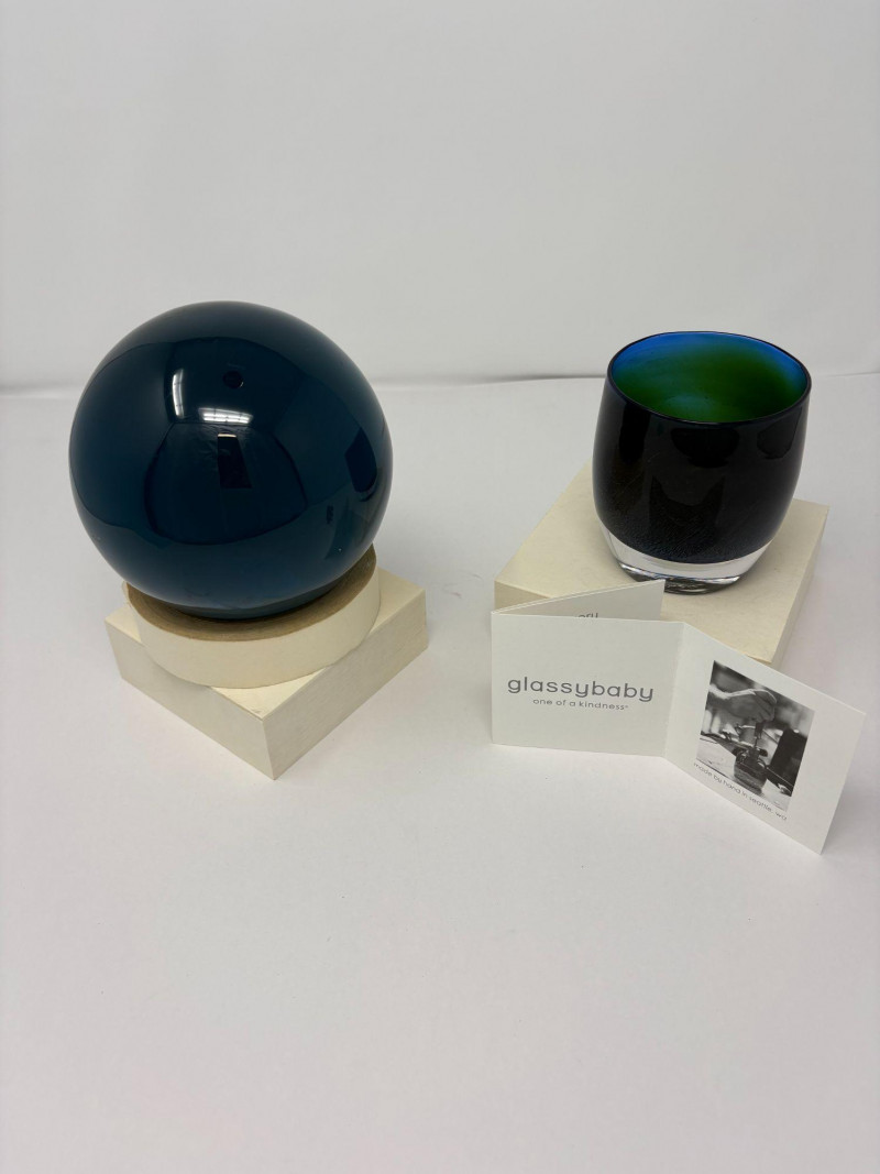 A two-piece glass art bundle featuring a 5" handblown teal glass orb and the highly collectible GlassyBaby “Black Beauty” votive (approx. 3.75"). The orb offers a luminous, ocean‑toned presence, while the votive’s deep green‑to‑black gradient embodies the cult‑favorite appeal GlassyBaby is known for in our region. Together, they create a sophisticated, modern display with strong collector interest and timeless visual harmony.
