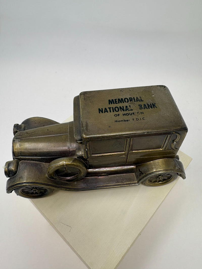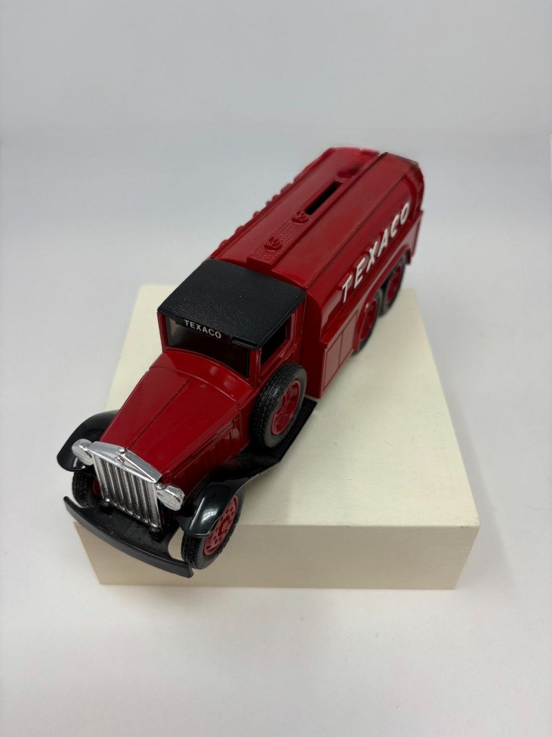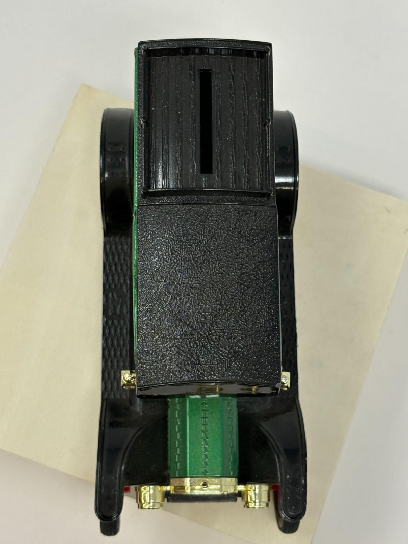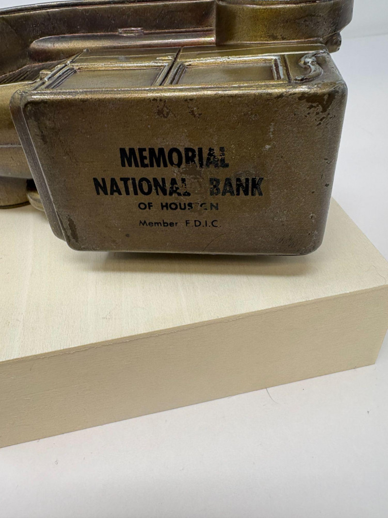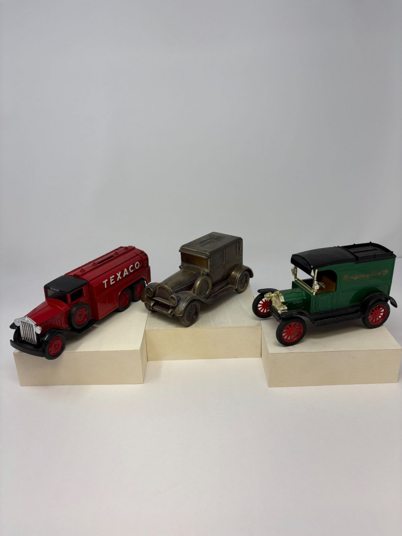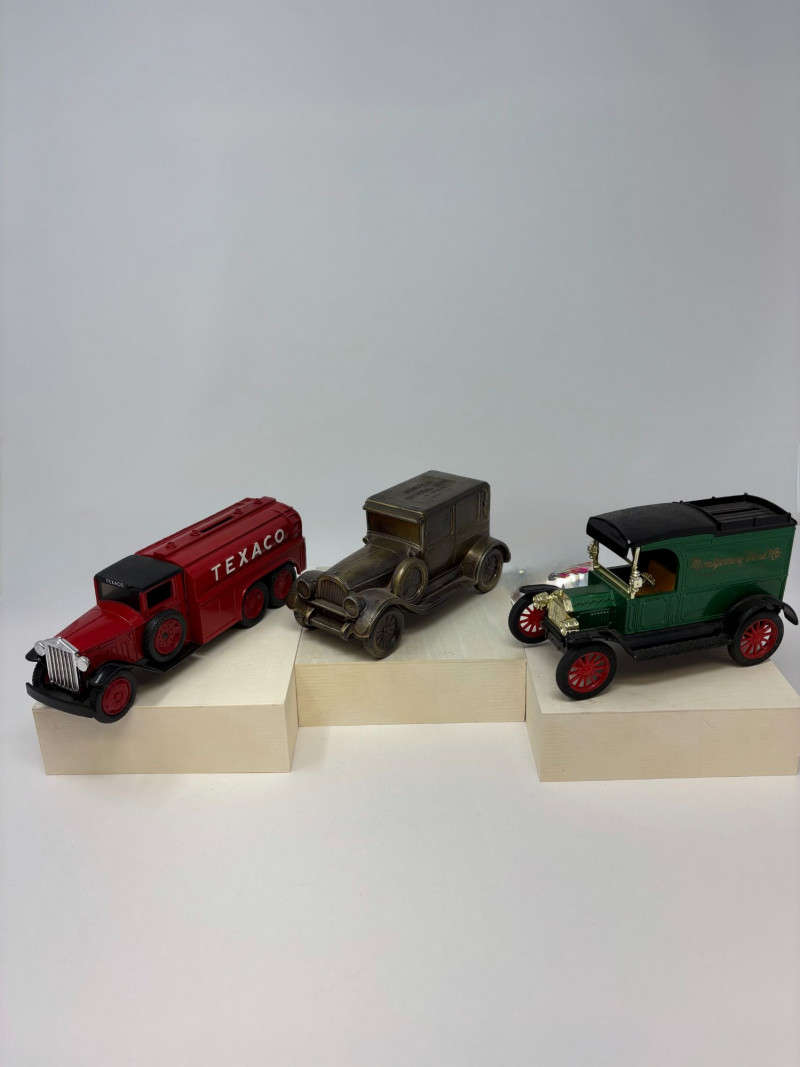 A refined ensemble of three cast iron banks, each a testament to early 20th-century craftsmanship and Americana charm. The Texaco tanker, finished in rich red with bold branding, evokes the golden age of roadside service. The National bank, compact and metallic, carries the patina of time with understated elegance. The Mechanical bank, a verdant green with ornate gold accents and vibrant red wheels, showcases whimsical engineering and collector-grade detail. This lot offers historical depth and sculptural appeal for the discerning collector. Measurements: Texaco: 1½ × 4 × 3 in National: 1½ × 3 × 3½ in Mechanical: 6½ × 3 × 3½ in