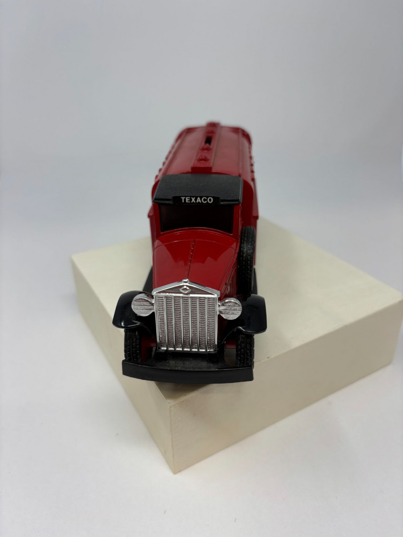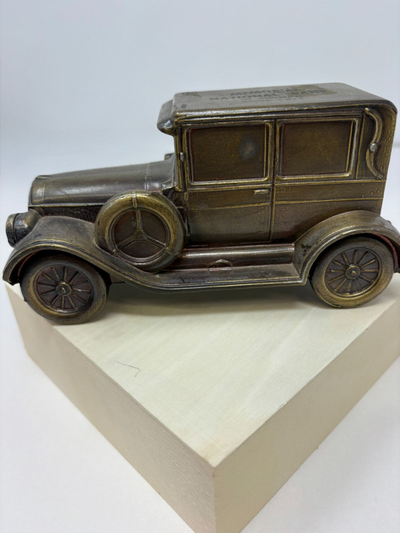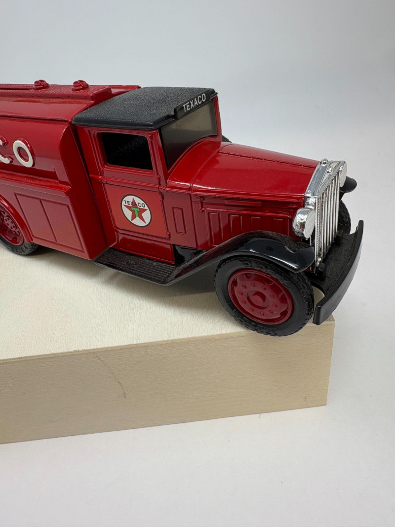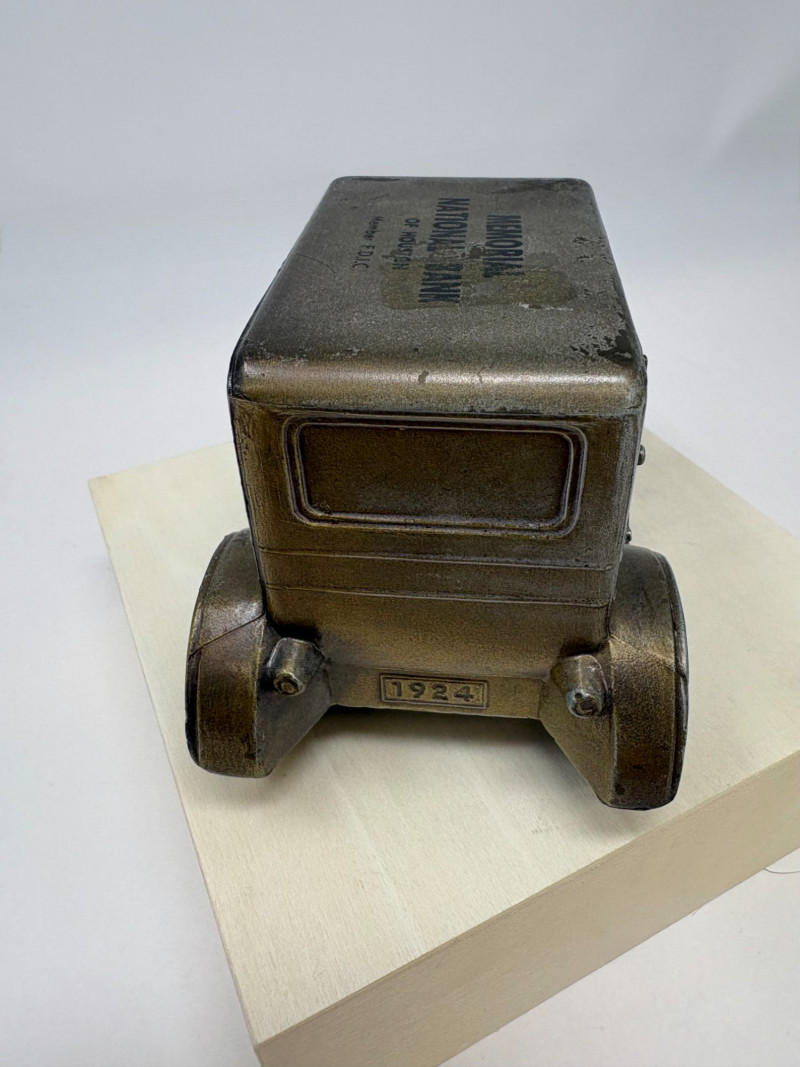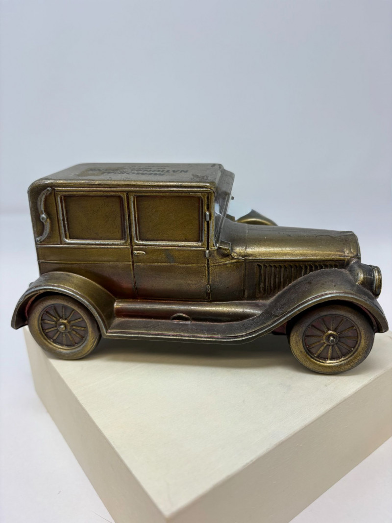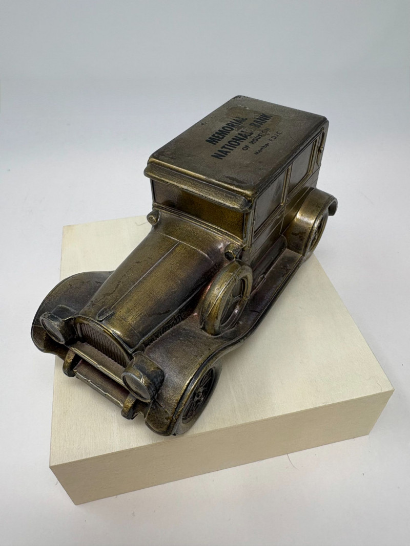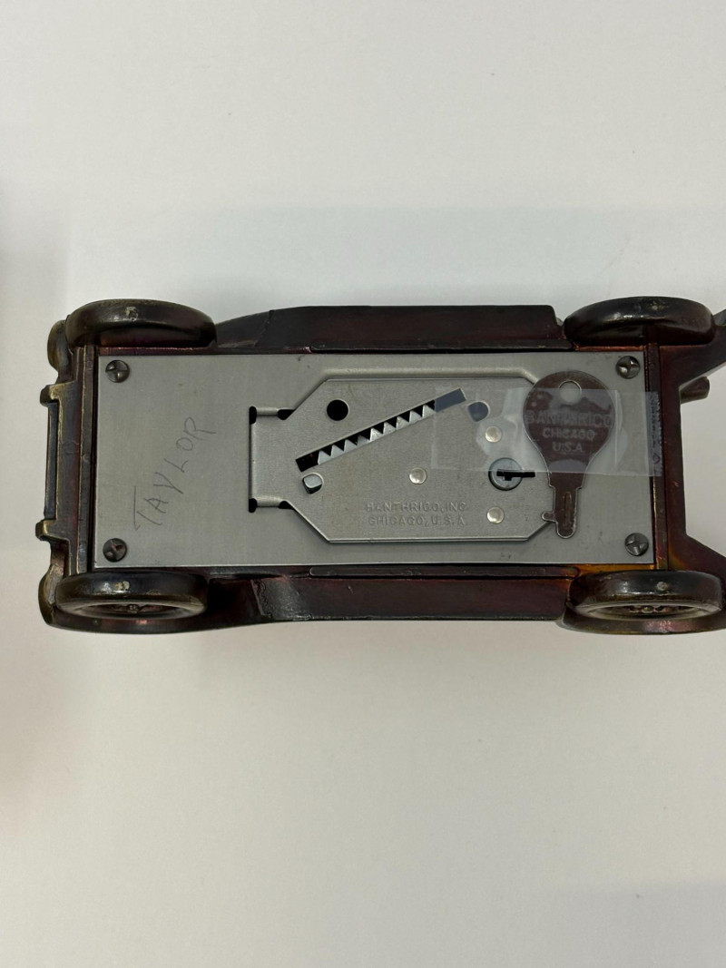 A refined ensemble of three cast iron banks, each a testament to early 20th-century craftsmanship and Americana charm. The Texaco tanker, finished in rich red with bold branding, evokes the golden age of roadside service. The National bank, compact and metallic, carries the patina of time with understated elegance. The Mechanical bank, a verdant green with ornate gold accents and vibrant red wheels, showcases whimsical engineering and collector-grade detail. This lot offers historical depth and sculptural appeal for the discerning collector. Measurements: Texaco: 1½ × 4 × 3 in National: 1½ × 3 × 3½ in Mechanical: 6½ × 3 × 3½ in
