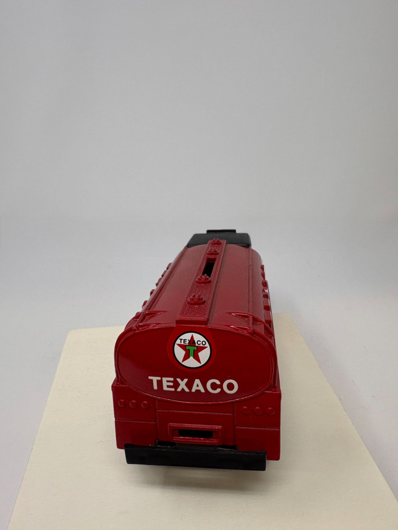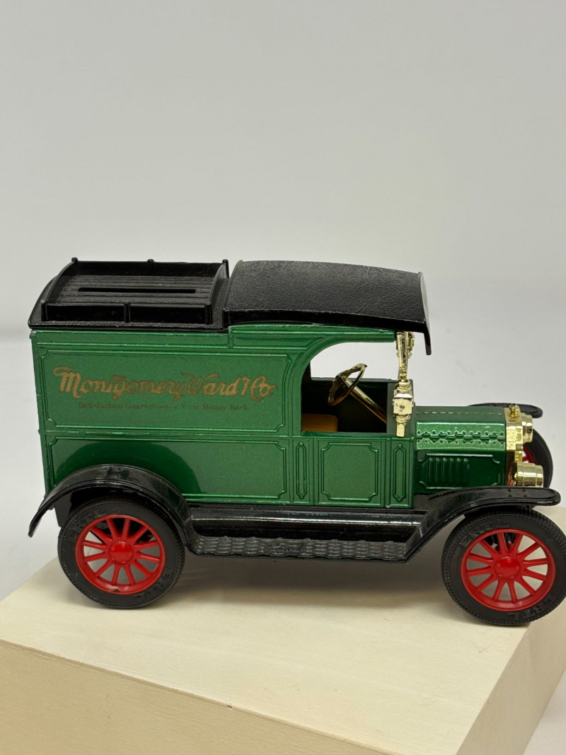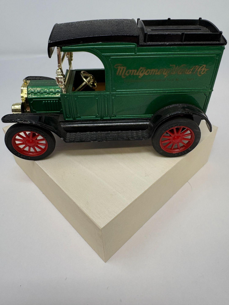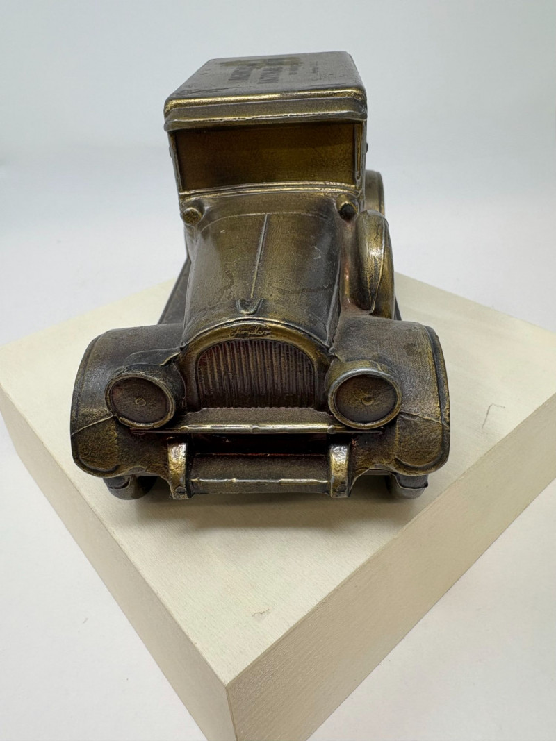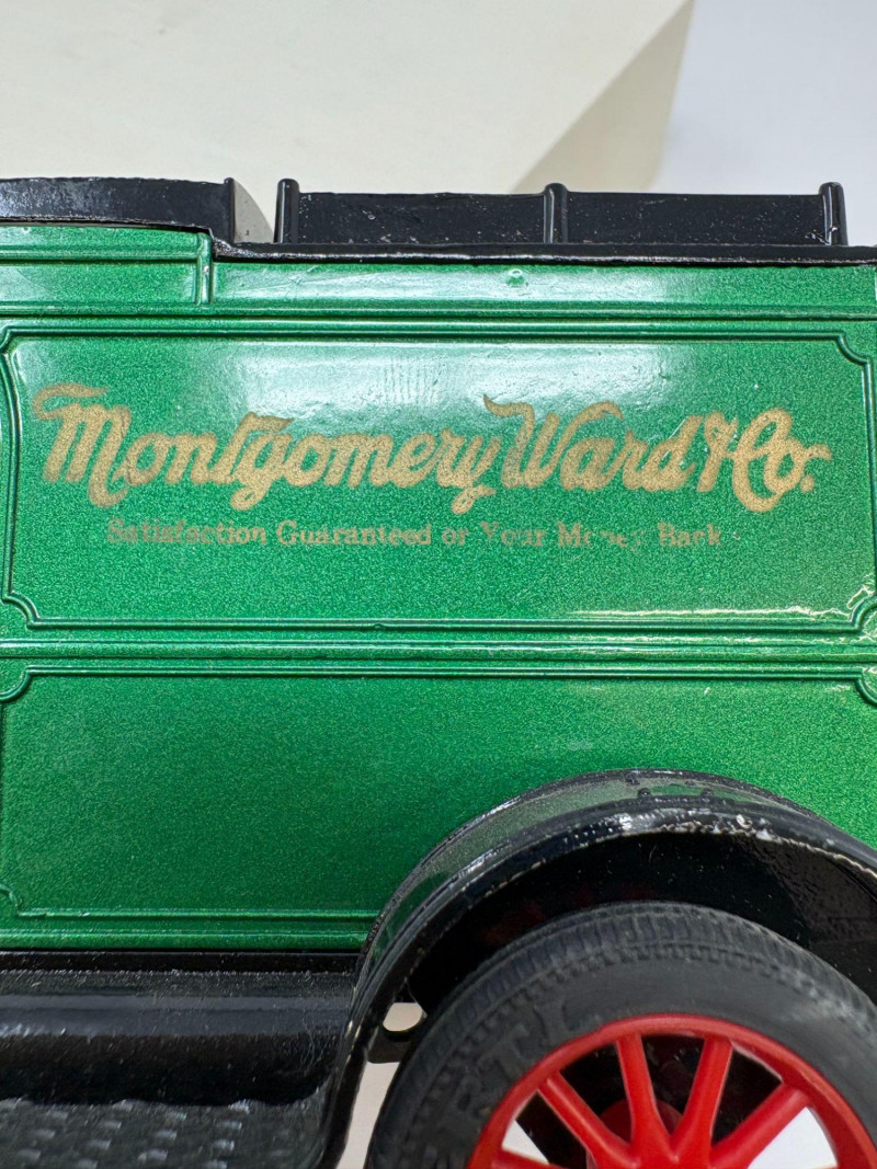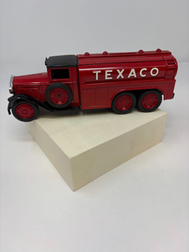 A refined ensemble of three cast iron banks, each a testament to early 20th-century craftsmanship and Americana charm. The Texaco tanker, finished in rich red with bold branding, evokes the golden age of roadside service. The National bank, compact and metallic, carries the patina of time with understated elegance. The Mechanical bank, a verdant green with ornate gold accents and vibrant red wheels, showcases whimsical engineering and collector-grade detail. This lot offers historical depth and sculptural appeal for the discerning collector. Measurements: Texaco: 1½ × 4 × 3 in National: 1½ × 3 × 3½ in Mechanical: 6½ × 3 × 3½ in