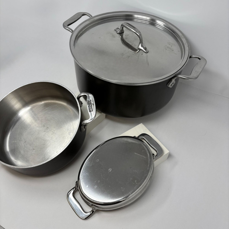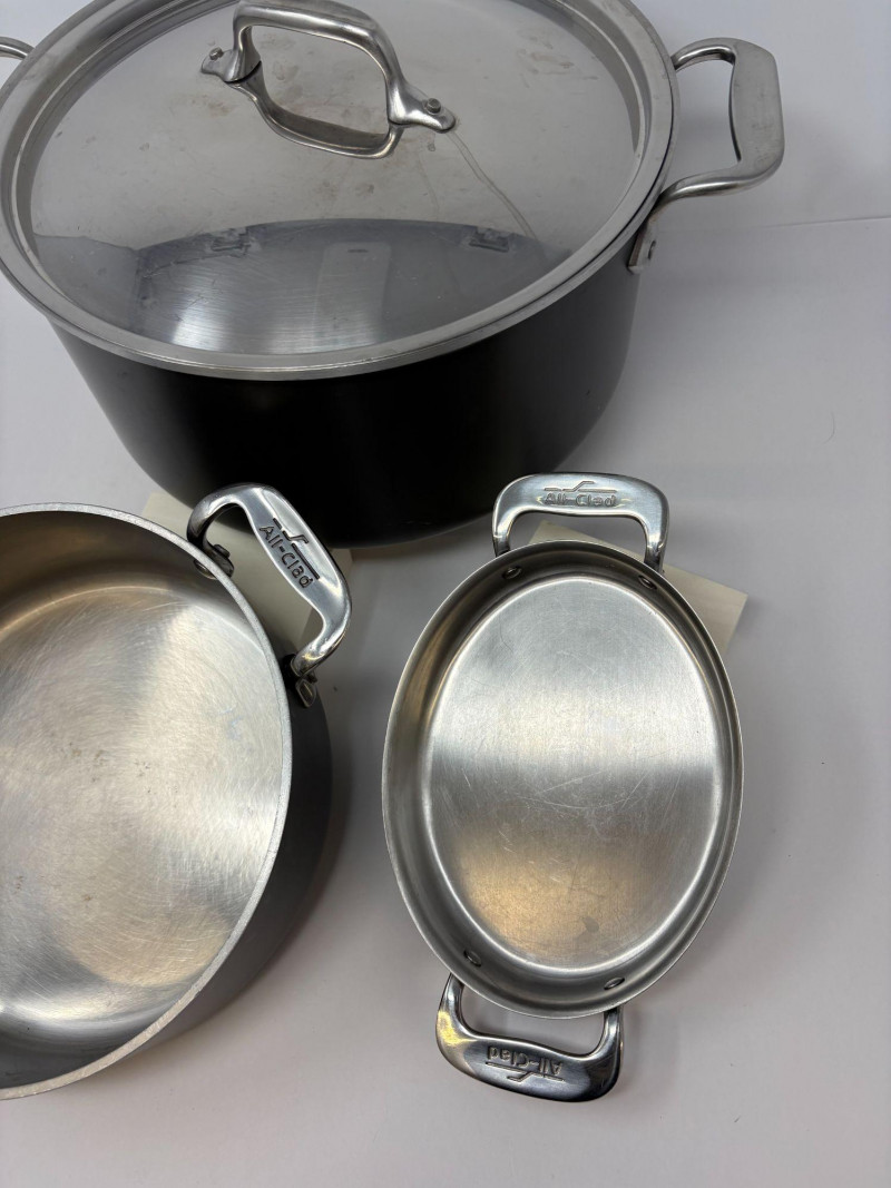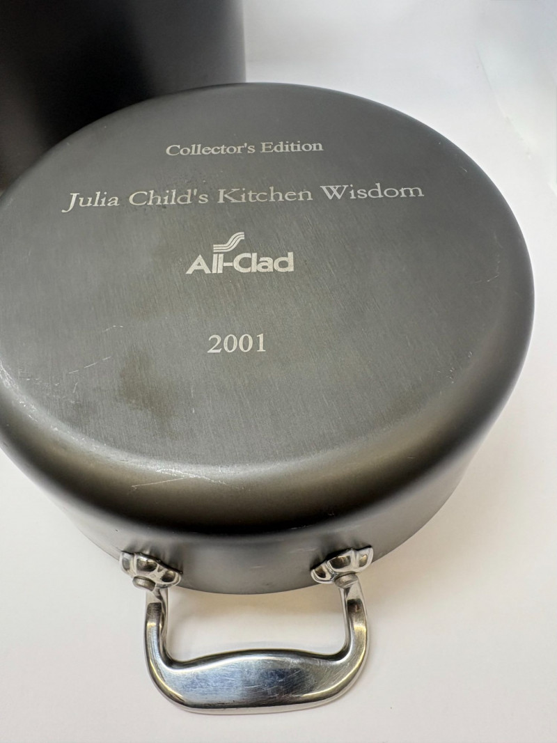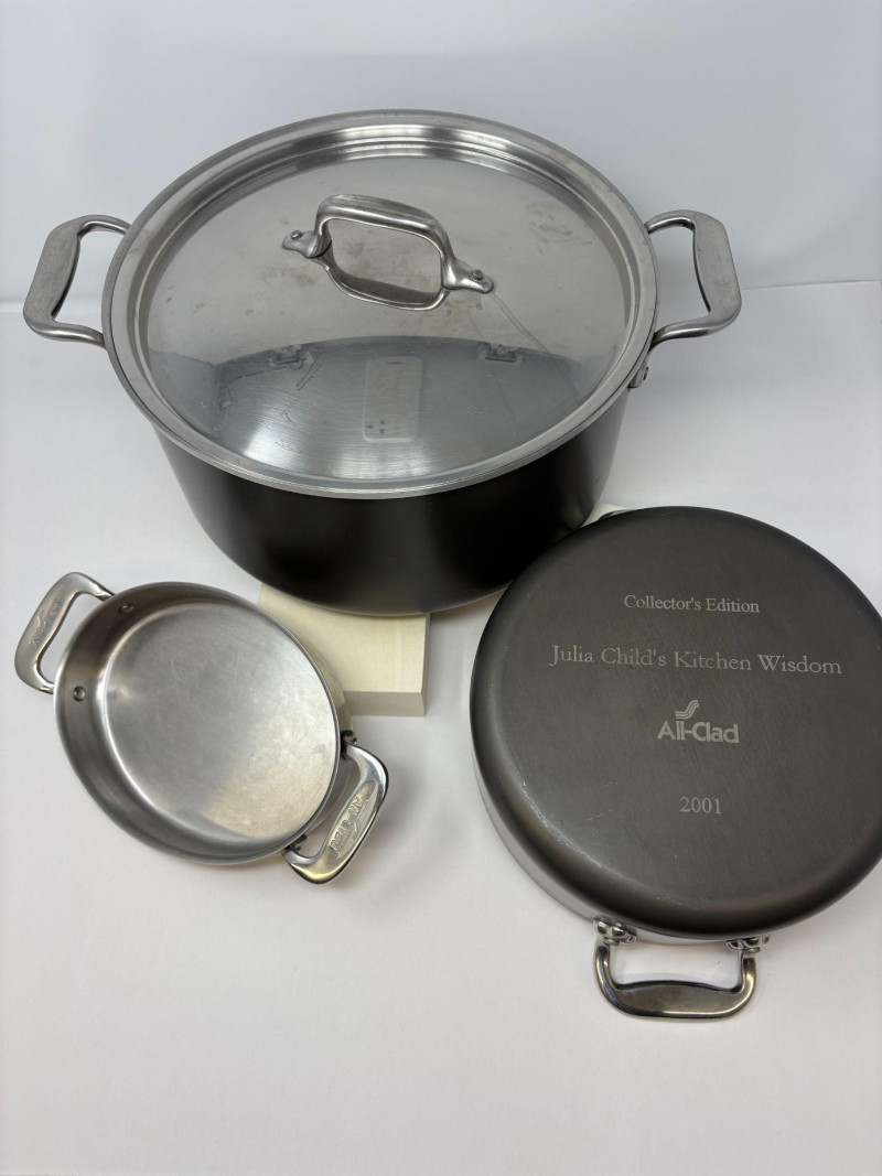 A rare opportunity to acquire an authenticated All‑Clad “Julia Child’s Kitchen” Collector’s Edition trio, released in 2001 to honor the culinary icon’s enduring legacy. This stainless‑steel set showcases All‑Clad’s renowned craftsmanship, elevated by the engraved commemorative lid marking its provenance. 10" diameter × 11" width × 5 ¾" height Collector’s Edition Julia Child’s Kitchen All‑Clad 2001”. A versatile, heirloom‑quality vessel ideal for soups, stocks, and classic French preparations. 2-quart stainless steel casserole pan or stock pot. This limited-edition item highlights Julia Child's essential cooking techniques and is a sought-after, branded collectible. Diameter: 8" Height: 4" ALL CLAD Mini Oval Baker Pan Au Gratin 7": A charming, multi‑use piece for gratins, individual casseroles, or elegant table presentation. Made from high quality 18 and 10 heavy-gauge stainless steel for even heating and maximum durability. Diameter: 7" Height 2" Width 5"