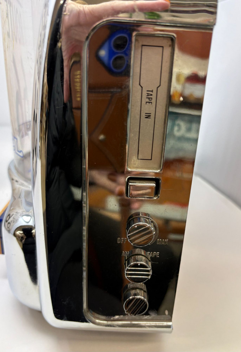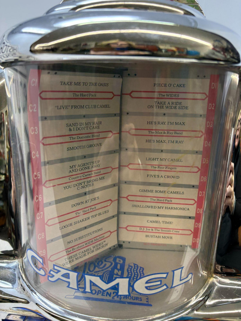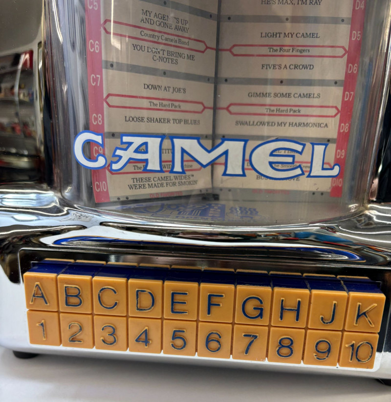 A cool duo, celebrating the golden age of American travel culture, this lot pairs a chrome-like finished Camel Ciarettes jukebox radio (12" W × 13.5" H × 6.5" D) with a bold 16" × 15" Route 66 shield. Together they create a striking, display‑ready vignette of mid‑century nostalgia and branded Americana. Ideal for collectors seeking distinctive statement pieces with authentic roadside charm and polished visual impact.