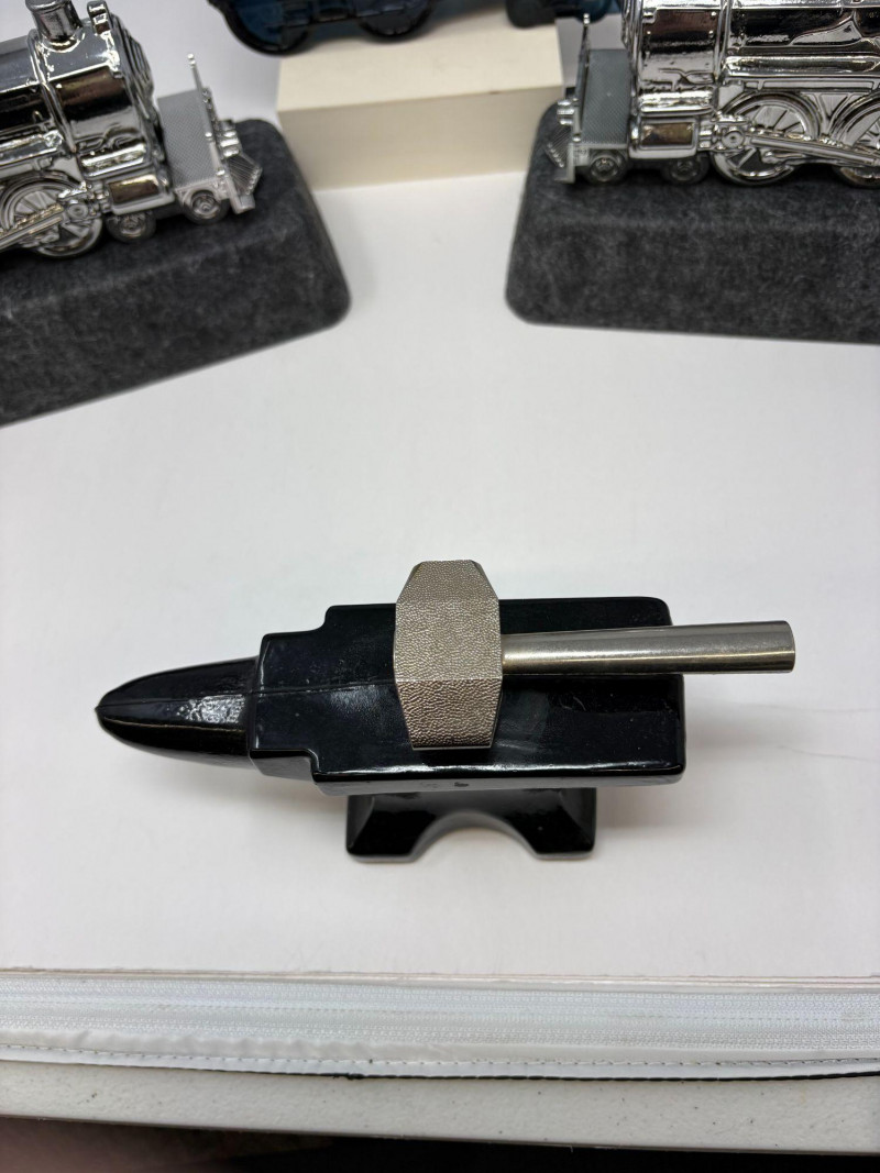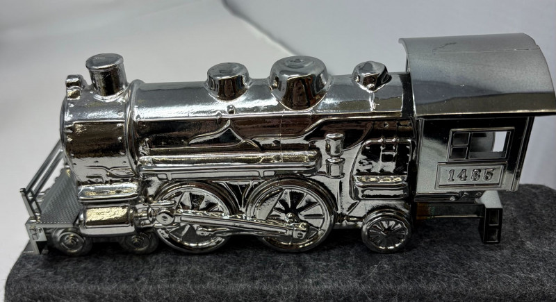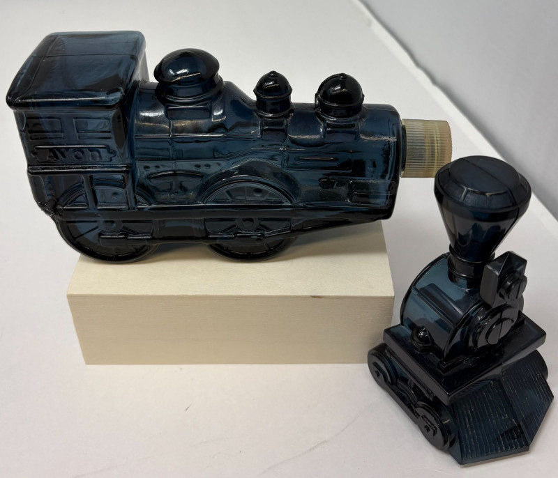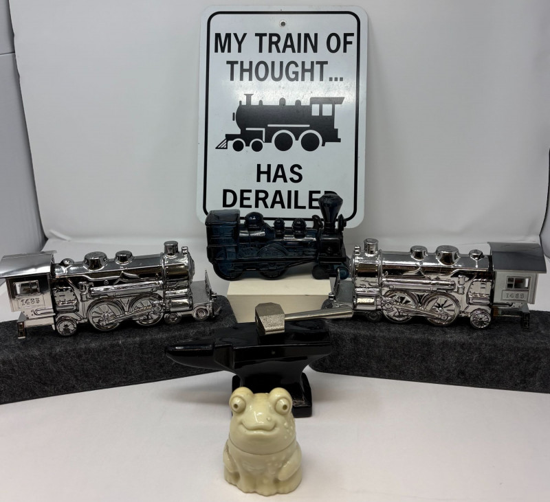 Celebrate the golden age of novelty fragrance design with this rare Avon collector’s trio, featuring two gleaming silver-tone train decanters filled with Deep Woods and a striking black locomotive in Wild Country. Each sculptural bottle is precision-molded with vintage rail detailing, with a sense of movement, masculinity, and mid-century charm. The ensemble is anchored by a miniature blacksmith’s anvil and accented with a whimsical frog figurine—adding a touch of humor and personality to the display. Train bottles approx. 6–7" length; anvil approx. 3" wide