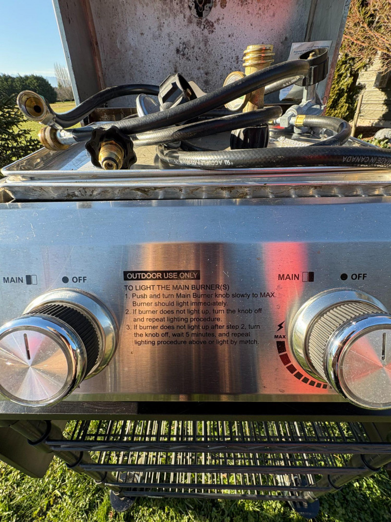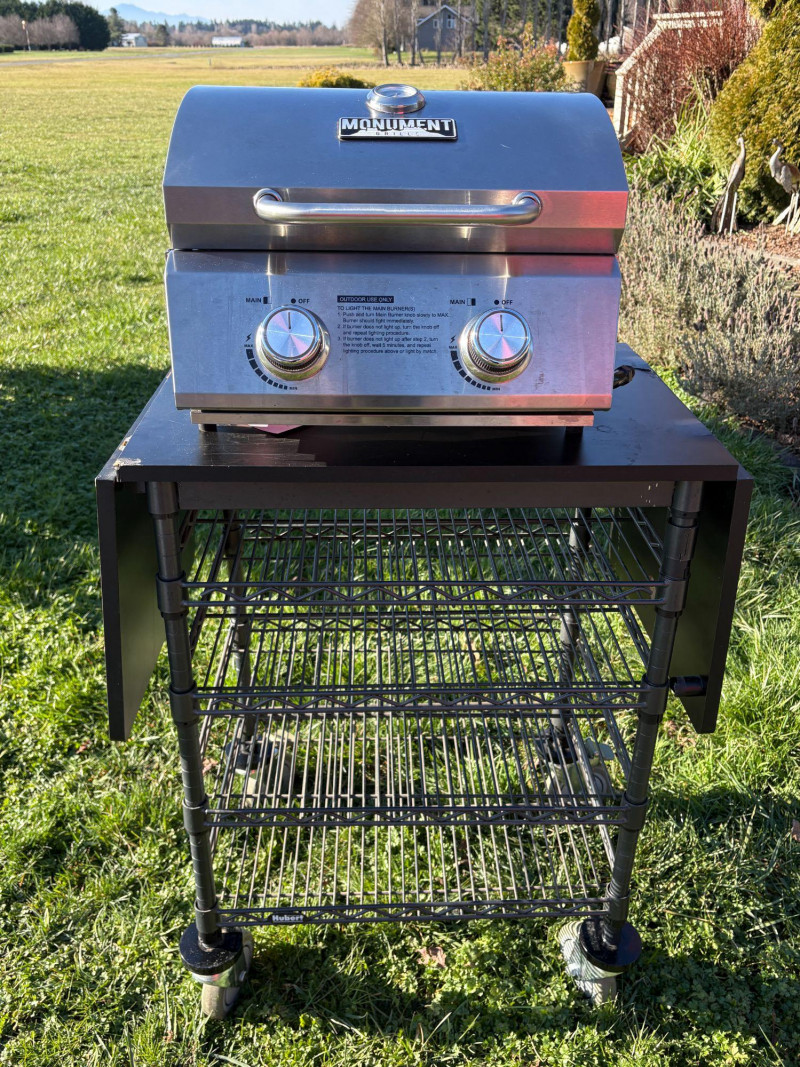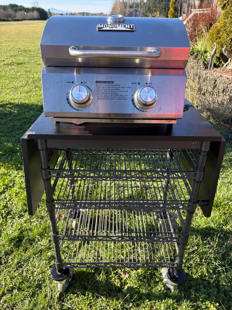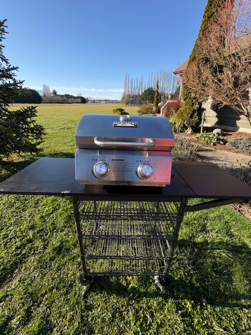Compact Monument stainless steel tabletop gas grill featuring dual burner controls with clearly marked heat settings and an integrated safety‑instruction panel. Durable stainless construction with a hinged lid and lower wire shelf for accessory storage. Ideal for patios, camping, tailgating, and portable outdoor cooking. Condition: Good overall condition with normal outdoor use wear. Clean control panel and intact wire shelf. Untested for fuel ignition. New units retail $179–$219, *Please note slight damage on stand.