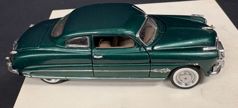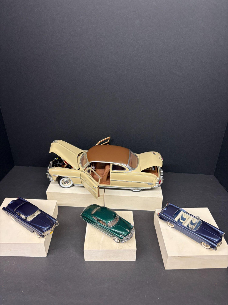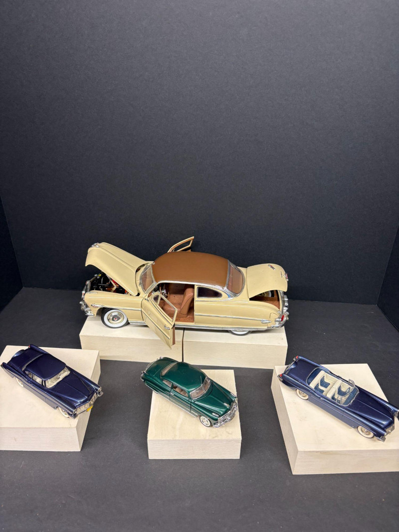 This lot includes a beautifully detailed 1950s two‑tone Hudson sedan with opening panels and a fully rendered engine bay, along with a smaller Hudson companion and two Lincoln Continental models. Daimler Chrysler 2002 Die- Cast marking. on the large Huson. Both Lincolns are stamped Brooklin Models, Made on England. The green Hudson is an unknown maker. Together, the collection offers a sophisticated blend die‑cast artistry — ideal for the automotive enthusiast or vintage model collector. Hudson: 12" long x 4" wide 3 smaller cars: 5" long x 1.5 wide
