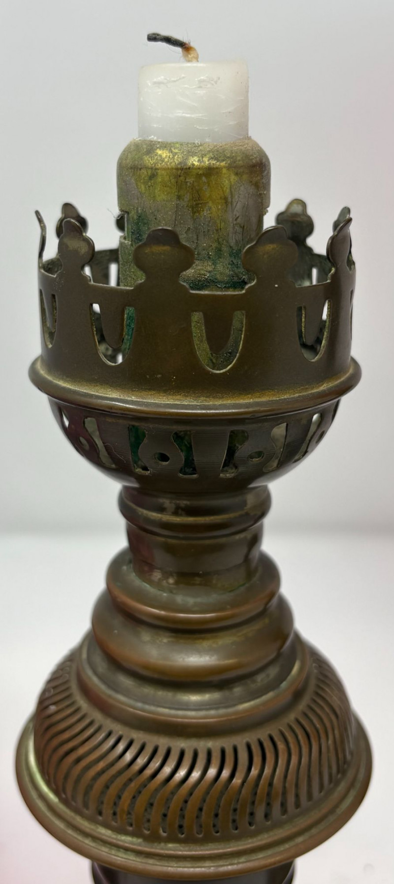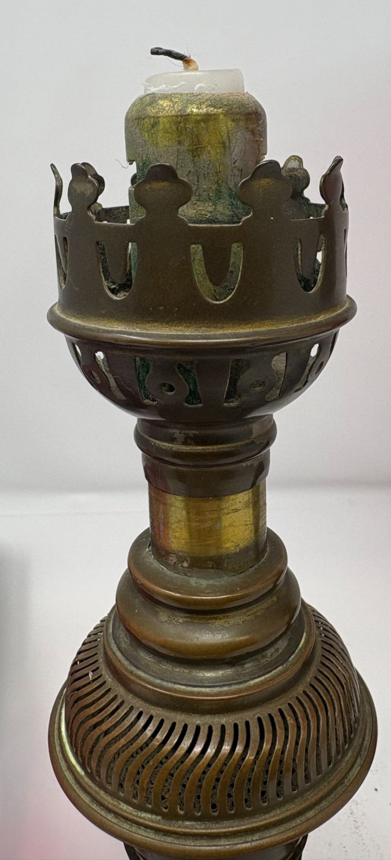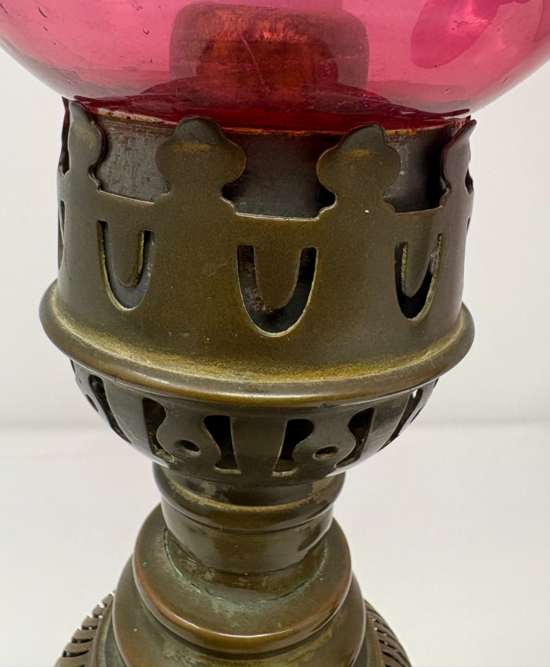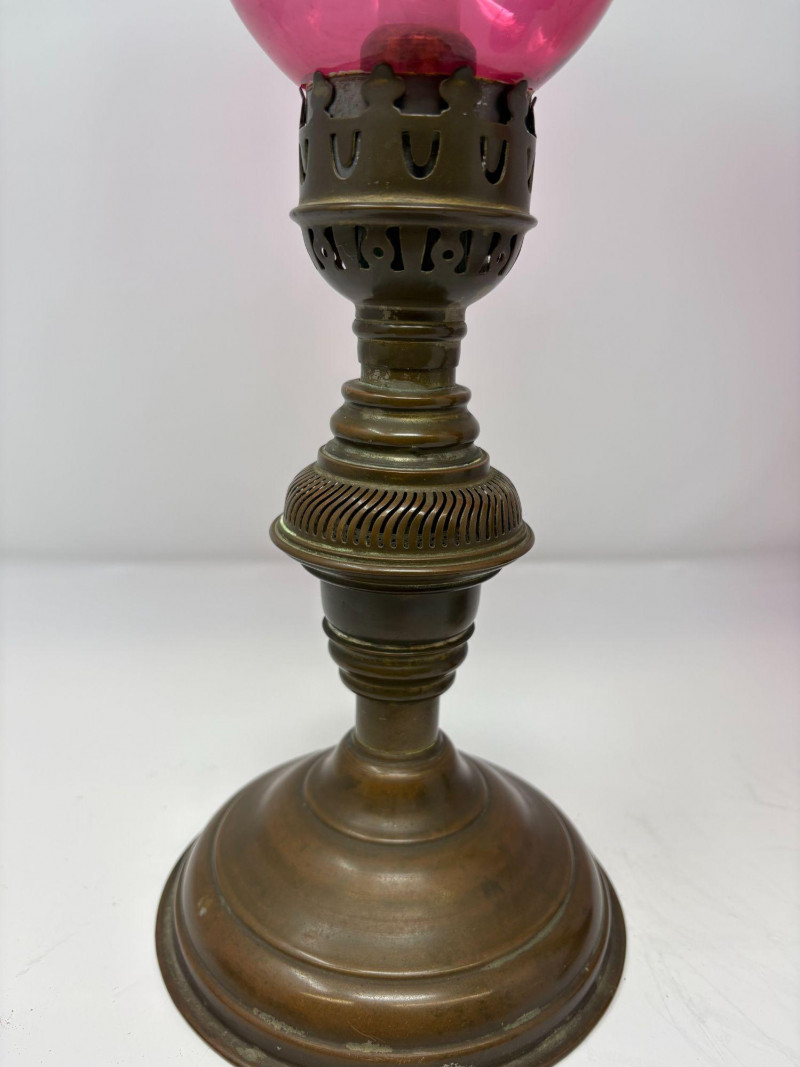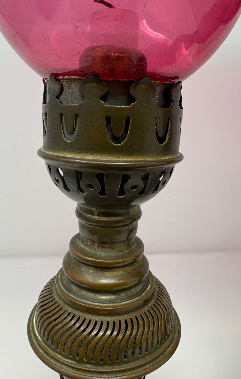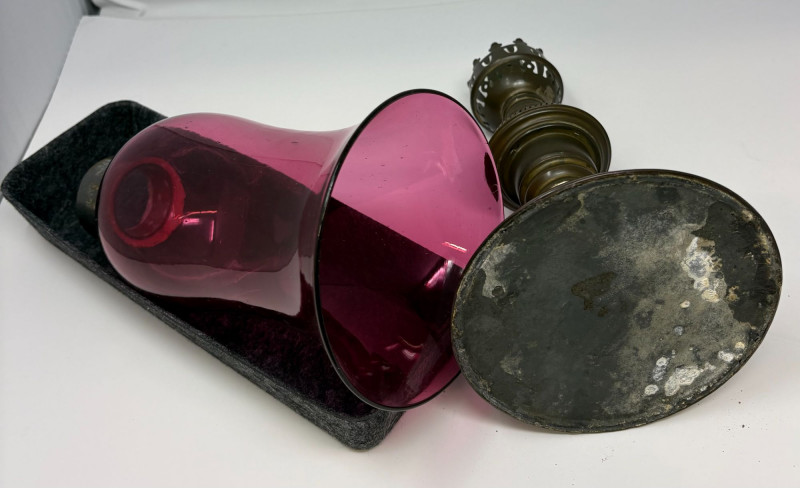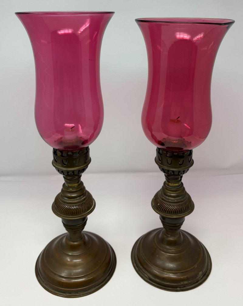 A striking pair of antique hurricane lamps featuring rich ruby glass shades and ornate brass bases. Each stands 16" tall with 6" wide glass, blending Victorian elegance with timeless charm—ideal for refined interiors or collectors.