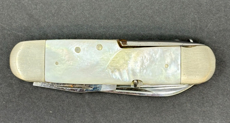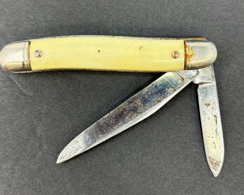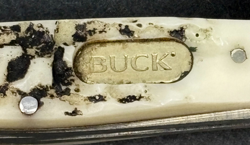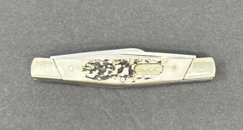 Petite folder with milky celluloid scales; handwritten card notes “Barlade.”1. Buck 309 – Two‑Blade Folder