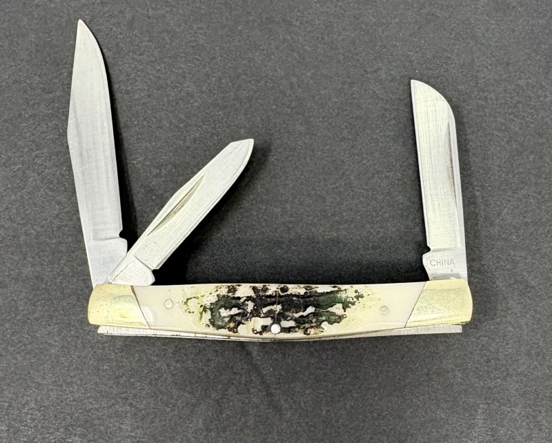 Three‑blade Stockman pattern in classic Staglon; brass liners and strong snap. Approx. 3½" closed.