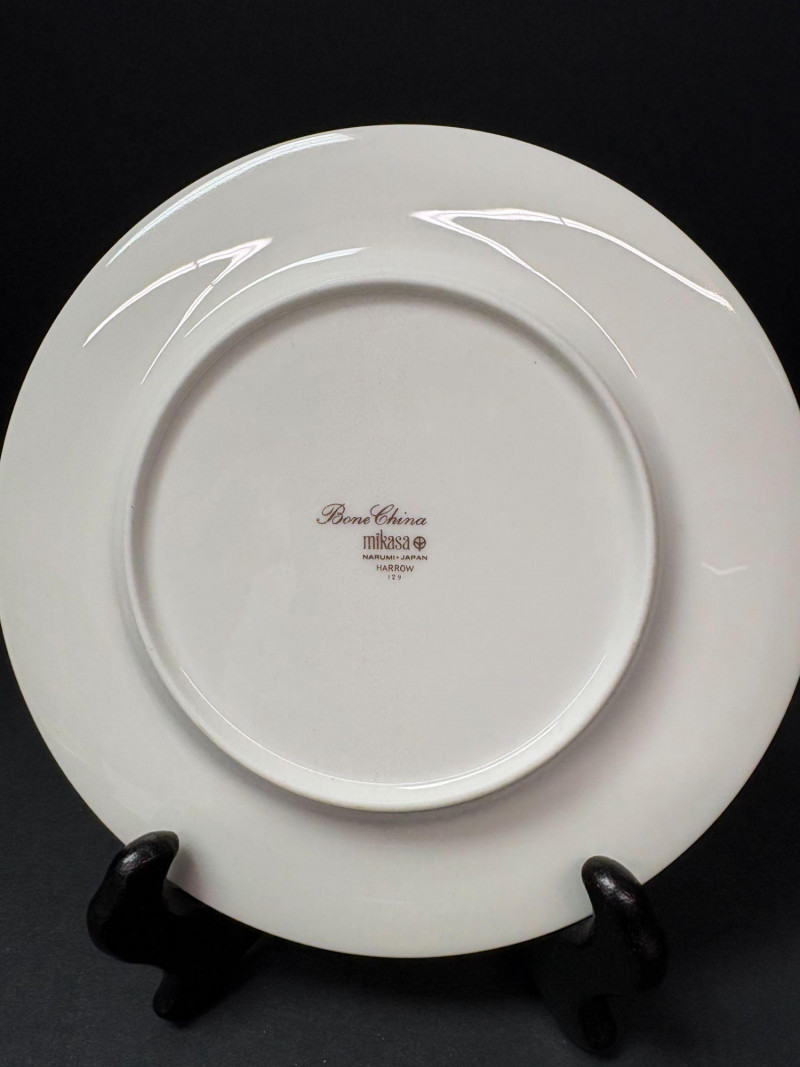 Backstamp: Bone China • Mikasa • Made in JapanPiece Type Quantity Size Dinner Plates 4 approx. 10½ in Salad/Dessert Plates 4 approx. 8 in Teacups 4 standard teacup size Saucers 4 approx. 6 in Mikasa “Harrow” A1‑129 – Replacements.com Pricing
