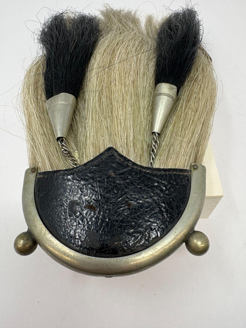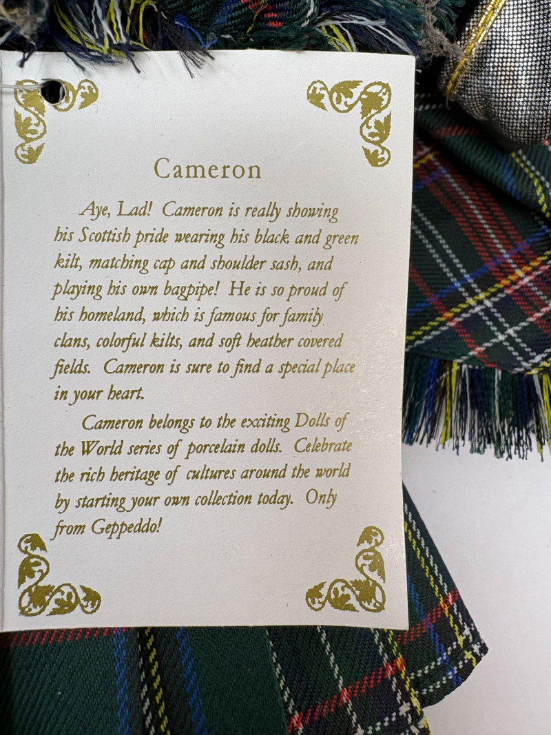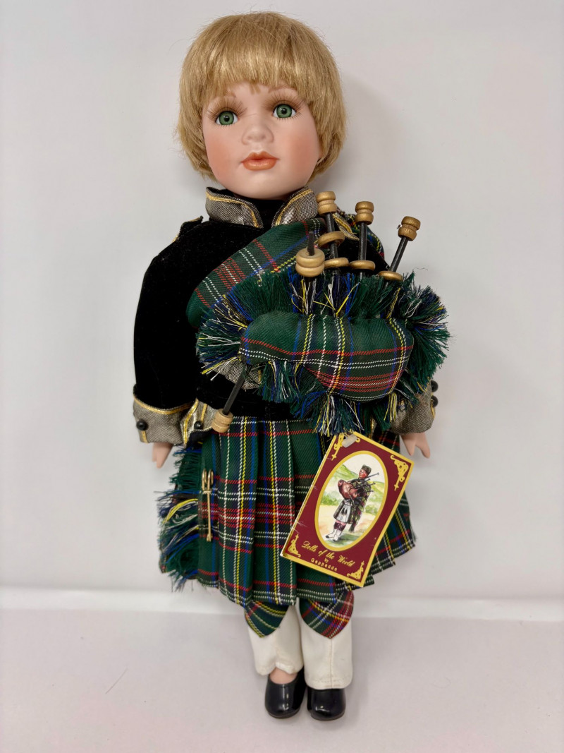 This Child’s Horsehair Sporran and Cameron‑dressed Highland Doll make a charming set that highlights classic Scottish tradition. The child‑sized sporran features a traditional horsehair design with simple metal accents, while the doll is dressed in full Cameron tartan with neatly crafted miniature details. This pair offers an easy, authentic way to celebrate Highland style. Sporran measures 11" Long; Scottish Doll is 16"Tall