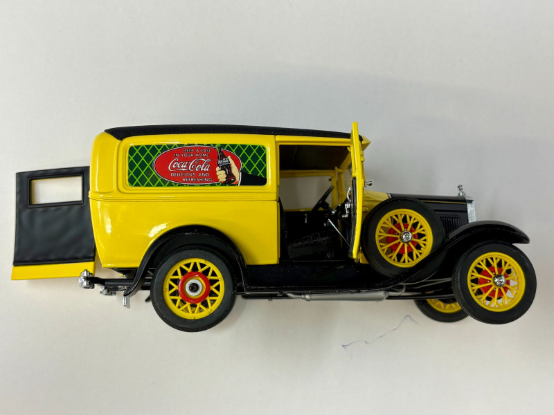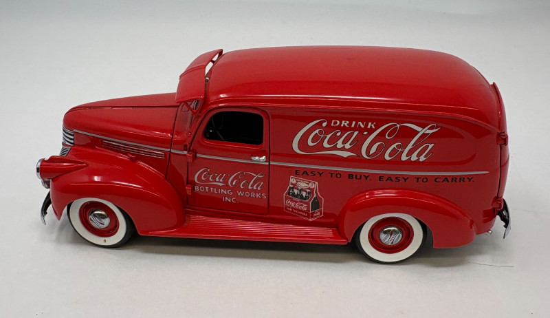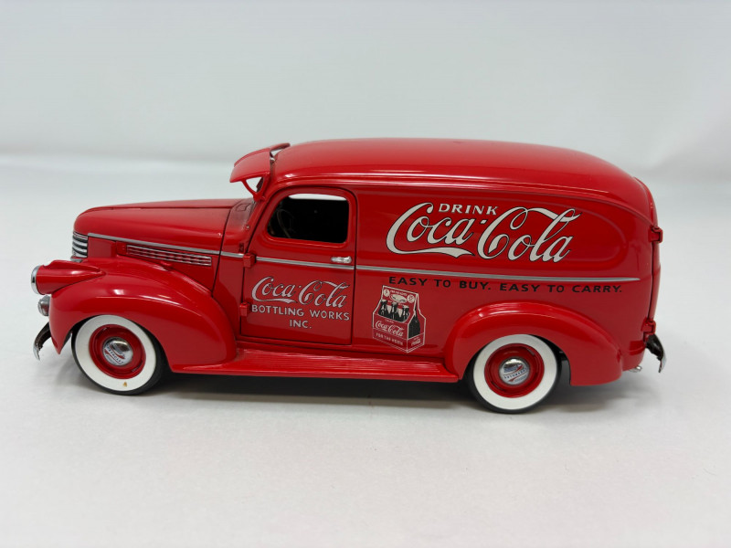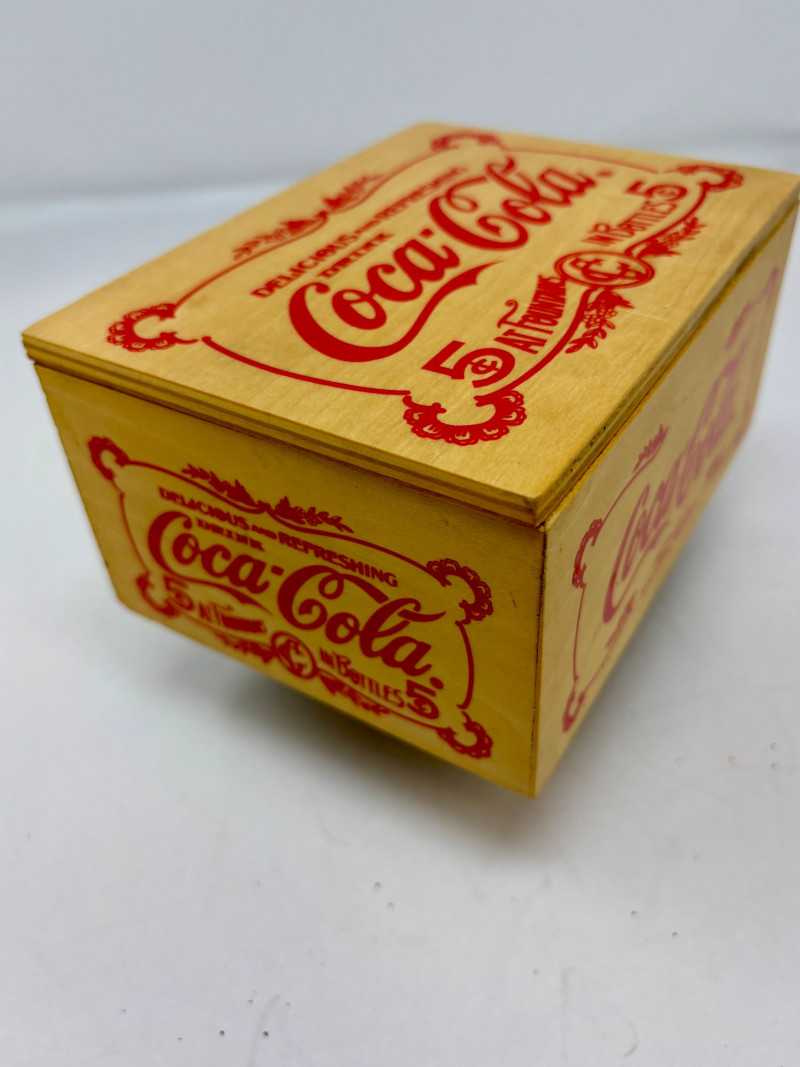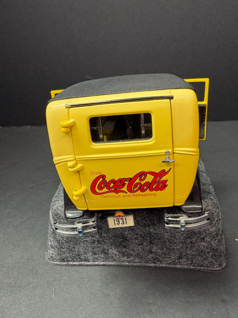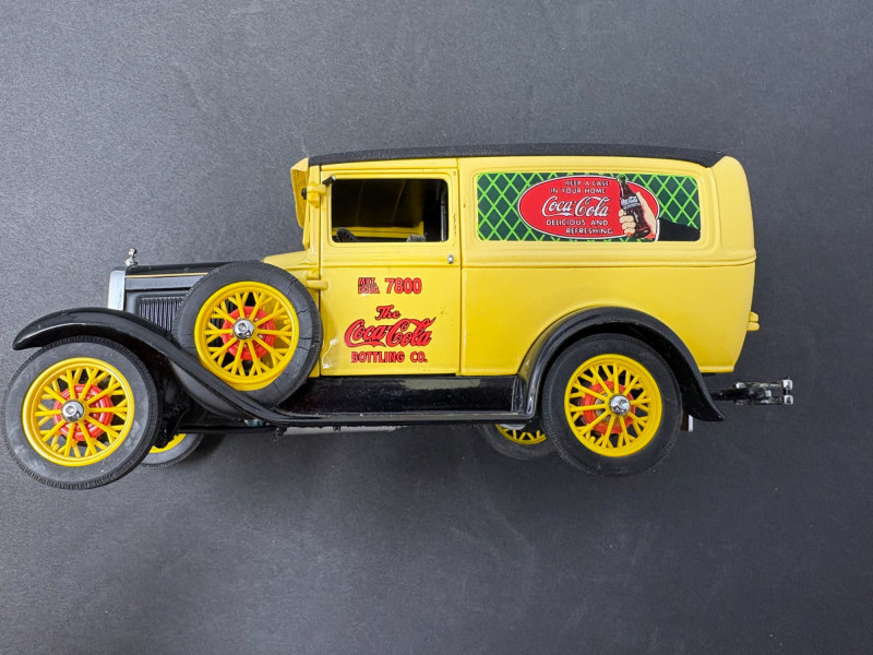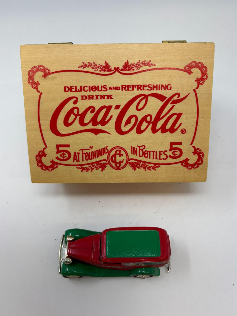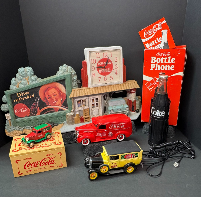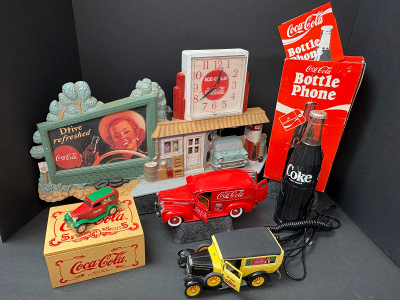 A vibrant, display‑ready ensemble celebrating Coca‑Cola’s most charming mid‑century and promotional designs. Anchored by the iconic Coca‑Cola Bottle Phone with original packaging and inserts, this lot also includes miniature delivery trucks with classic Coke crates, and a nostalgic storefront‑style display piece. Together, they form a cohesive, highly collectible vignette. Clock 21" L x 11.5" H; Phone 10" H x 3.5" D; Red Delivery Truck 8" L x 3" H x 3" W; Red/Green Delivery Truck 4"L x 1.5" H x 1.5" W; Yellow Delivery Truck 6.5" L x 3" H x 2.5" W; Coke Box 6" L x 4.5" W x #" H