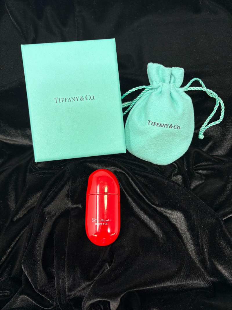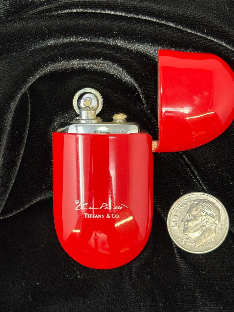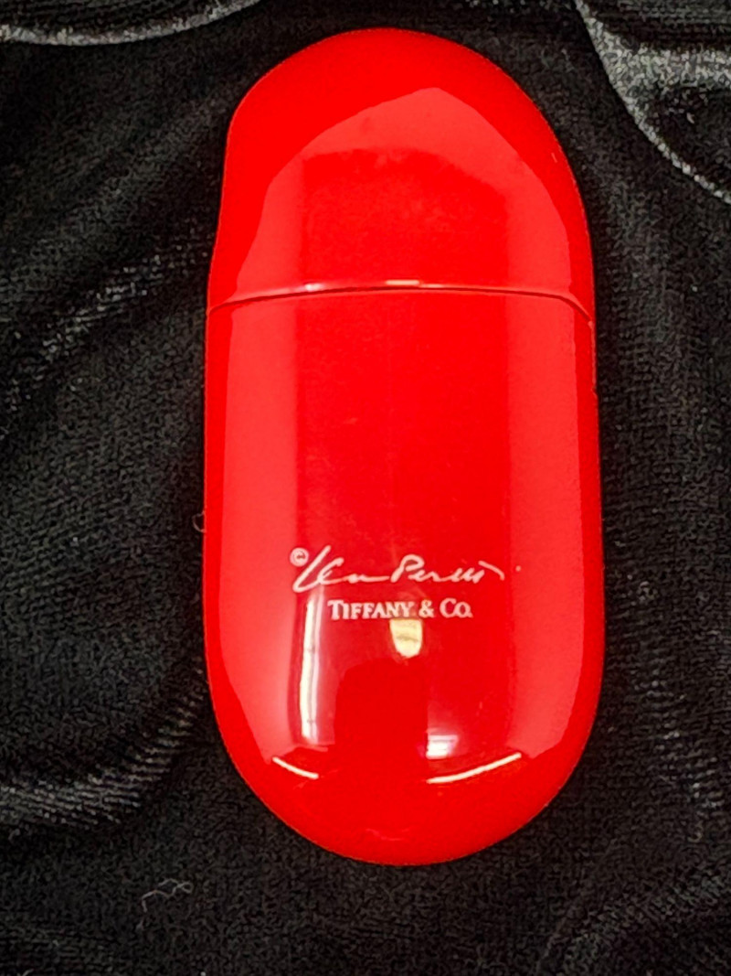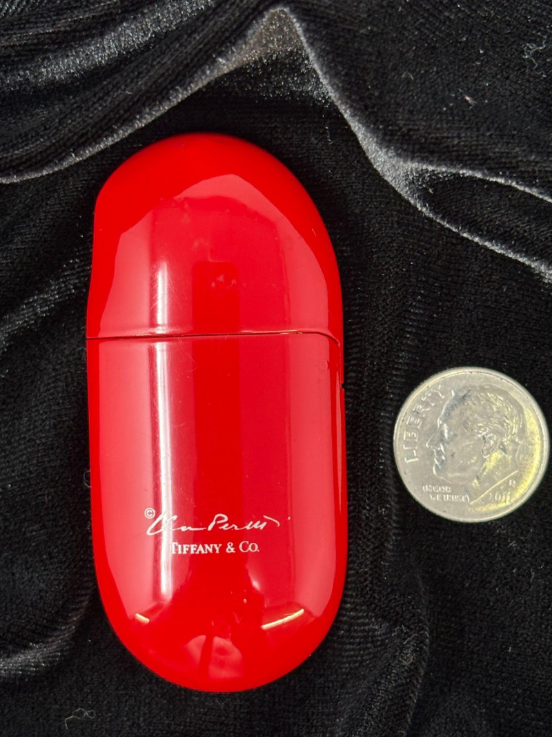 A sleek, bean shaped cigarette lighter designed by Elsa Peritti for Tiffany & Co, in a vivid red finish, designed with a compact flint‑wheel mechanism that reveals itself when the capsule separates. Its smooth silhouette and miniature scale give it the feel of a mid‑century novelty piece, ideal for collectors of unique lighters. Elsa Peretti's influence is so significant that Vogue once described her as “arguably the most successful woman ever to work in the jewelry field.”