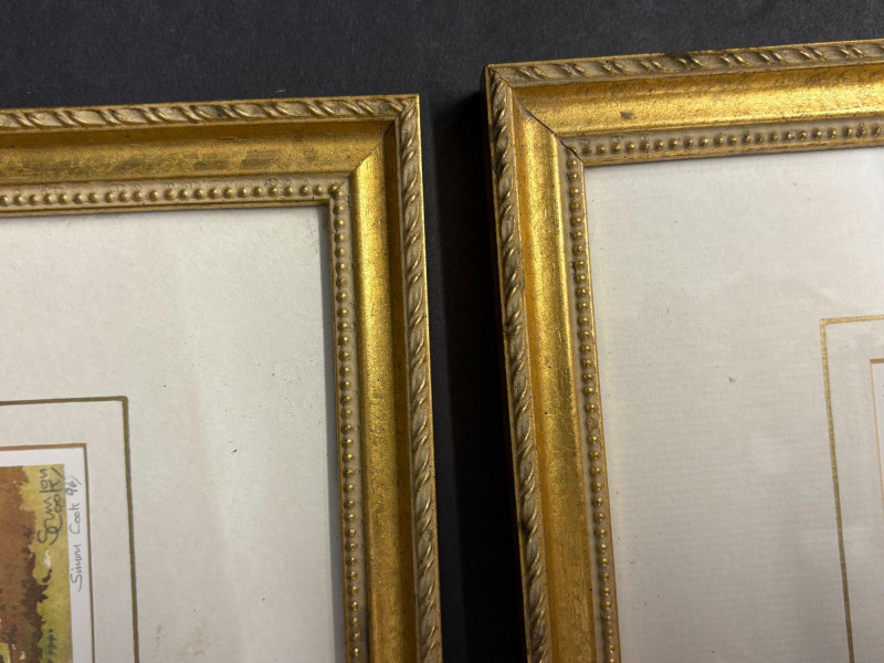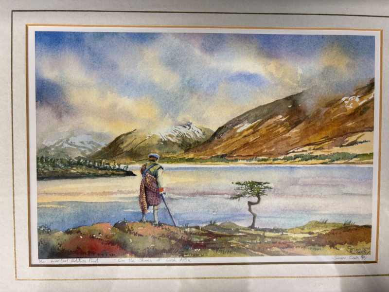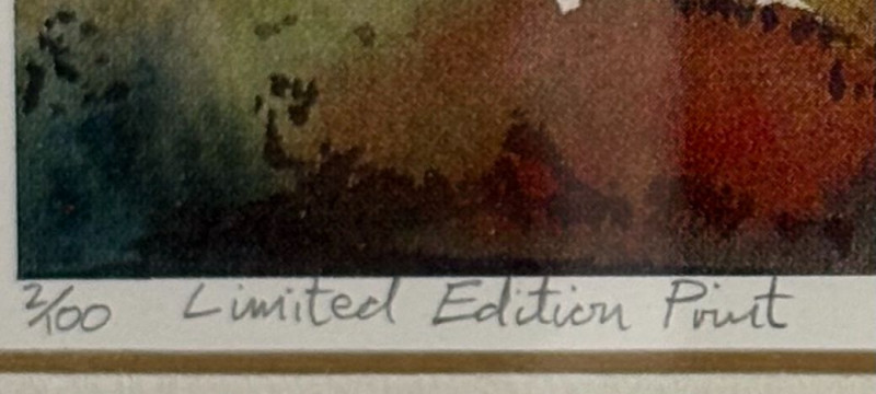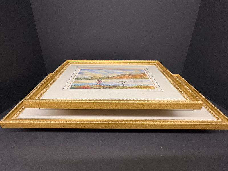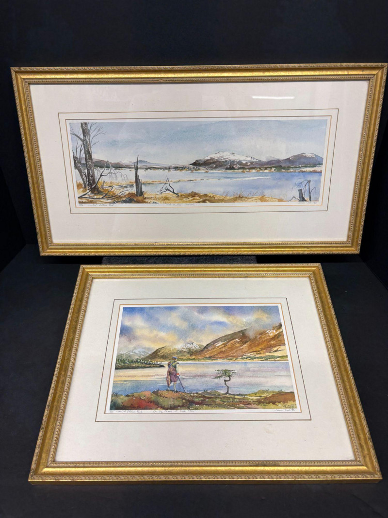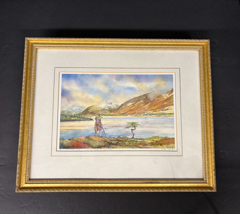 Dimensions: 11 in H X 20.5 in W 11.5 in H X 14 in W A beautifully coordinated pair of Susan Cook limited‑edition prints, each signed and dated 1996, presented in elegant gold‑trimmed frames with crisp white mats. One composition captures a quiet, wintry lakeside with bare trees reflected in still water—an intimate study in restraint and atmosphere. The companion piece offers a more vivid Highland vista, with rolling color, distant mountains, and a solitary figure near the riverbank, adding a touch of narrative warmth. Together, they form a balanced duet of mood and palette, showcasing Cook’s sensitivity to light, season, and the emotional pull of the landscape.