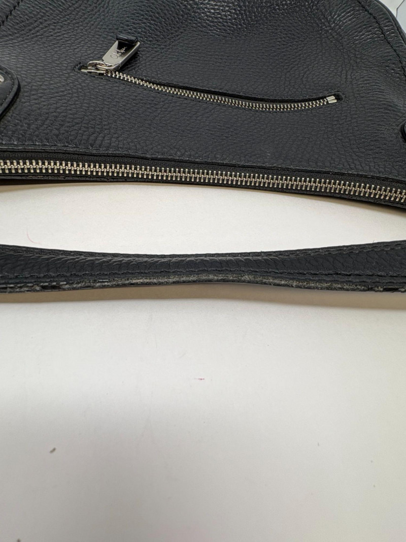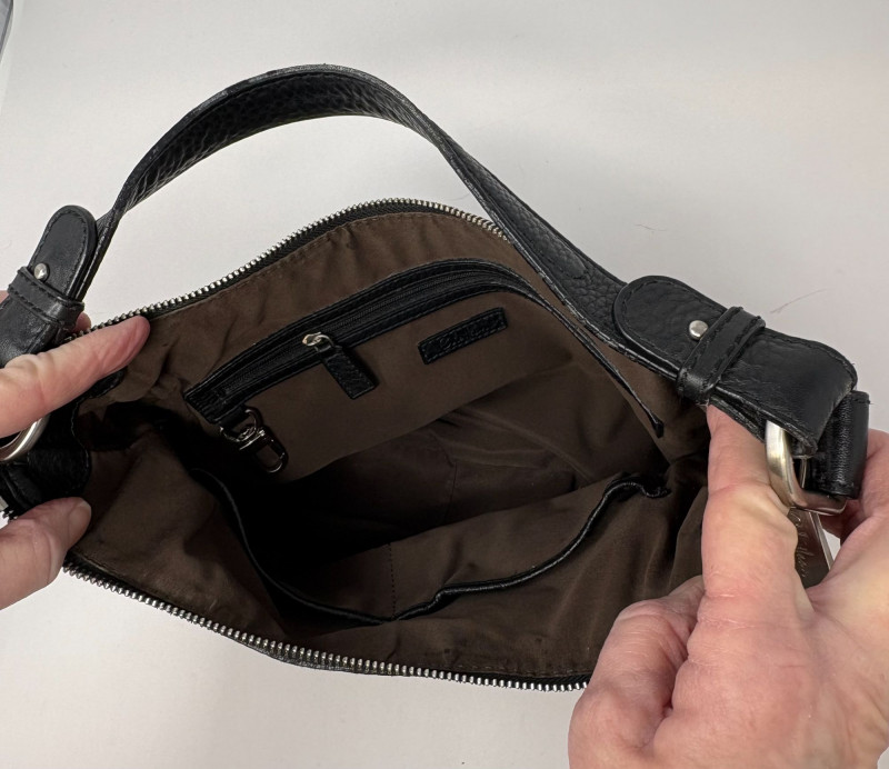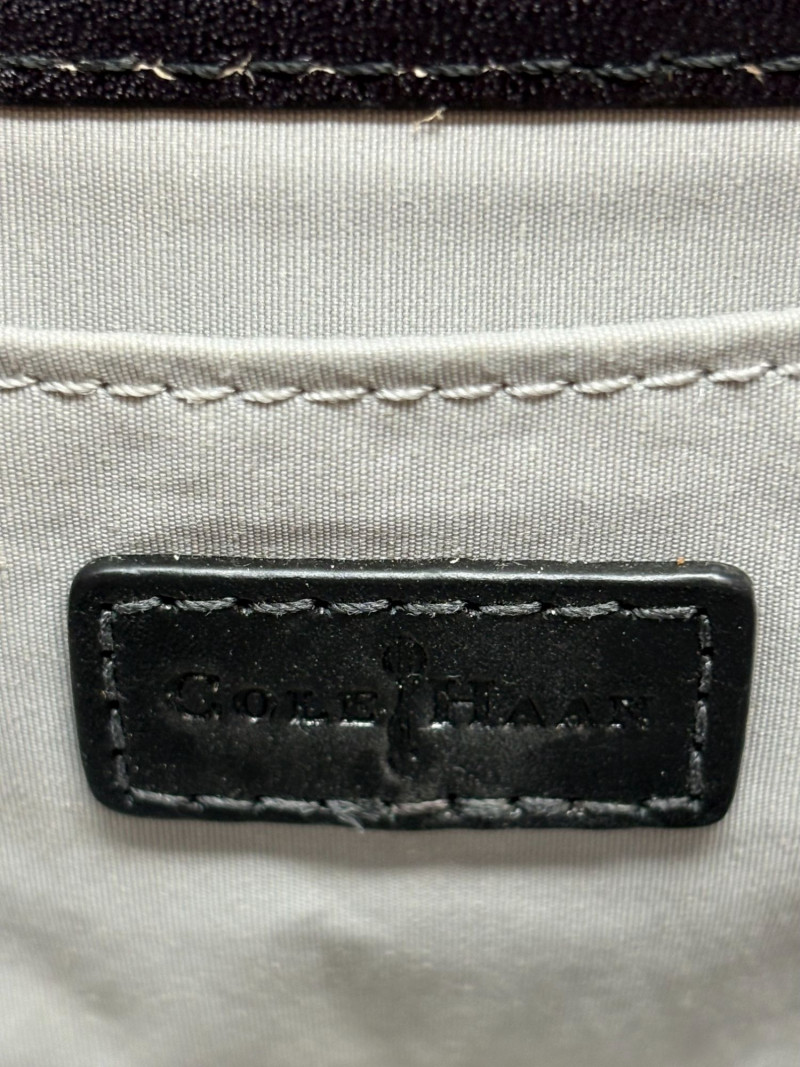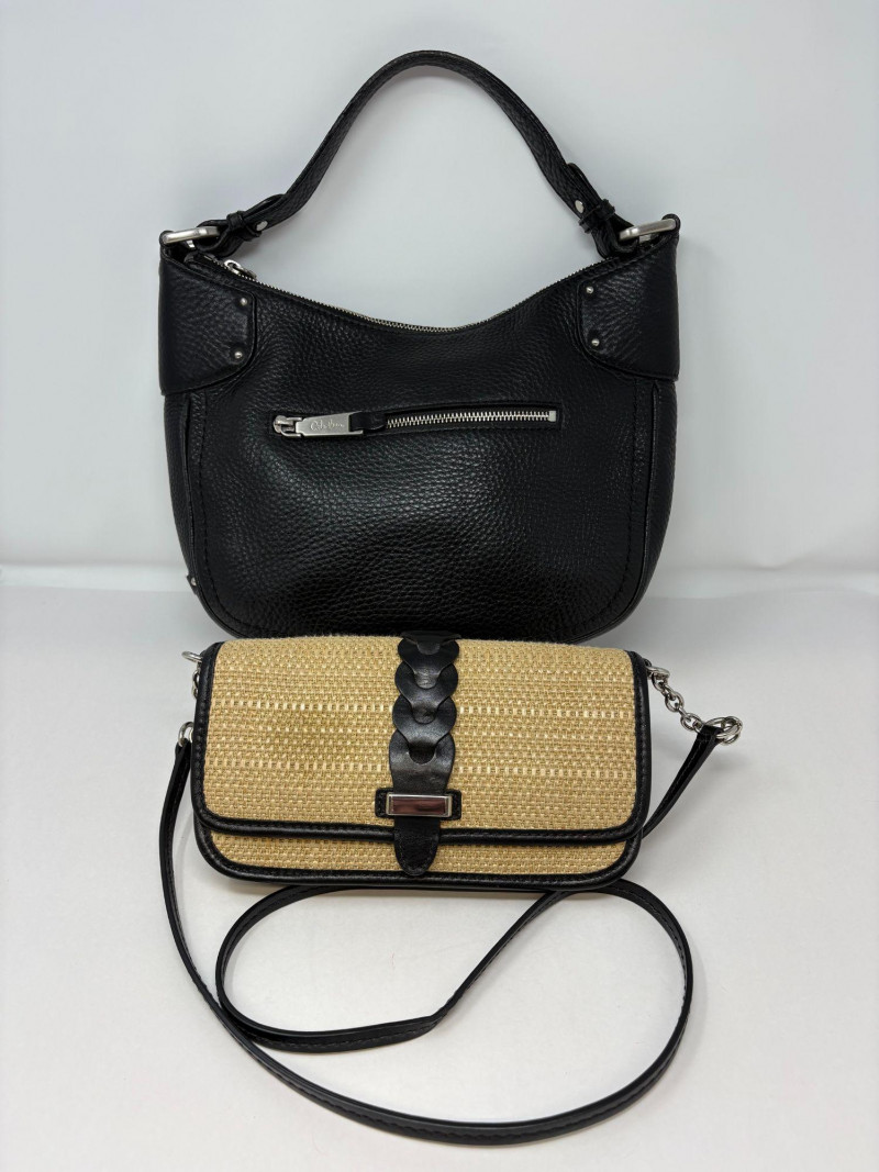 Two Cole Haan handbags: The black bag measure 13" x 9" with an 8" handle drop—clean, structured silhouette designed for polished daily wear. The black leather bag shows only slight wear on the handle (see photo), consistent with gentle use and still presenting beautifully. Included is a charming straw crossbody, 5" x 9" with a generous 22" drop. Lightweight, textural, and ideal for hands‑free days, it adds a warm, seasonal contrast to the Cole Haan pair. A versatile grouping for those who appreciate quality materials, timeless styling, and ready‑to‑use condition.