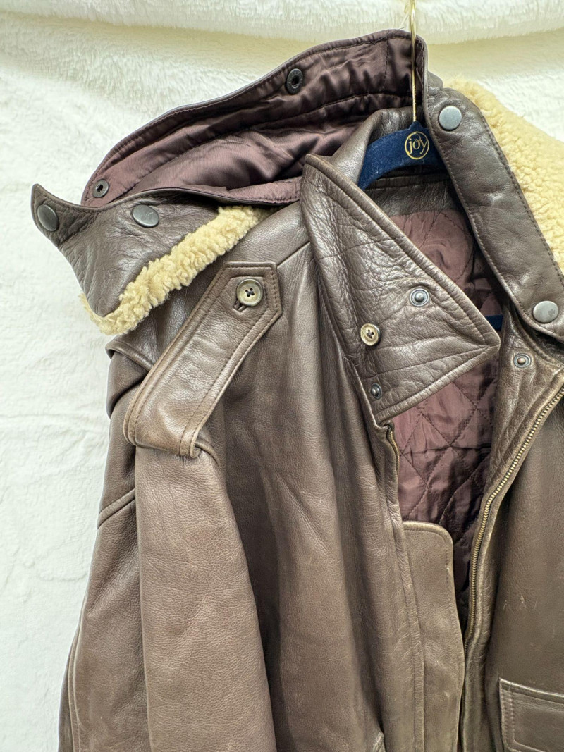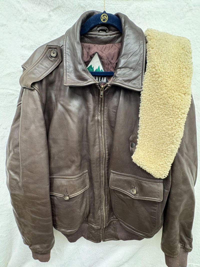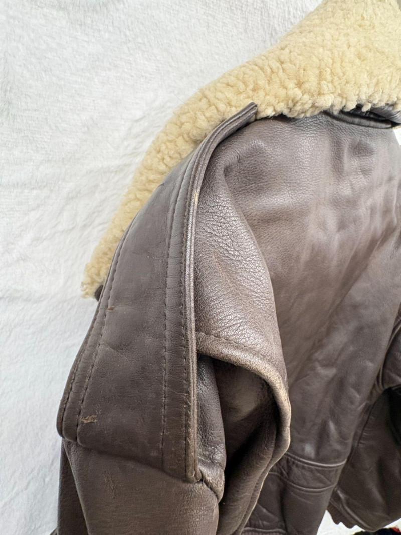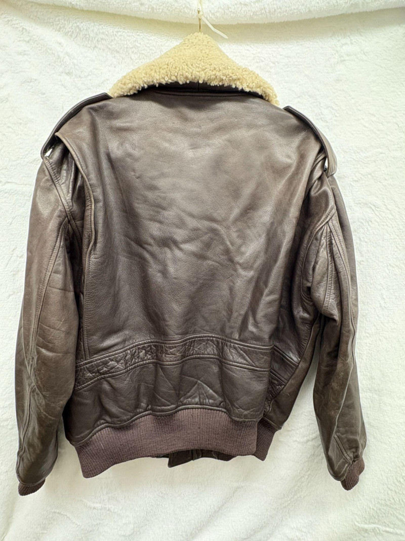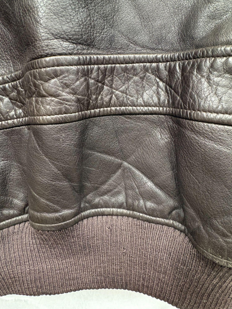 A classic Avirex USA leather bomber crafted in rich brown hide, showcasing the brand’s signature rugged styling and substantial build. This 46R jacket features a plush shearling collar, quilted interior lining, dual front flap pockets, and ribbed cuffs and waistband for a secure, comfortable fit. Close‑up inspection highlights natural creasing to the leather and wear to the knit cuffs, consistent with age and use, adding authentic character to the piece. A timeless cold‑weather essential from an iconic American maker. *Please note slight damage on cotton band.