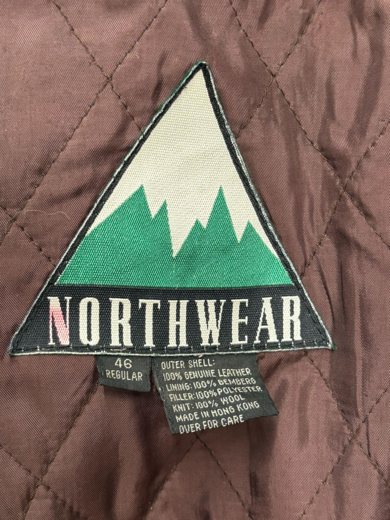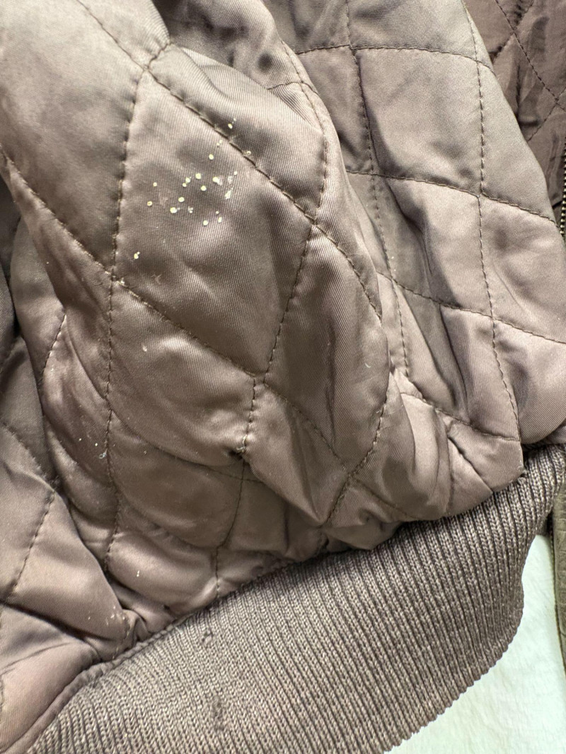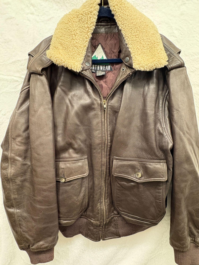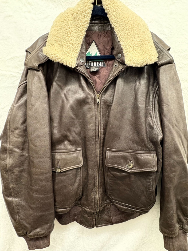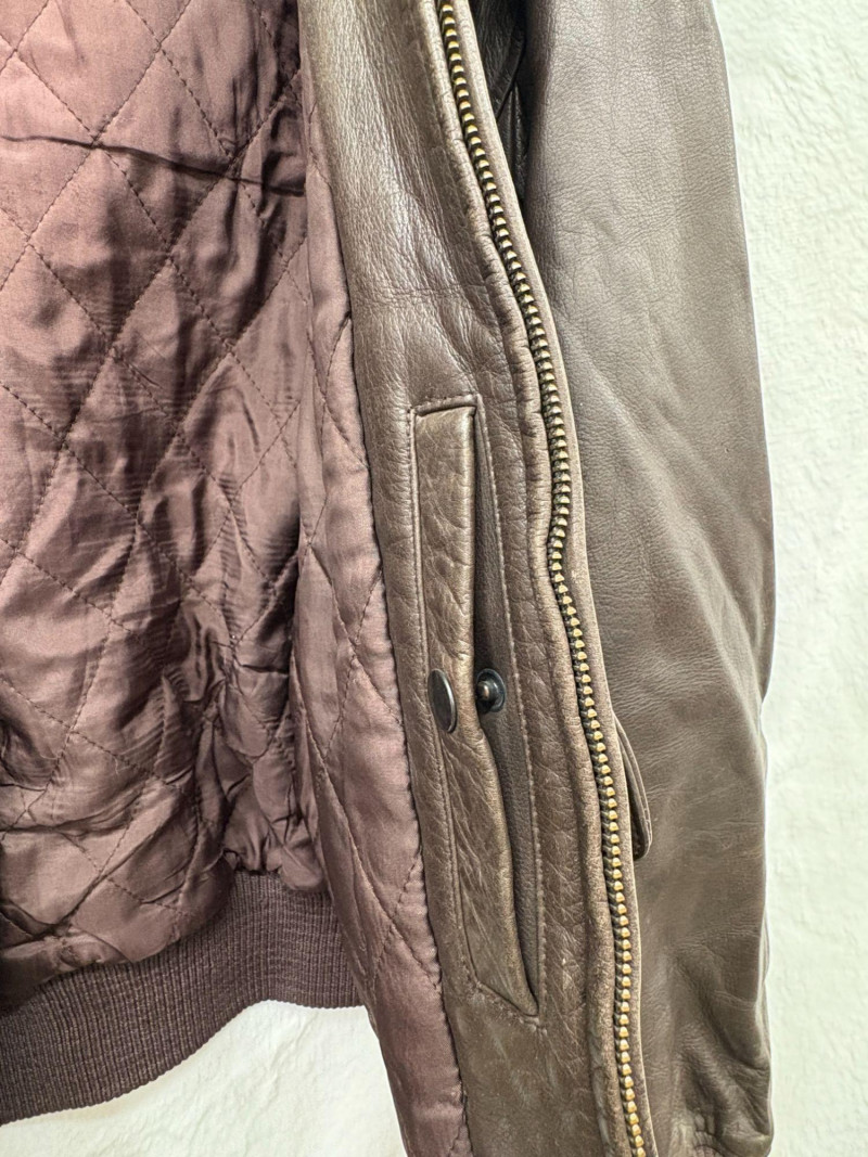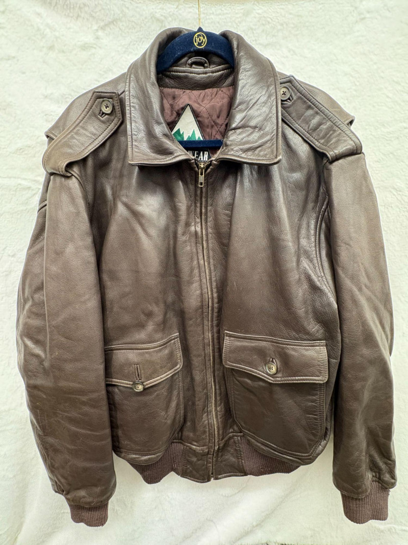 A classic Avirex USA leather bomber crafted in rich brown hide, showcasing the brand’s signature rugged styling and substantial build. This 46R jacket features a plush shearling collar, quilted interior lining, dual front flap pockets, and ribbed cuffs and waistband for a secure, comfortable fit. Close‑up inspection highlights natural creasing to the leather and wear to the knit cuffs, consistent with age and use, adding authentic character to the piece. A timeless cold‑weather essential from an iconic American maker. *Please note slight damage on cotton band.