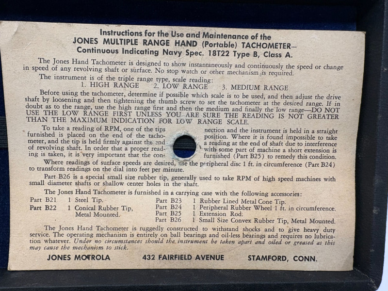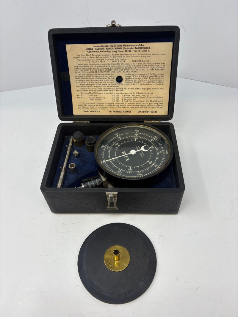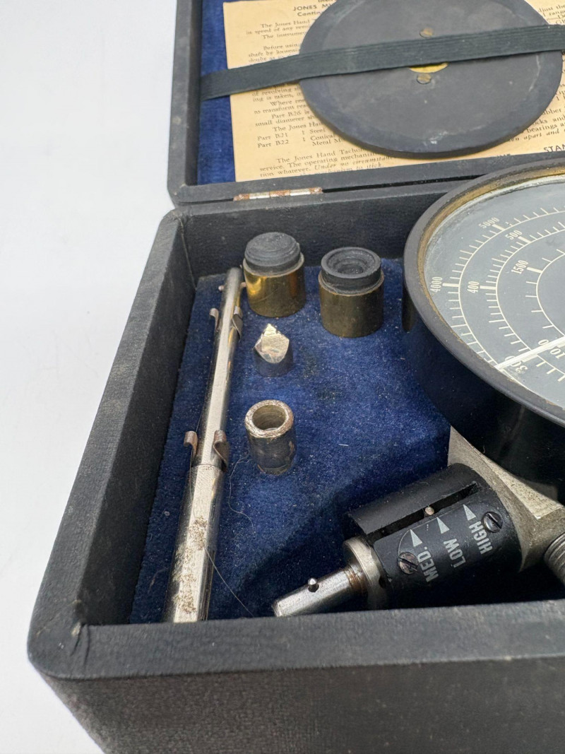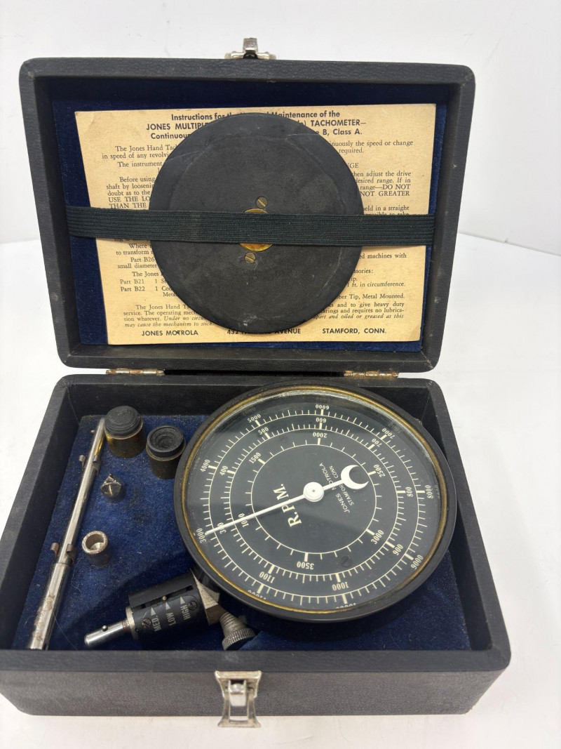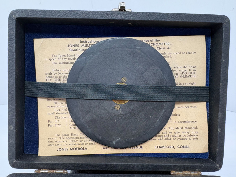 A finely preserved Jones Multiple‑Spring Hand Tachometer, complete with its original velvet‑lined case and accessory set. This precision mechanical instrument features a clean RPM dial, intact needle, and factory instruction card mounted inside the lid. All components present as stored, with springs, attachments, and fittings nestled securely in their designated compartments. A compelling example of early industrial measurement technology—ideal for collectors of scientific instruments, horological tools, or mechanical-era engineering devices.