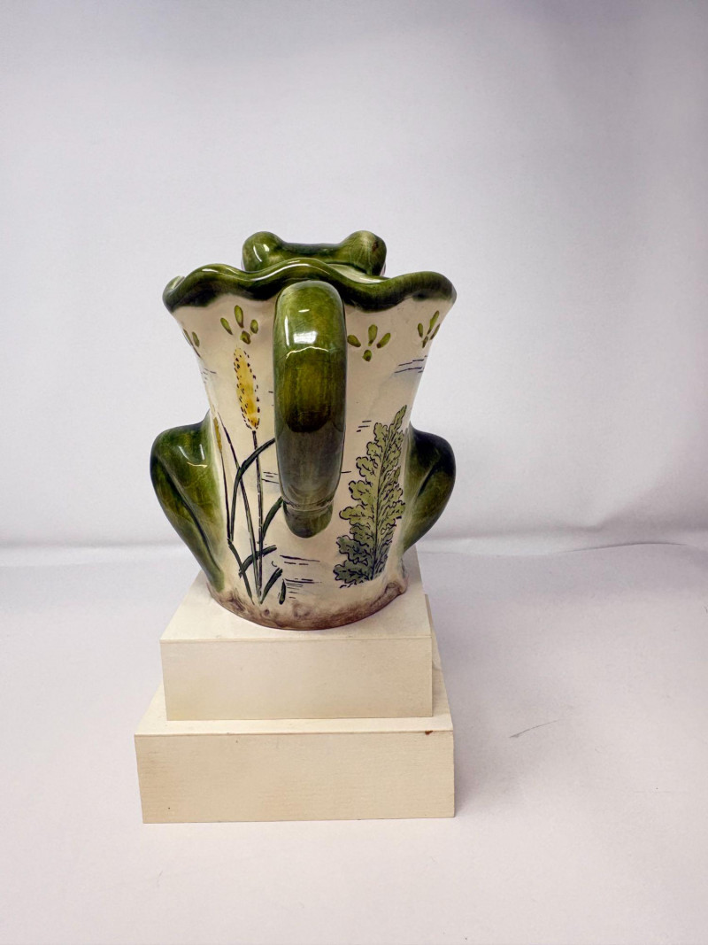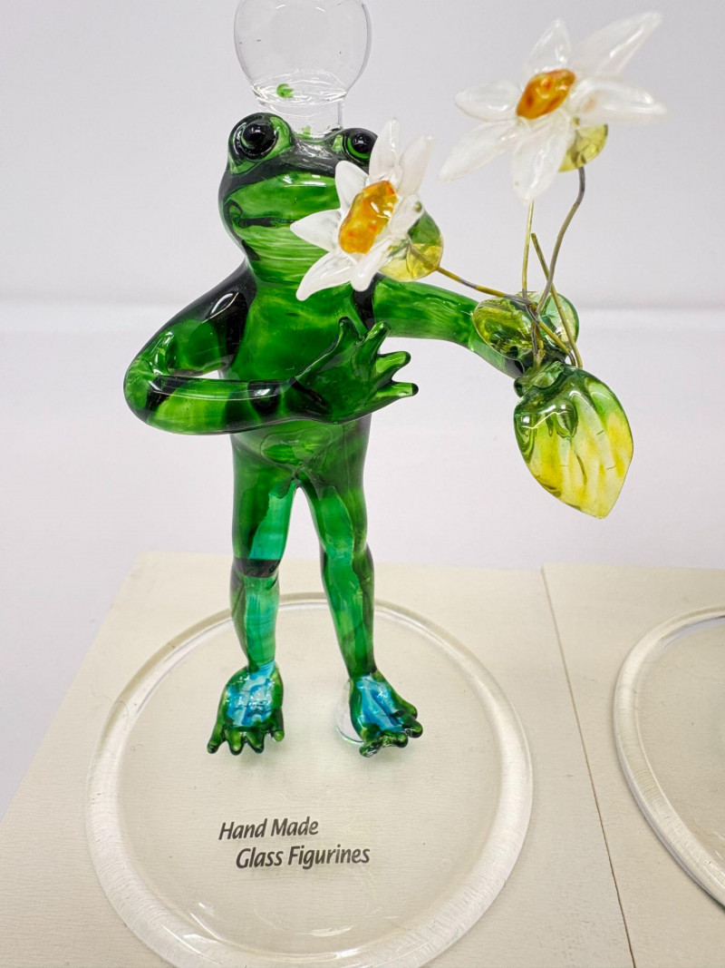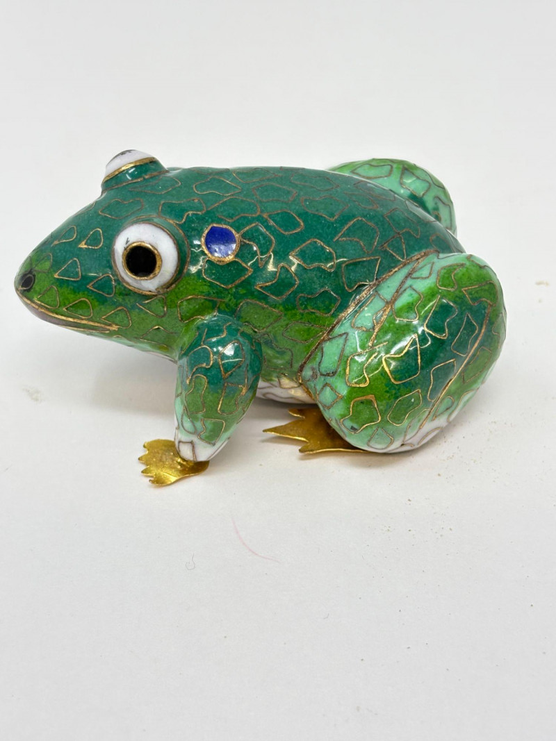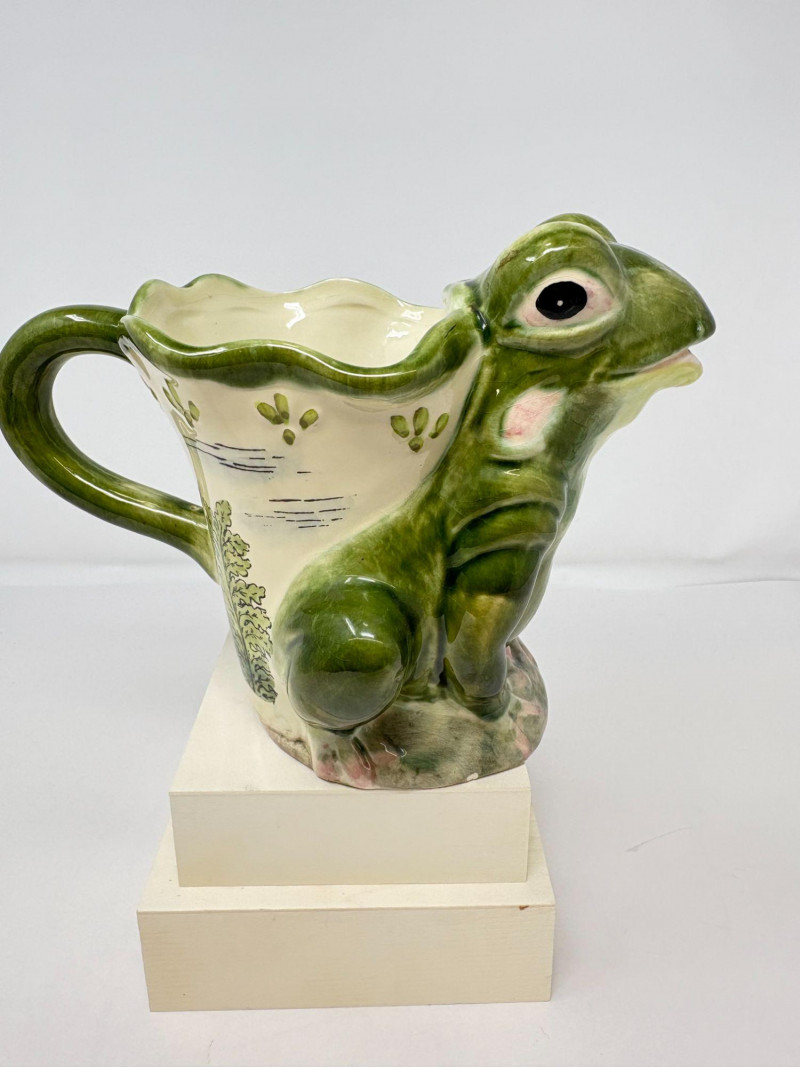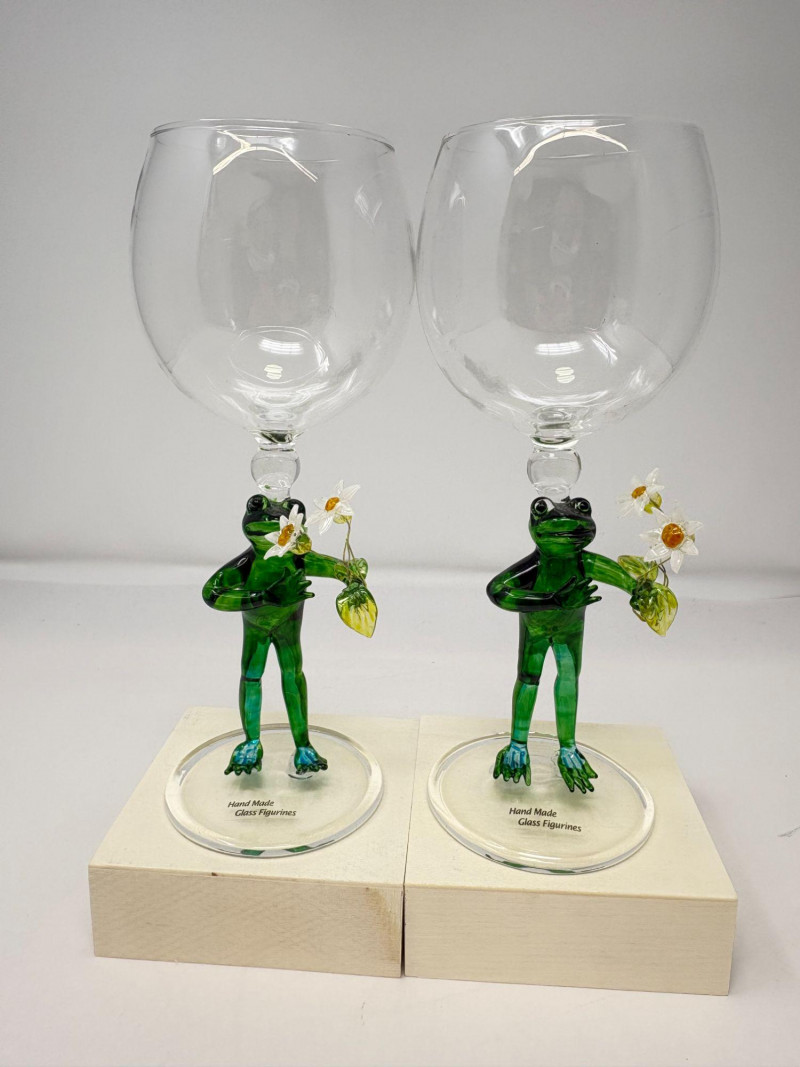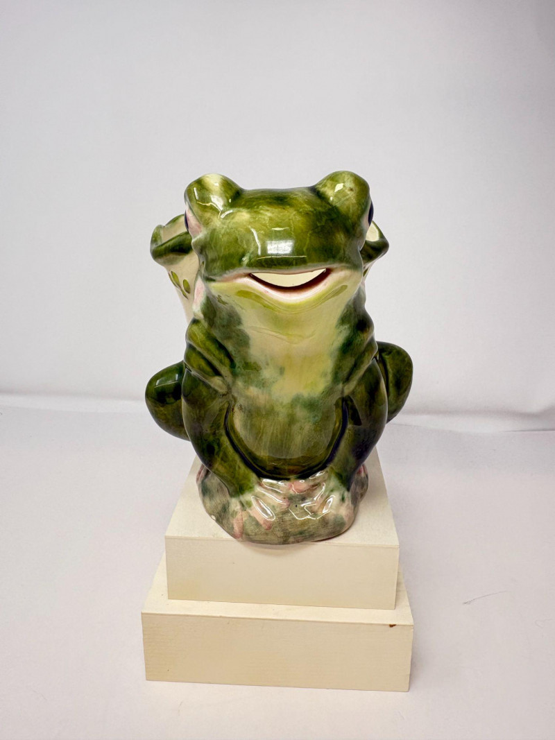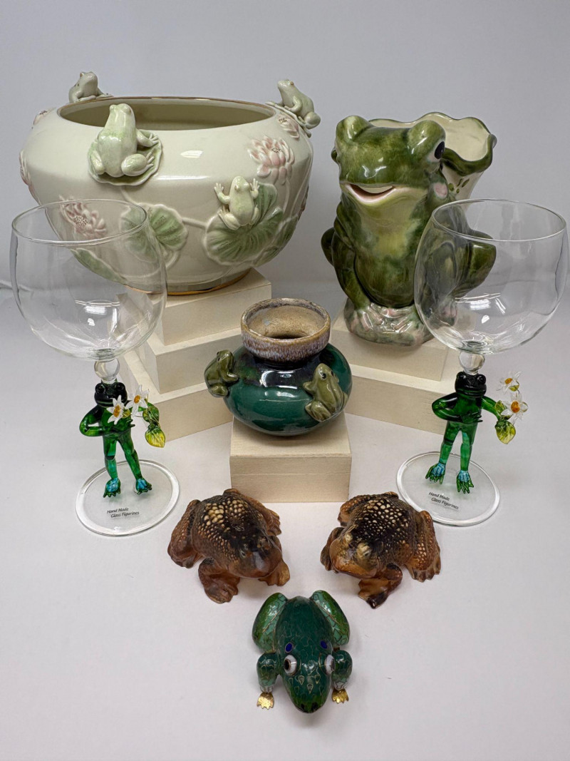 A display‑ready assortment of frog‑themed décor and Lenox porcelain accents. This curated grouping includes a Lenox floral frog bowl along with complementary frog figurines, glassware, and small decorative pieces—ideal for collectors who appreciate whimsical, nature‑inspired design. Lenox Floral Frog Bowl — 9" W × 5.5" H Three‑Frog Lidded Jar — 3.75" H × 4.25" W Frog Jug — 6" H × 6" W × 4" D Frog Salt & Pepper Shakers — 2" H × 4.25" W Hand‑Made Frog Wine Glasses (Set) — 9" H × 3.5" W × 4" D Gold‑Footed Cloisonne frog— 1.75" H × 3.25" WItems & Measurements