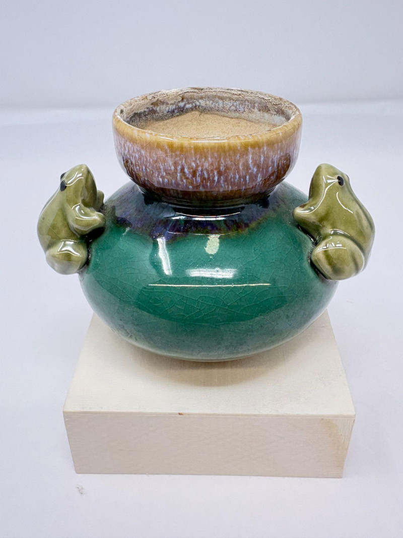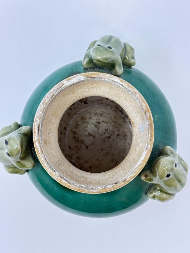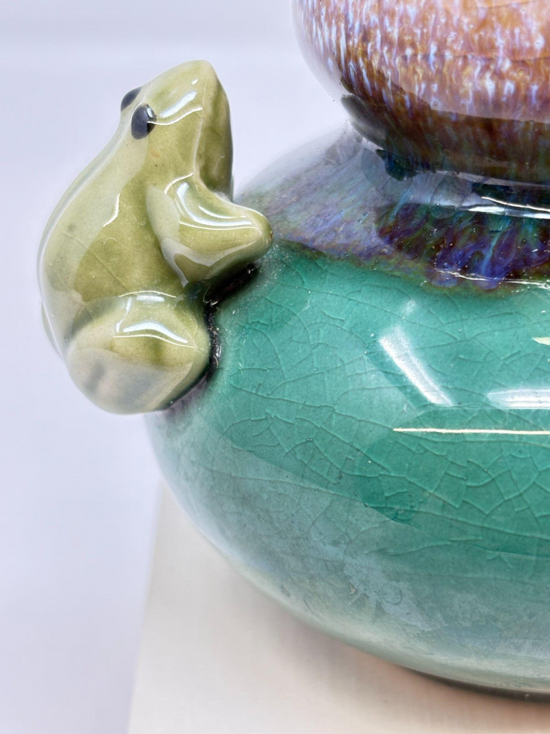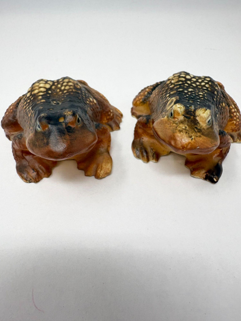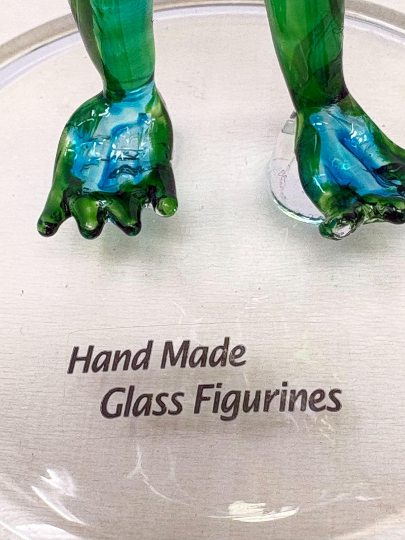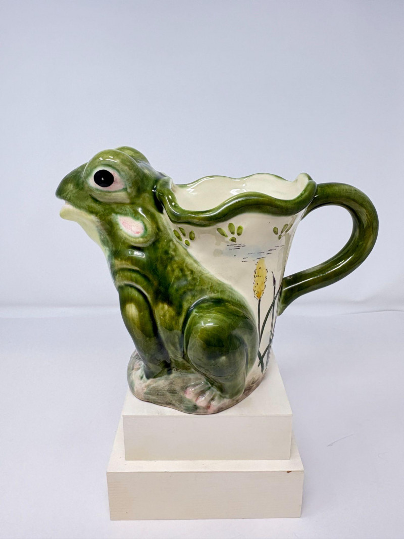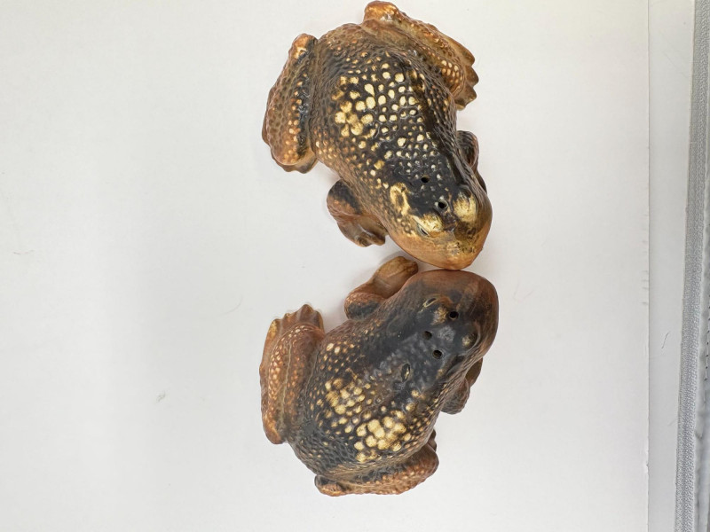 A display‑ready assortment of frog‑themed décor and Lenox porcelain accents. This curated grouping includes a Lenox floral frog bowl along with complementary frog figurines, glassware, and small decorative pieces—ideal for collectors who appreciate whimsical, nature‑inspired design. Lenox Floral Frog Bowl — 9" W × 5.5" H Three‑Frog Lidded Jar — 3.75" H × 4.25" W Frog Jug — 6" H × 6" W × 4" D Frog Salt & Pepper Shakers — 2" H × 4.25" W Hand‑Made Frog Wine Glasses (Set) — 9" H × 3.5" W × 4" D Gold‑Footed Cloisonne frog— 1.75" H × 3.25" WItems & Measurements