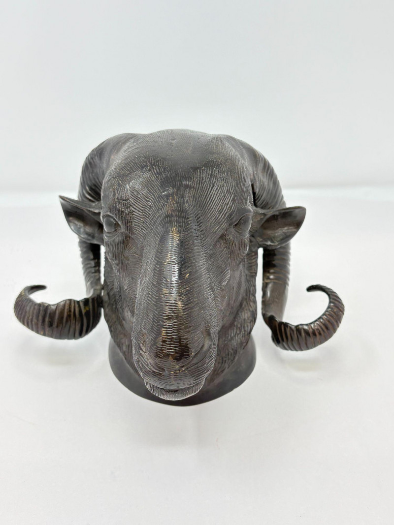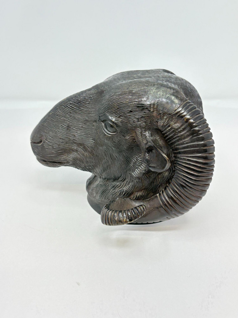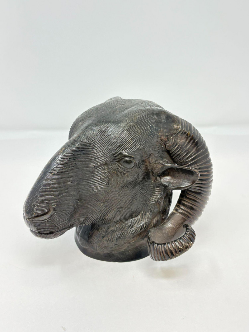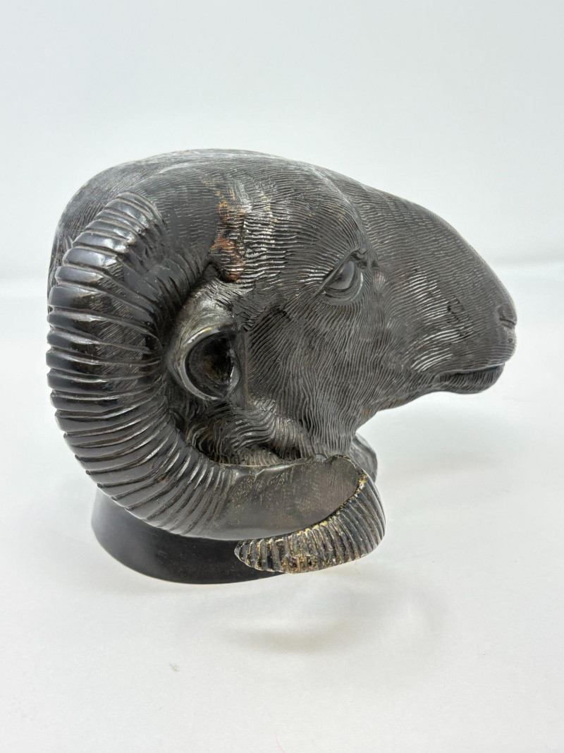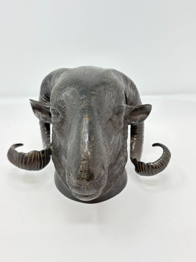 A striking solid bronze ram’s head, hand‑carried home from Scotland. It is crafted with exceptional sculptural detail. The powerful curled horns, textured fleece, and expressive form capture the ram’s enduring symbolism of strength, leadership, and Highland heritage. Dimensions: 6.5" H × 5.75" W