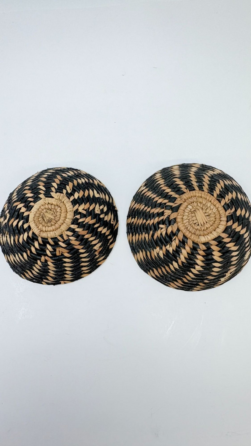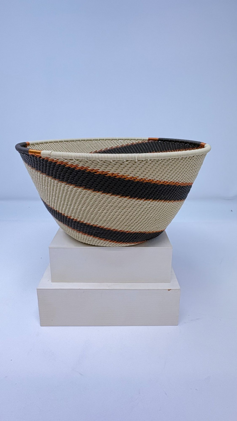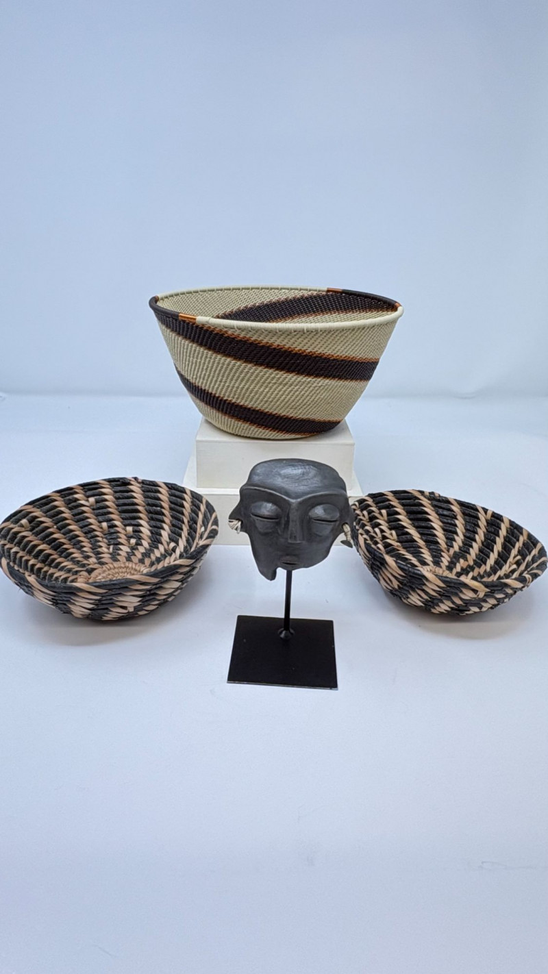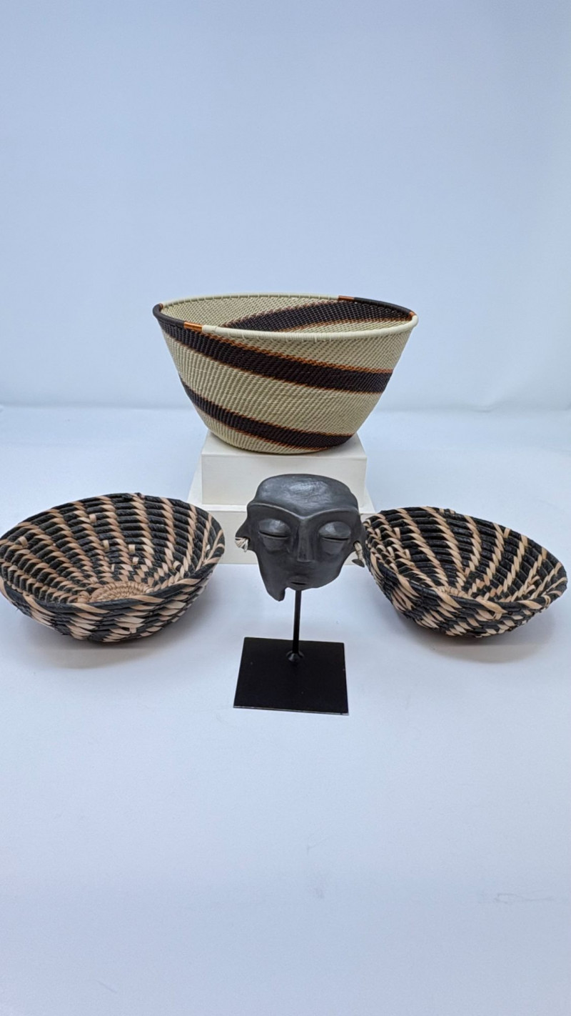 A striking, globally inspired 4‑piece decorative collection featuring artisan craftsmanship from across Africa. The larger basket is hand‑woven by Zulu artisans—primarily men—using recycled telephone wire, a celebrated contemporary craft known for its durability, intricate patterning, and vibrant cultural heritage. The black‑and‑tan baskets originate from Uganda, showcasing traditional weaving techniques and natural fiber artistry. Complementing the basketry is a sculpted face mask presented on a museum‑style stand, patterned bowls, and a textured basket creating a cohesive grouping rich in form, texture, and cultural character. Includes: 1 large Zulu telephone‑wire basket. 8" W x 4" H 2 Ugandan black‑and‑tan woven baskets. 5" W x 2 H 1 sculpted face/mask on stand. 4.5" H x 2.5 W x 2.5 D