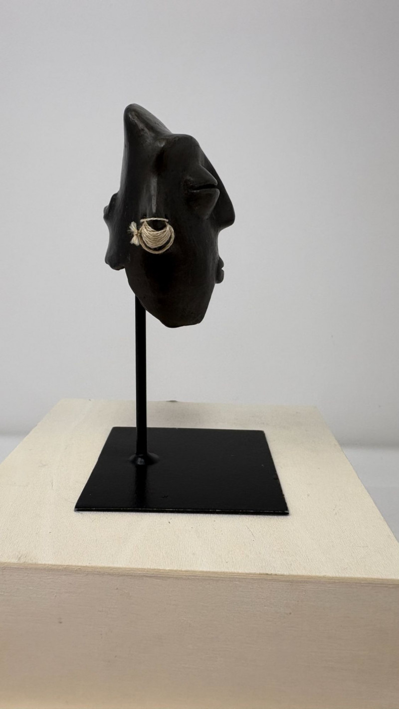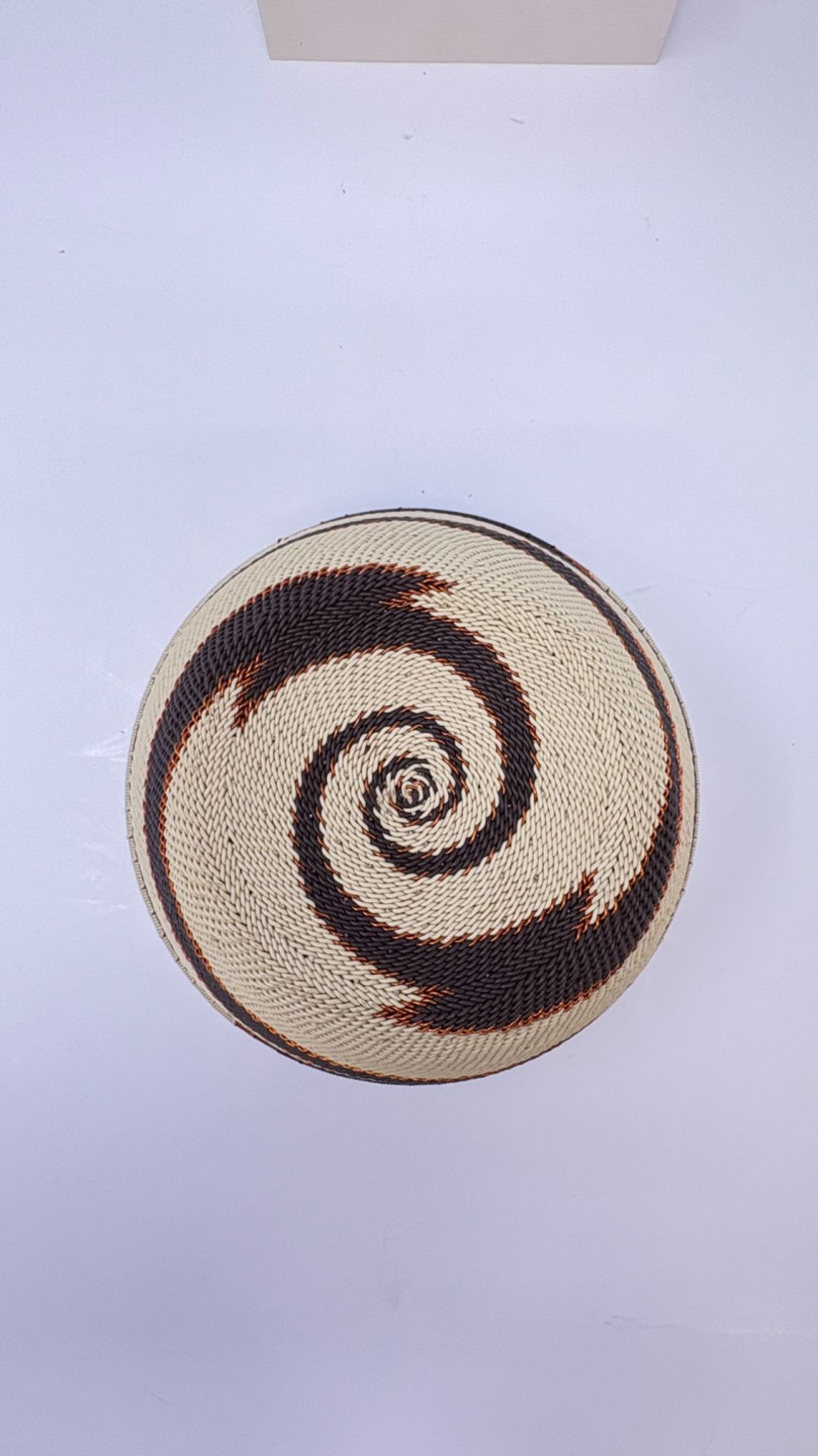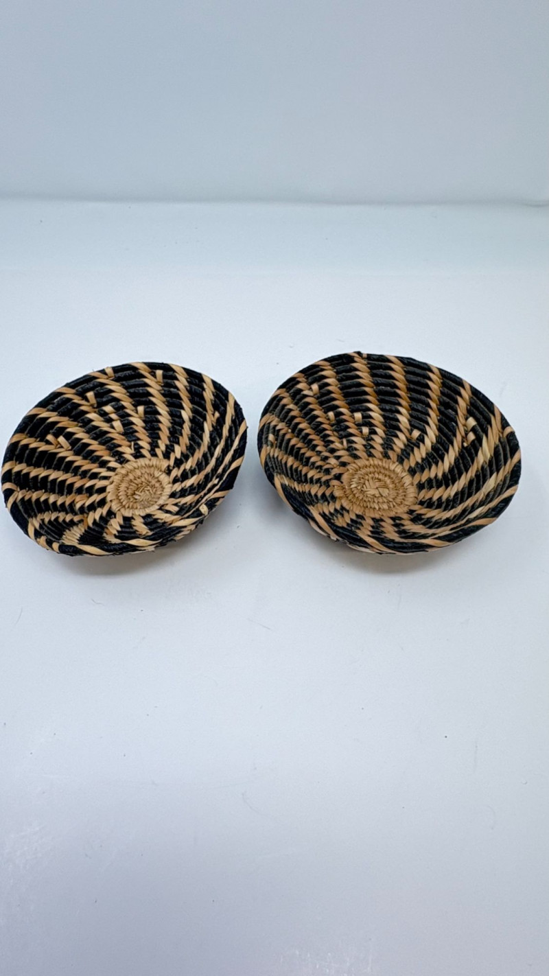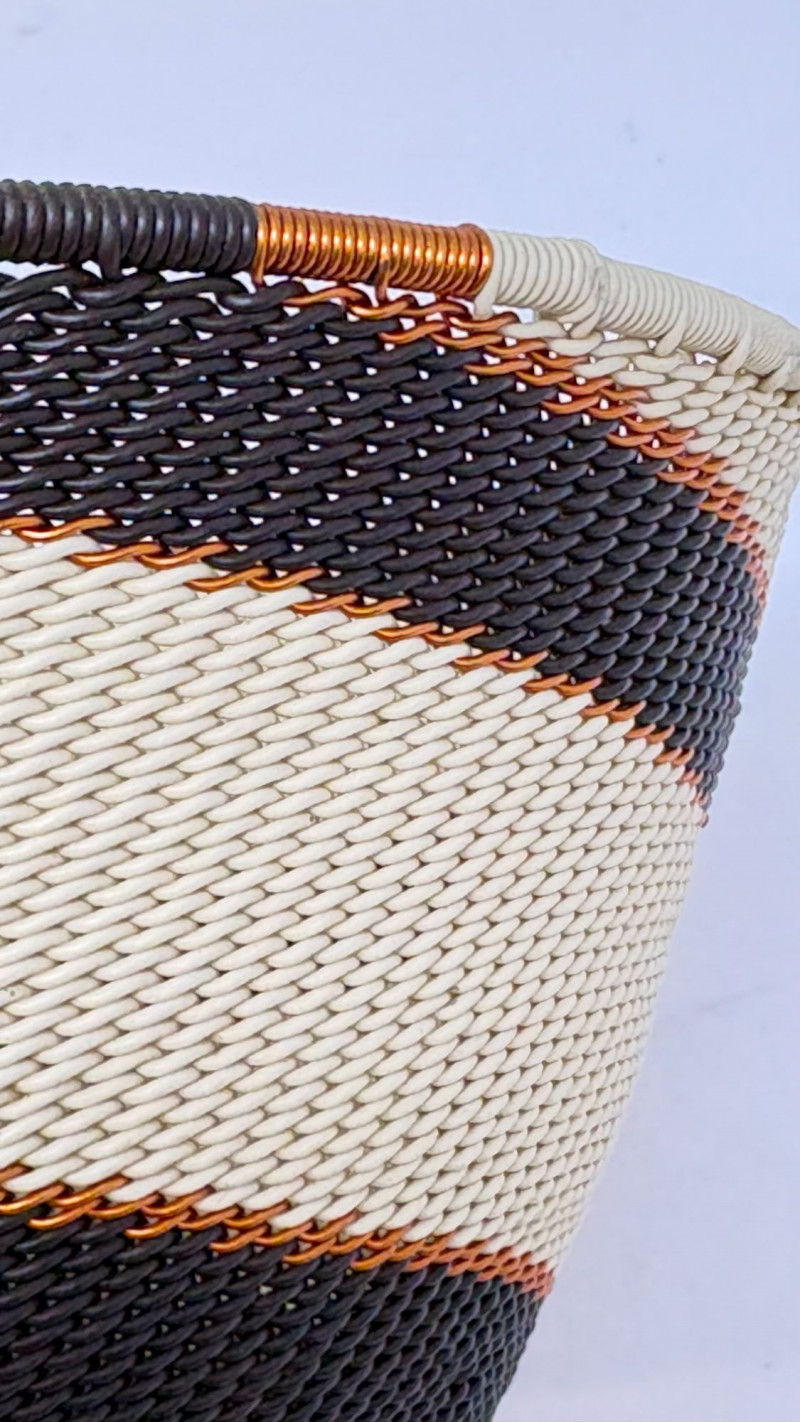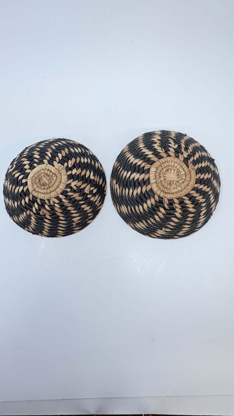 A striking, globally inspired 4‑piece decorative collection featuring artisan craftsmanship from across Africa. The larger basket is hand‑woven by Zulu artisans—primarily men—using recycled telephone wire, a celebrated contemporary craft known for its durability, intricate patterning, and vibrant cultural heritage. The black‑and‑tan baskets originate from Uganda, showcasing traditional weaving techniques and natural fiber artistry. Complementing the basketry is a sculpted face mask presented on a museum‑style stand, patterned bowls, and a textured basket creating a cohesive grouping rich in form, texture, and cultural character. Includes: 1 large Zulu telephone‑wire basket. 8" W x 4" H 2 Ugandan black‑and‑tan woven baskets. 5" W x 2 H 1 sculpted face/mask on stand. 4.5" H x 2.5 W x 2.5 D