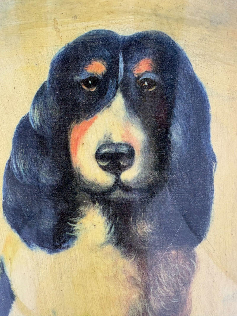 A striking hand‑painted porcelain vase featuring a finely rendered black‑and‑white spaniel framed by rich gilt accents. Standing an impressive 14.5 inches high and 11.5 inches wide, this statement piece showcases ornate scrolled handles, a flared rim, and a lustrous gold ground that elevates the artwork. The detailed canine portrait evokes classic Victorian styling, making it an elegant focal point for traditional or eclectic interiors. Ideal for collectors of dog‑themed art, decorative porcelain, or gilded European‑style décor.