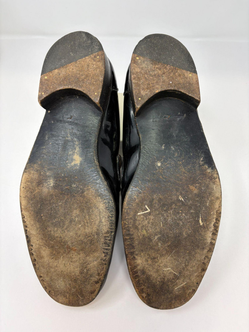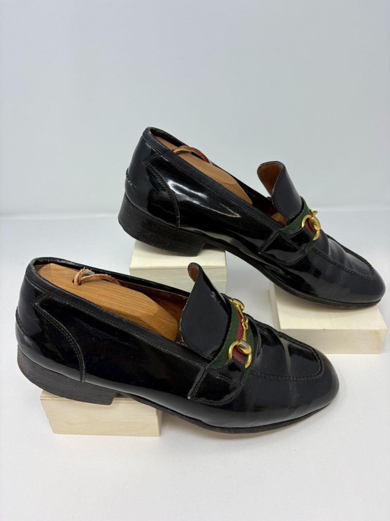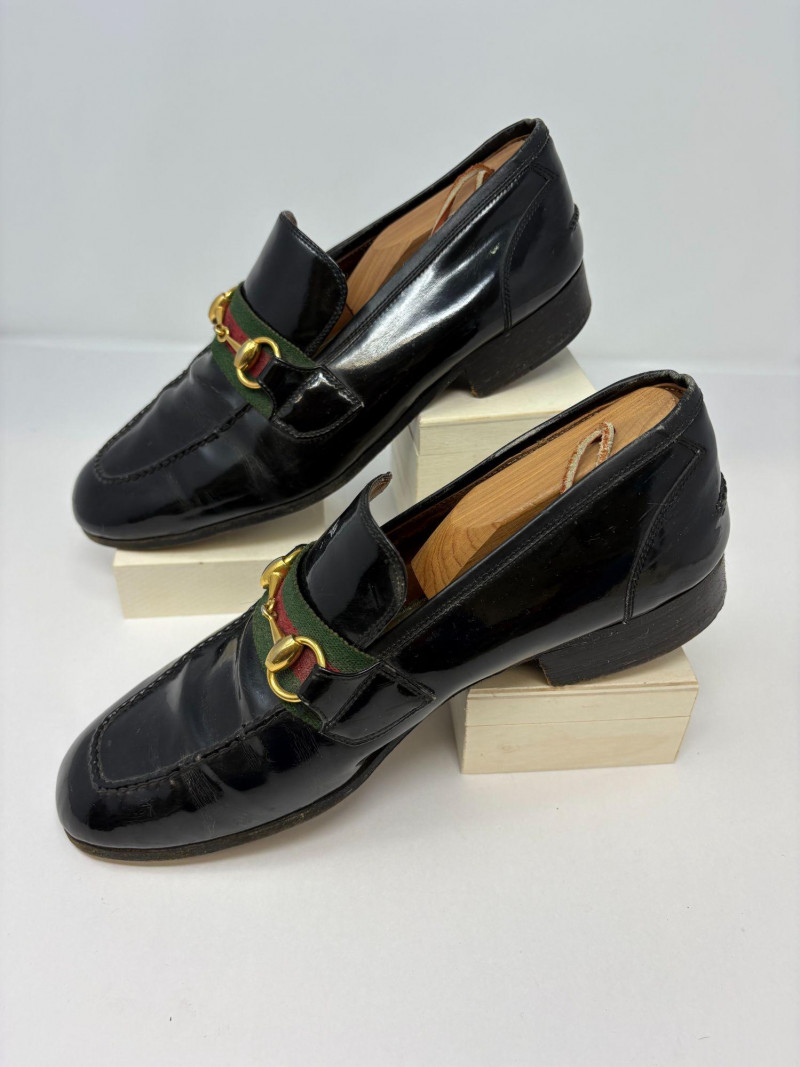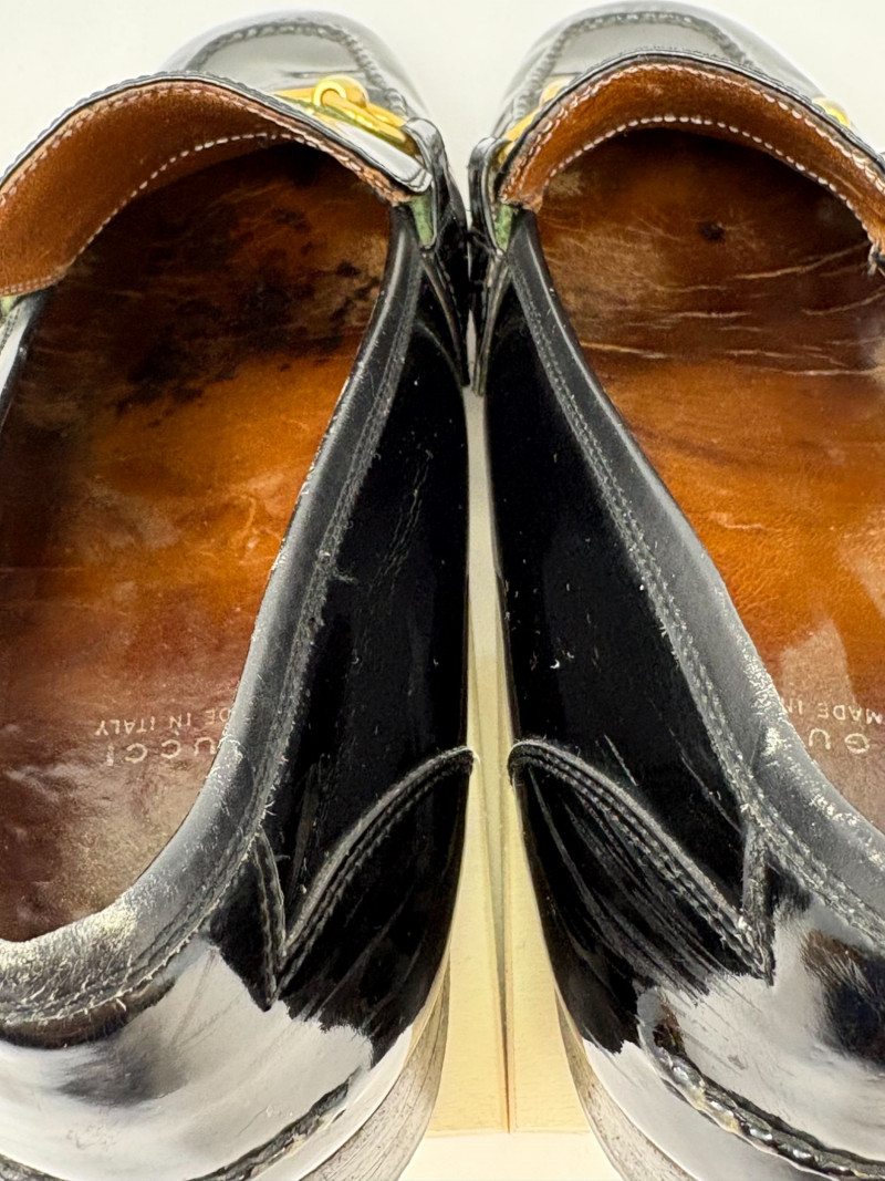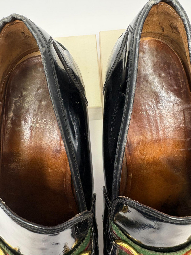 Authentic Gucci black leather dress shoes featuring signature gold horsebit and green‑red web detail. Made in Italy, size 42M. Classic luxury loafers—ideal for collectors and refined menswear enthusiasts. A discreet expression of luxury for the buyer who values craftsmanship over ornament and elegance without excess. Plenty of life left in these beautiful shoes