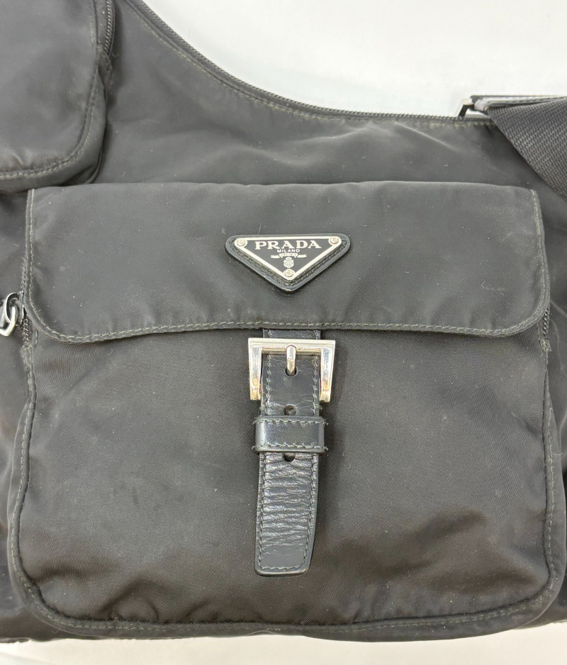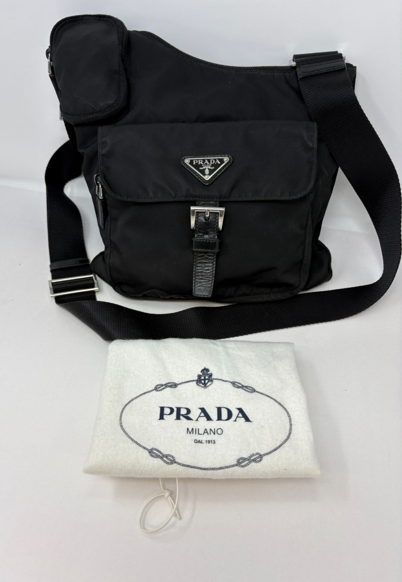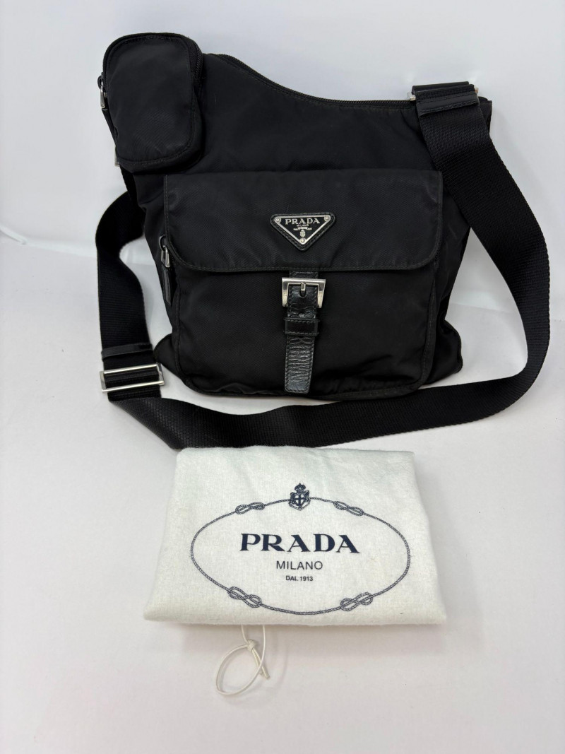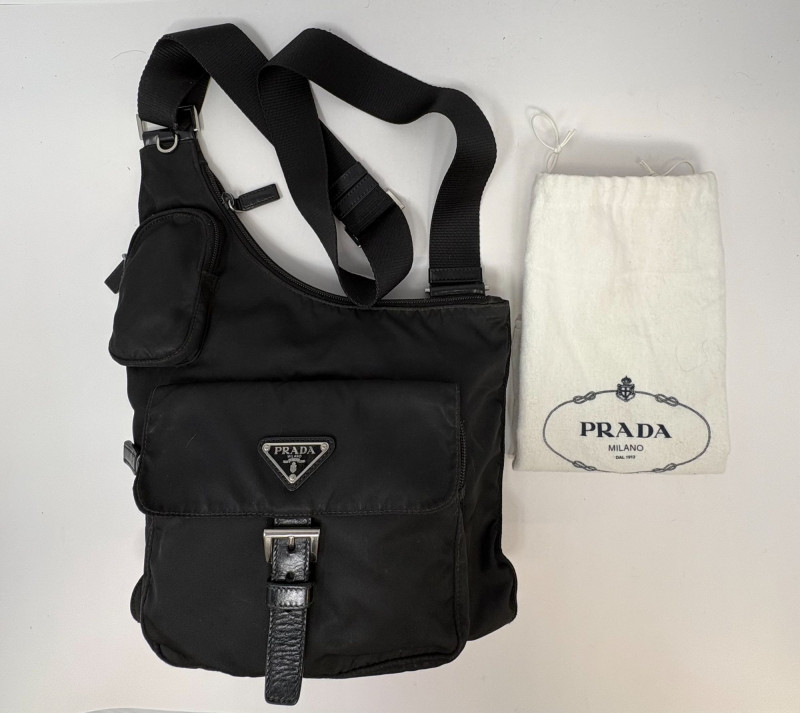 Factory code 165 A refined essential from Prada’s iconic Tessuto line, this black nylon travel bag blends effortless luxury with everyday function. Crafted in the house’s signature durable Tessuto nylon and finished with smooth leather trim, it features the classic triangular Prada enamel logo and a secure leather‑tab buckle closure. The interior reveals Prada’s signature jacquard lining—clean, structured, and unmistakably high‑end. Height: 9 in Width: 10.75 in Handle Drop: 21.5 in from top of handle to zipper Tessuto nylon body with leather closure Signature Prada logo plaque Polished hardware Prada jacquard logo lining Includes original white Prada dust bagDimensions
