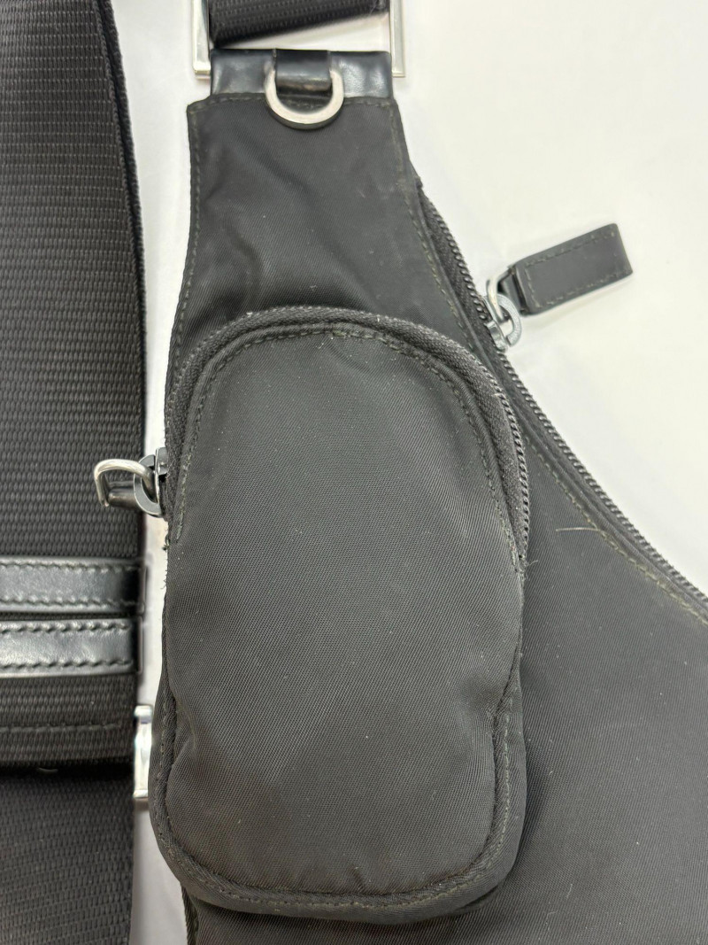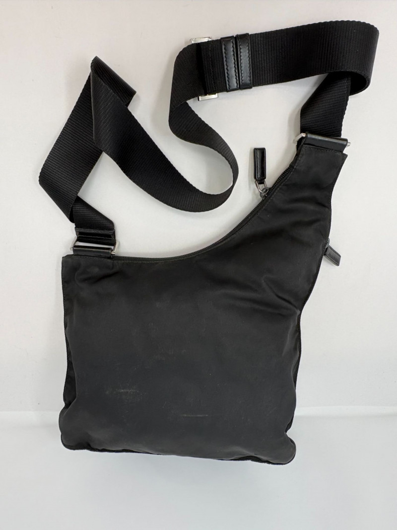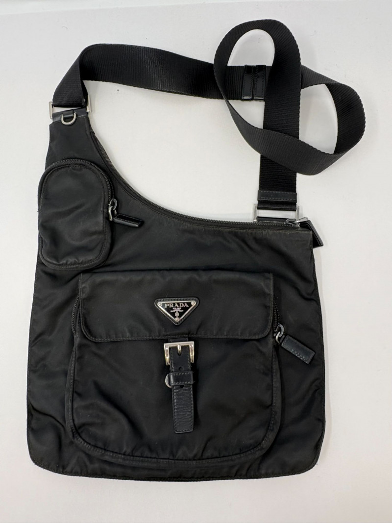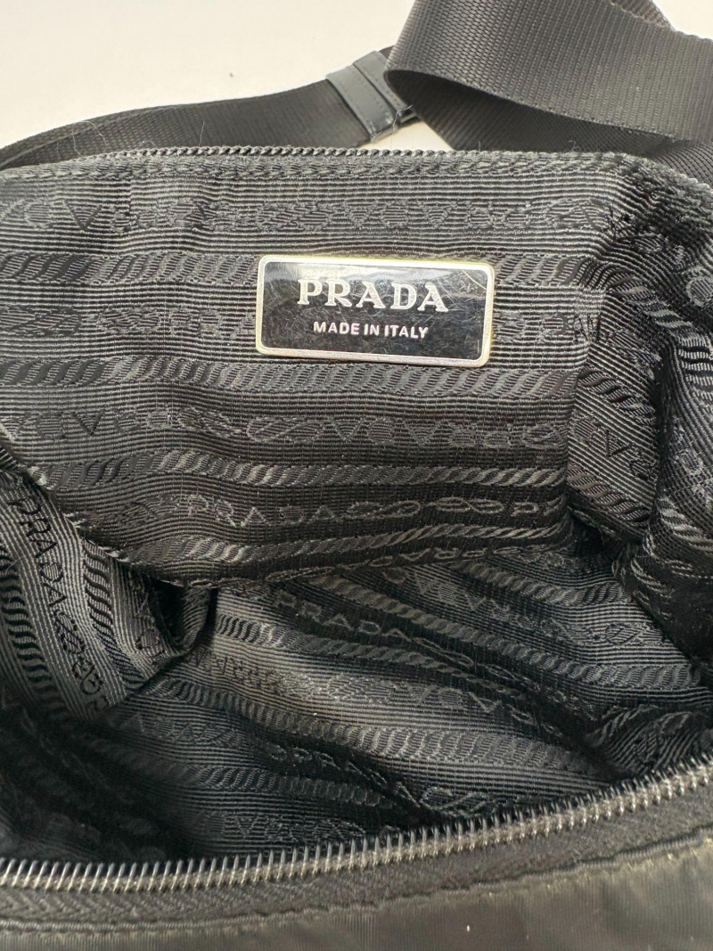 Factory code 165 A refined essential from Prada’s iconic Tessuto line, this black nylon travel bag blends effortless luxury with everyday function. Crafted in the house’s signature durable Tessuto nylon and finished with smooth leather trim, it features the classic triangular Prada enamel logo and a secure leather‑tab buckle closure. The interior reveals Prada’s signature jacquard lining—clean, structured, and unmistakably high‑end. Height: 9 in Width: 10.75 in Handle Drop: 21.5 in from top of handle to zipper Tessuto nylon body with leather closure Signature Prada logo plaque Polished hardware Prada jacquard logo lining Includes original white Prada dust bagDimensions
