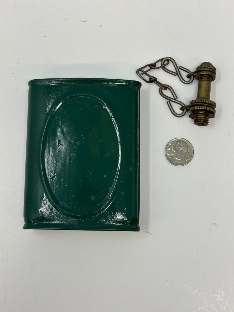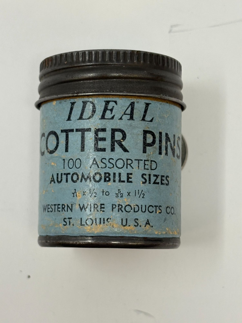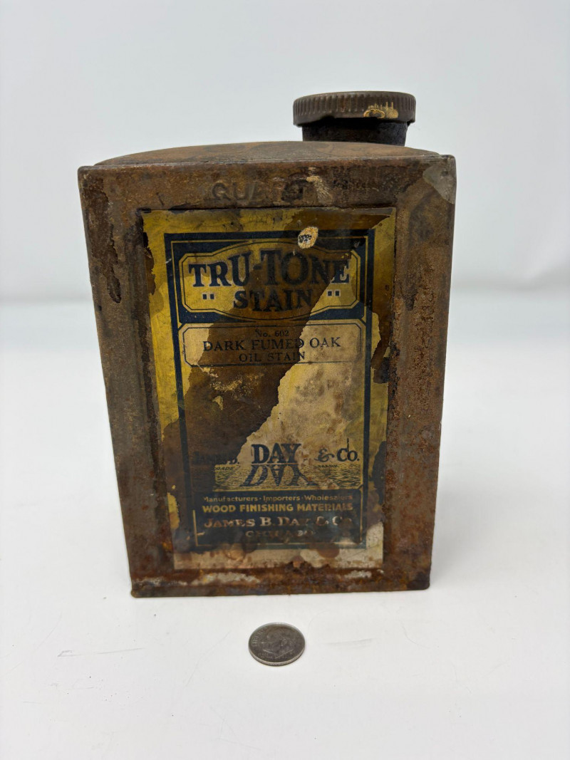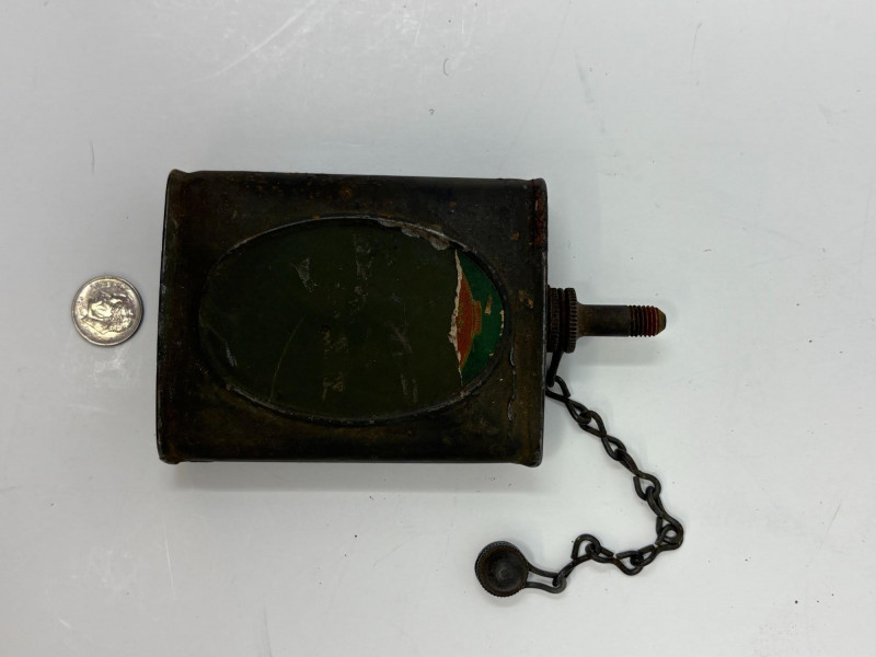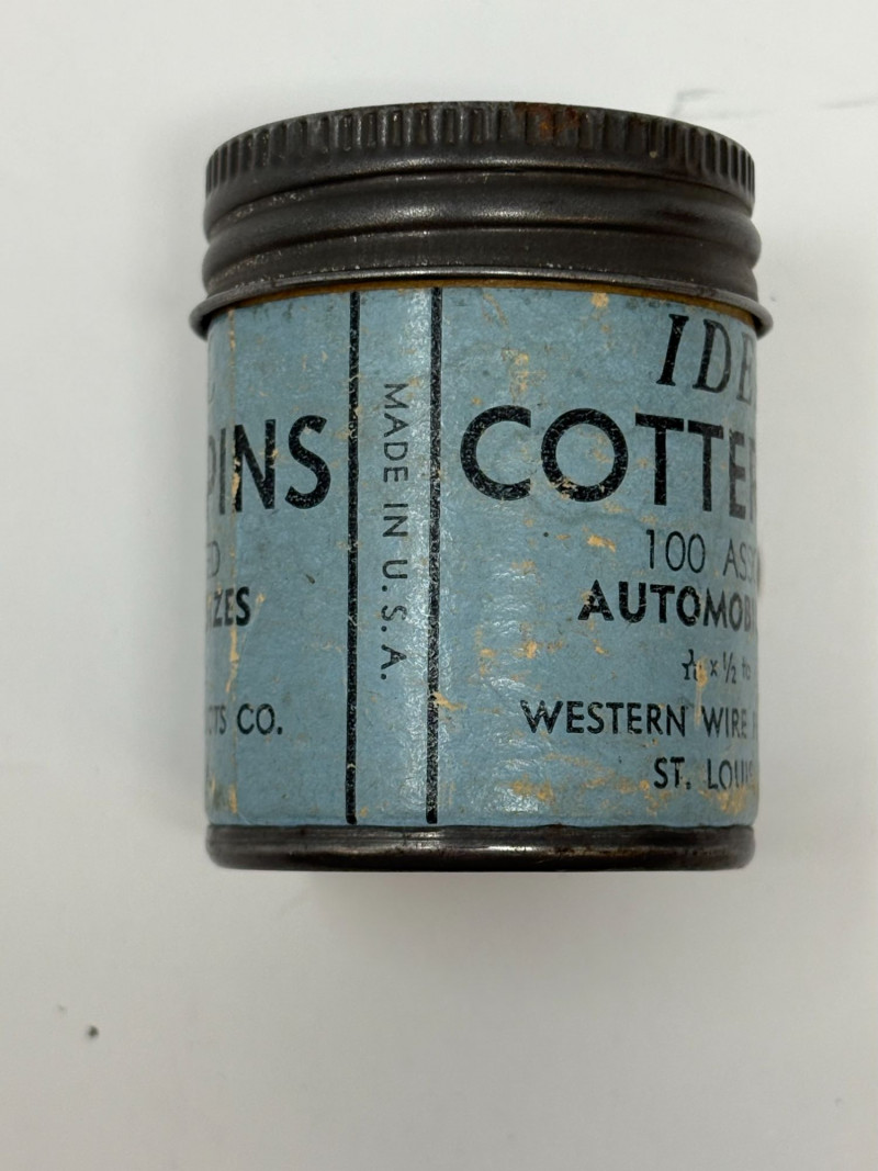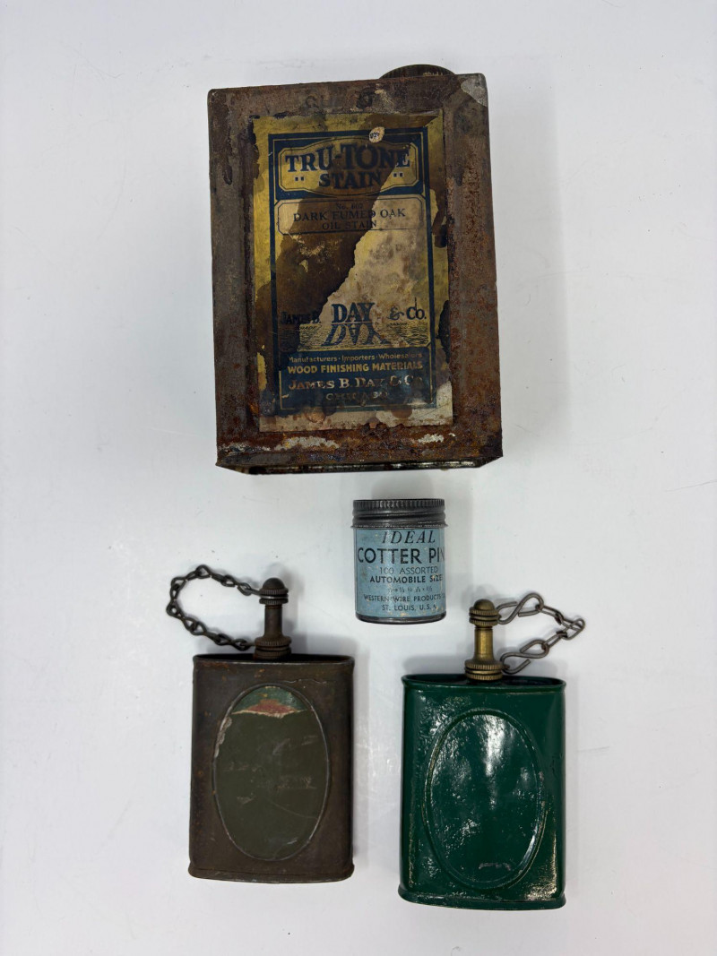 Four early workshop tins, each with authentic patina and compact display‑friendly scale: Tru‑Tone rectangular tin, approx. 4"–5" tall, with worn lettering and industrial surface wear. Cotten’s Automotive cylinder, approx. 4"–5" high, featuring bold red graphics and St. Louis maker’s mark. Small Cotten’s tin with two miniature oilers, each 2"–3", classic pocket‑size shop pieces. Round black tin, approx. 2.5"–3" diameter, embossed “62” and “10,” shown with coin for scale.