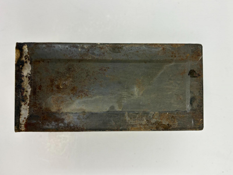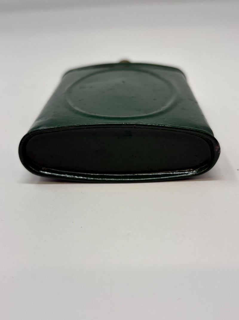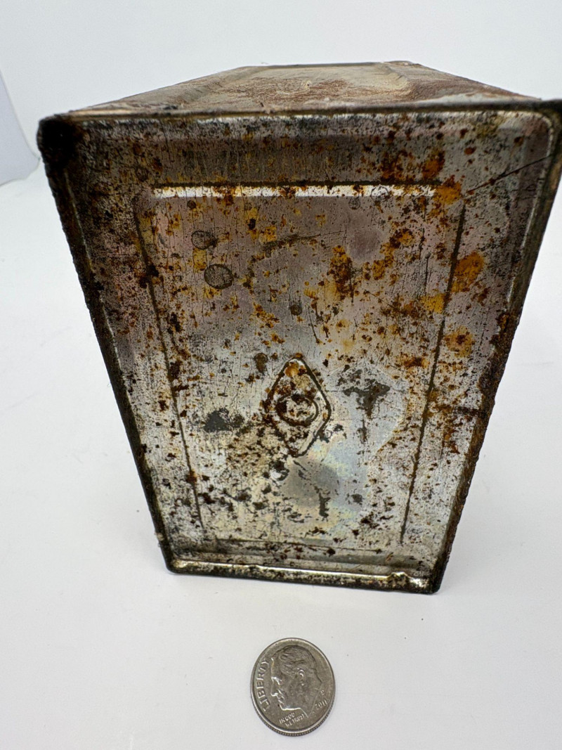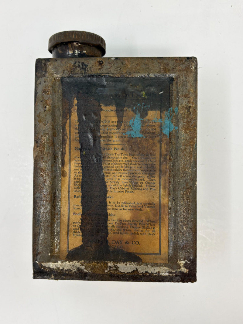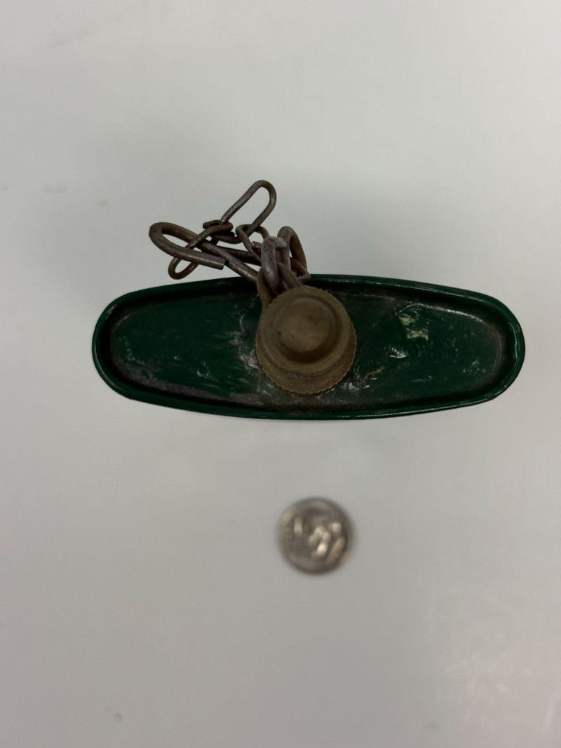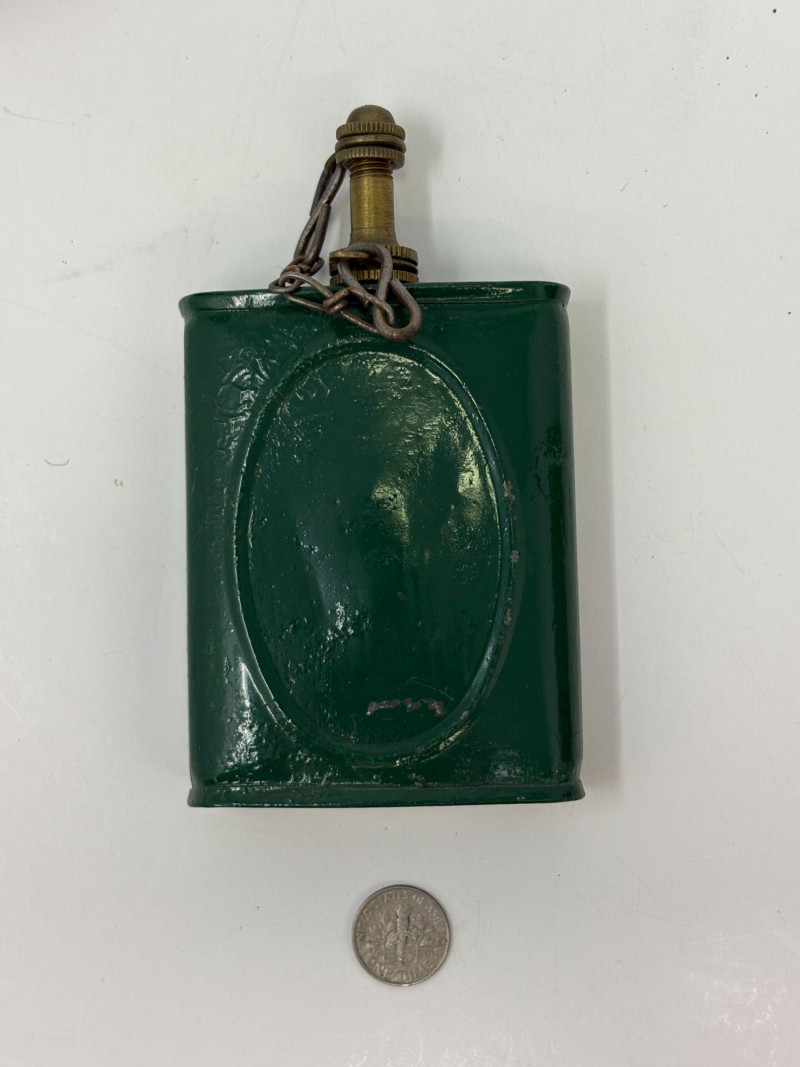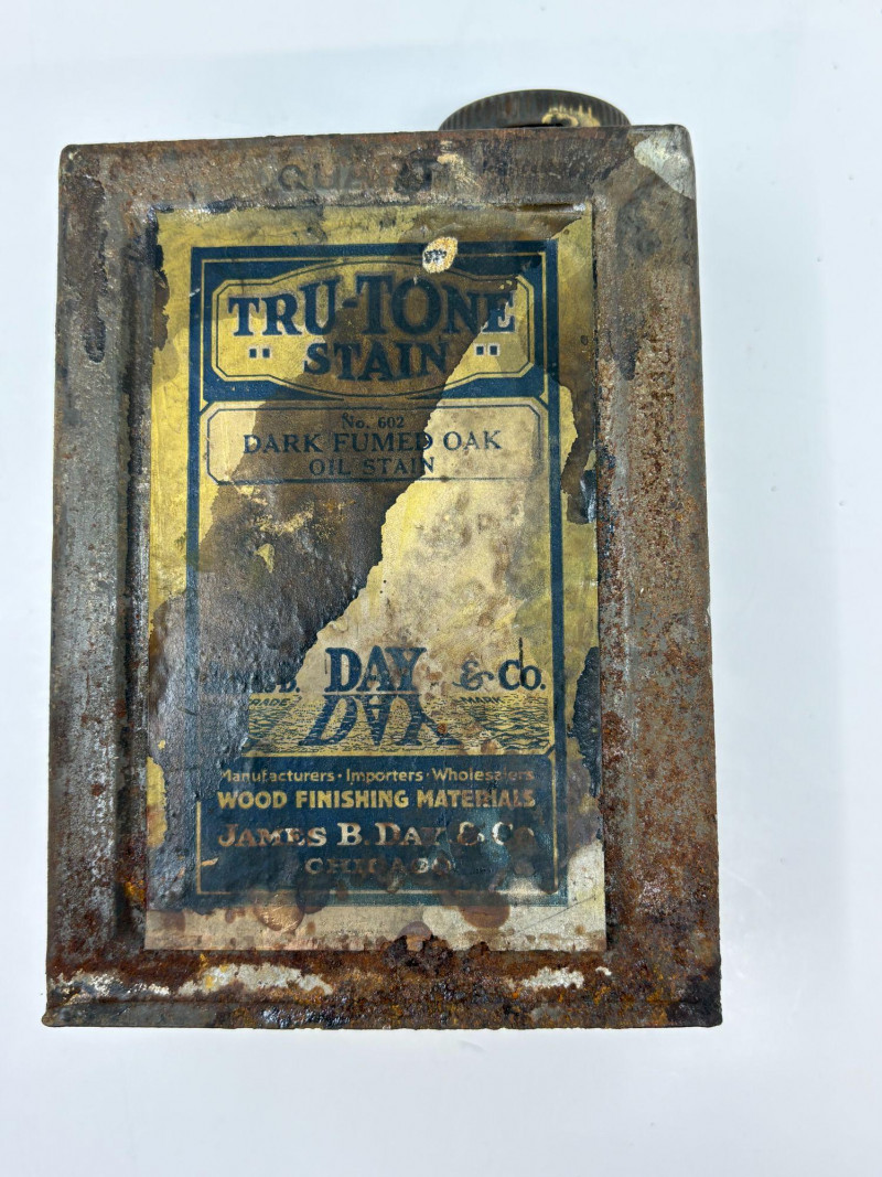Four early workshop tins, each with authentic patina and compact display‑friendly scale: Tru‑Tone rectangular tin, approx. 4"–5" tall, with worn lettering and industrial surface wear. Cotten’s Automotive cylinder, approx. 4"–5" high, featuring bold red graphics and St. Louis maker’s mark. Small Cotten’s tin with two miniature oilers, each 2"–3", classic pocket‑size shop pieces. Round black tin, approx. 2.5"–3" diameter, embossed “62” and “10,” shown with coin for scale.