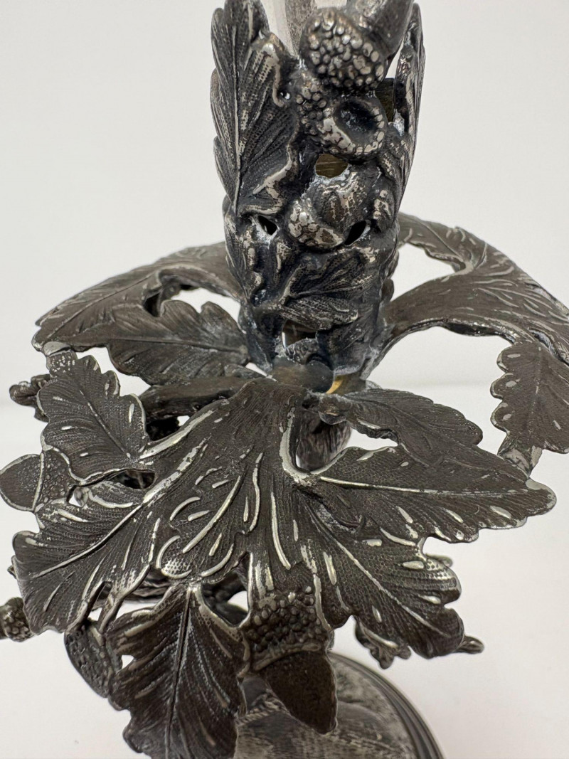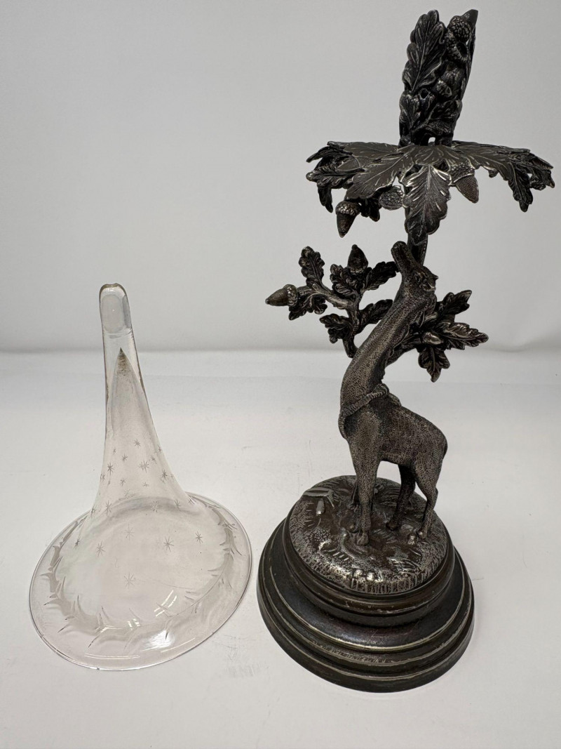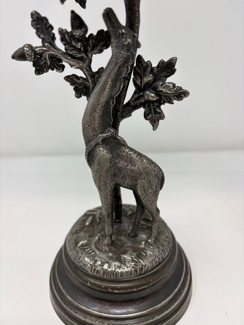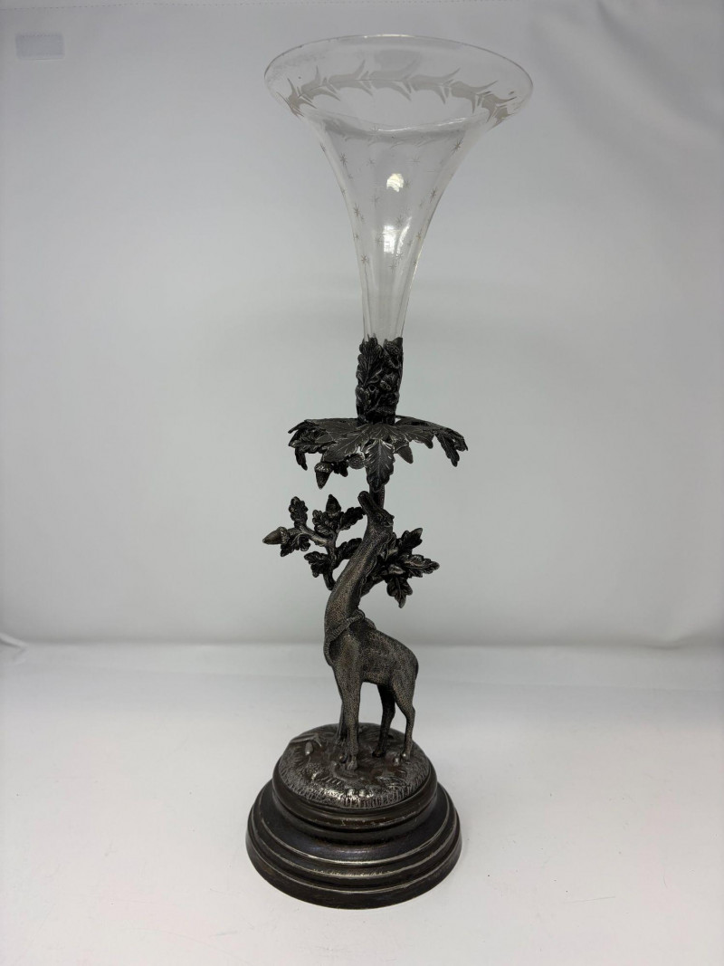 Ornate epergne featuring a cast metal base with a giraffe standing beneath an oak tree, detailed with textured leaves, acorns, and forest‑floor elements. Topped with a removable fluted glass trumpet. Not signed. Approx. Size: 16 3/4" H × 5 1/4" D