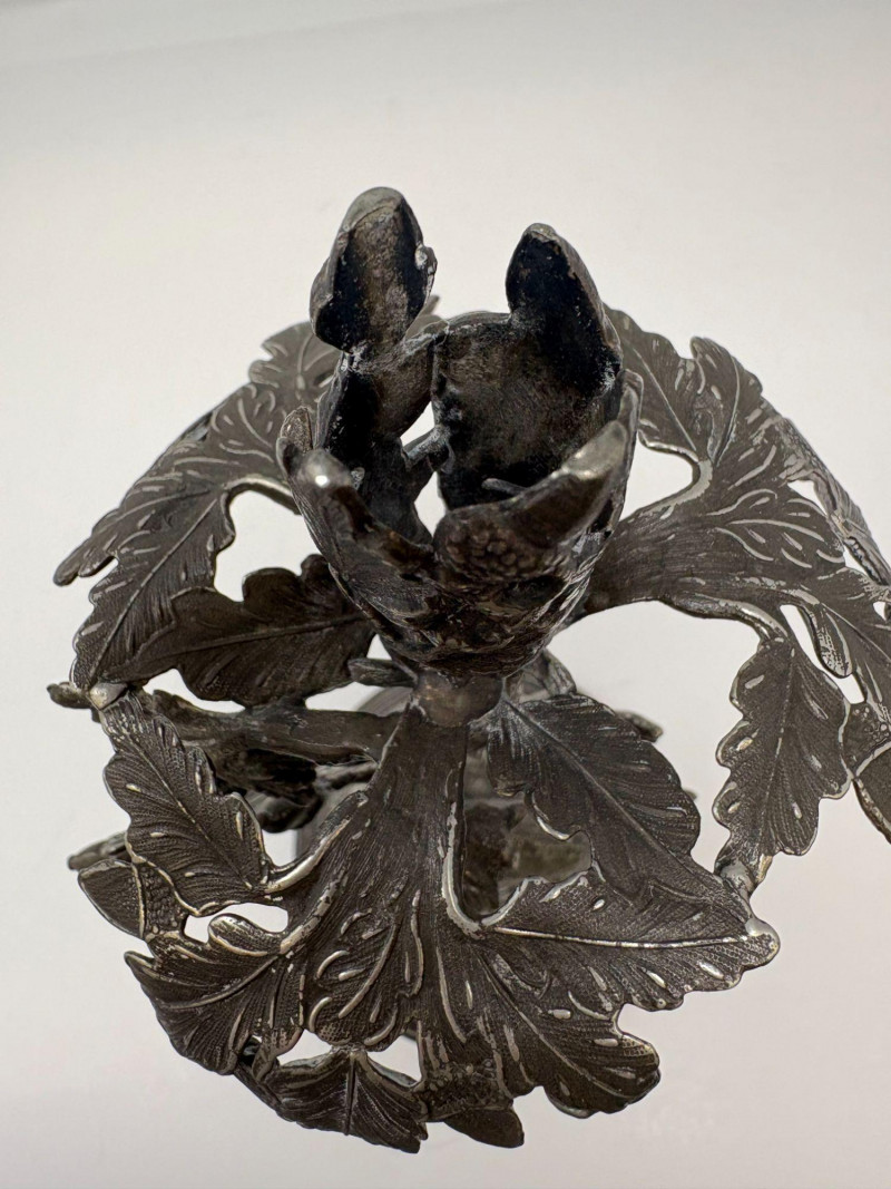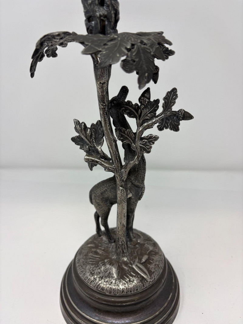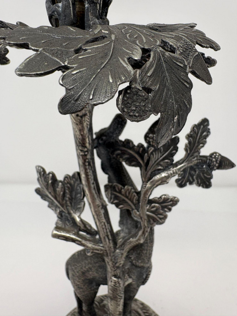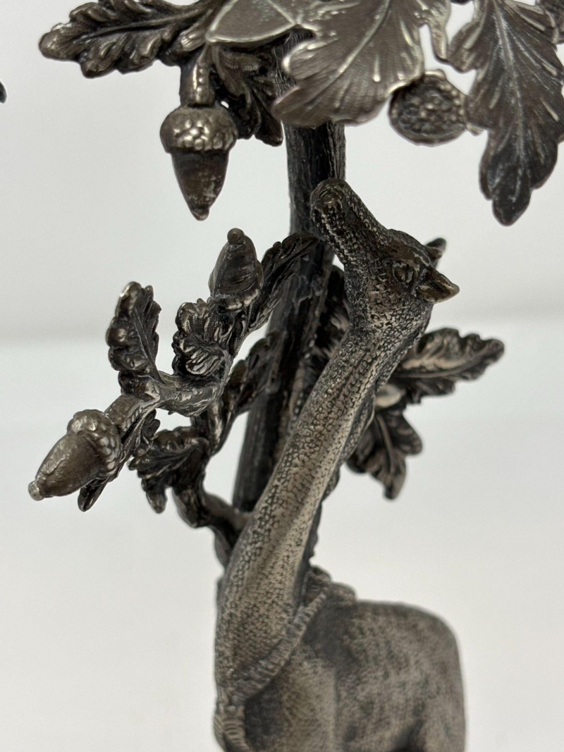 Ornate epergne featuring a cast metal base with a giraffe standing beneath an oak tree, detailed with textured leaves, acorns, and forest‑floor elements. Topped with a removable fluted glass trumpet. Not signed. Approx. Size: 16 3/4" H × 5 1/4" D