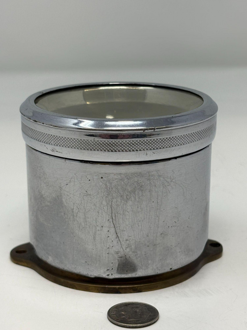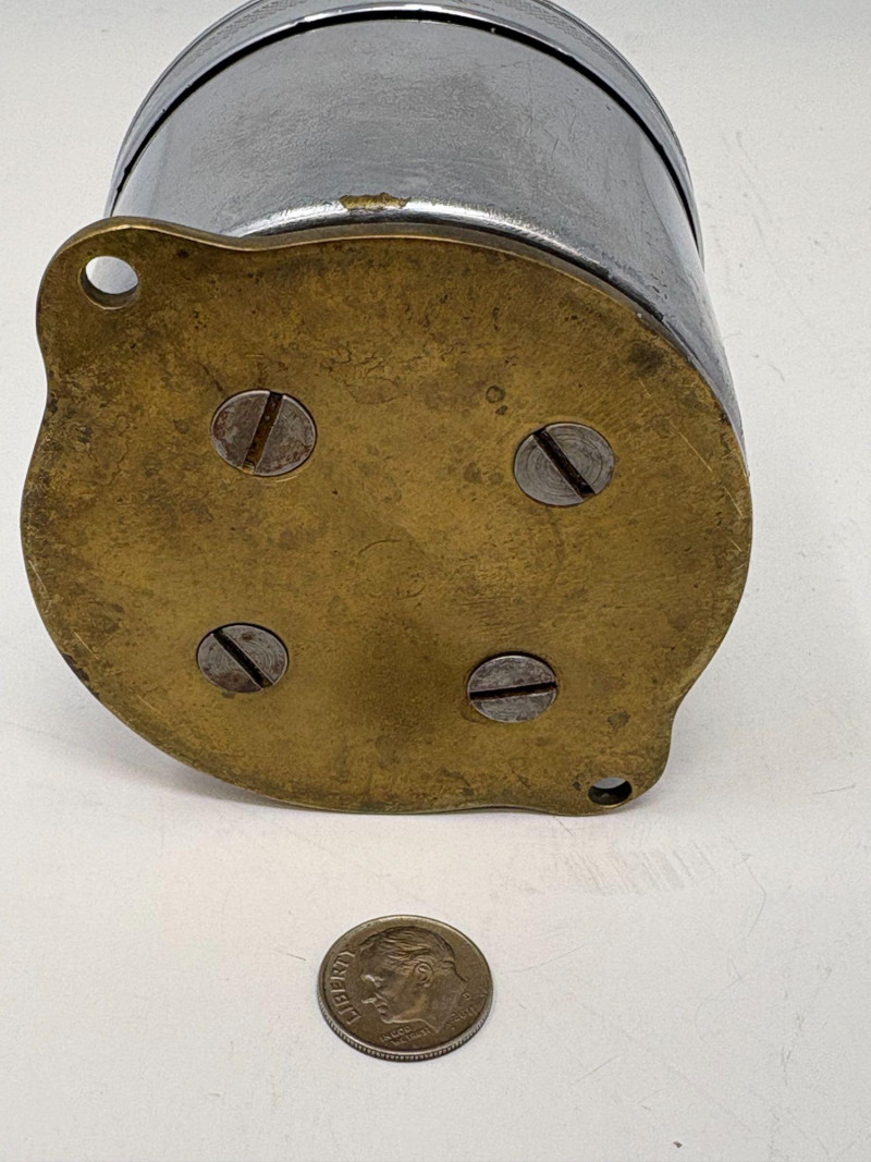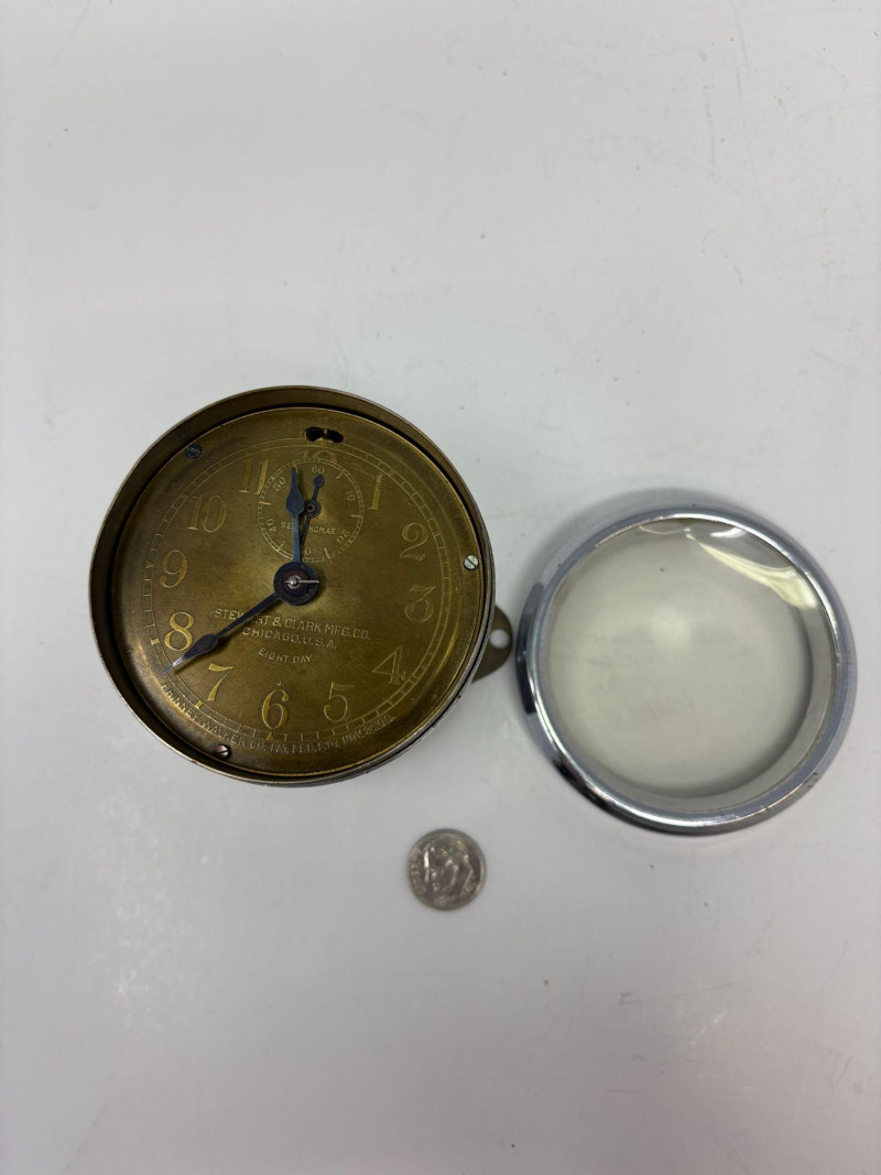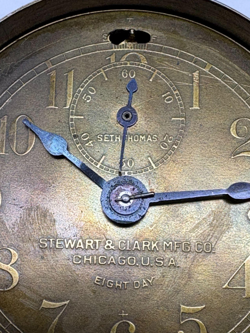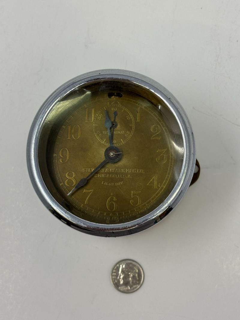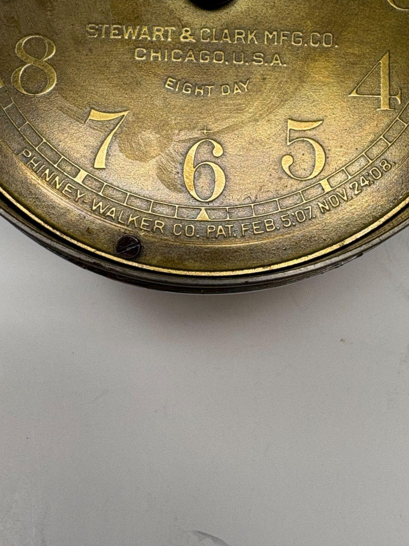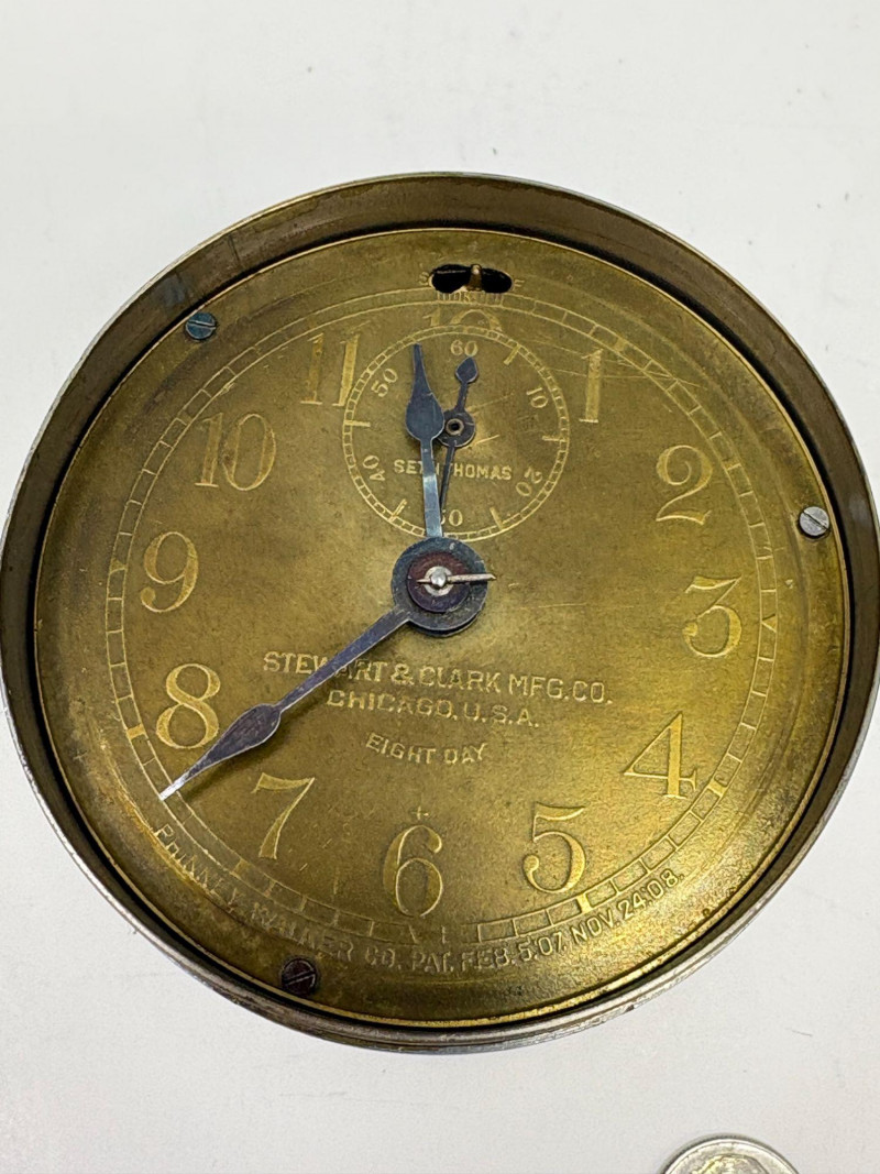 Early 20th‑century Stewart & Clark Mfg. Co. brass‑faced desk clock, marked Chicago, U.S.A. and Pat’d July 1, 1902. Measures approximately 2¾" in diameter with a compact metal case and clear black numerals. Shows age‑appropriate wear consistent with vintage use. A collectible example of turn‑of‑the‑century American clockmaking.