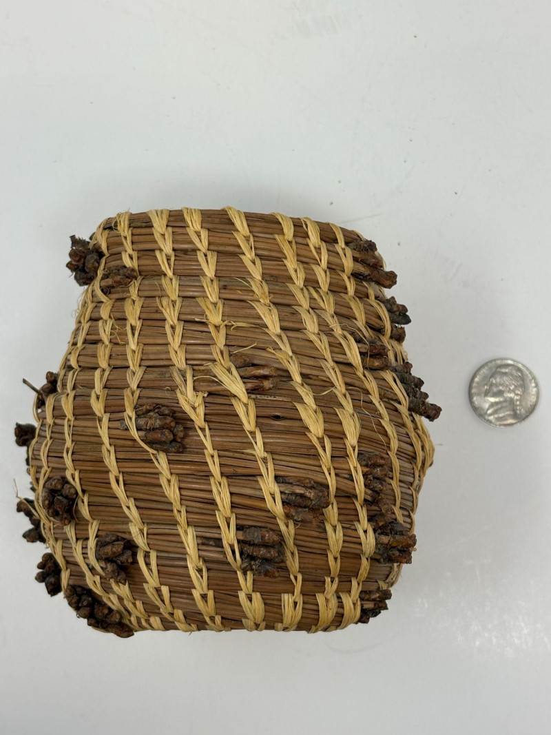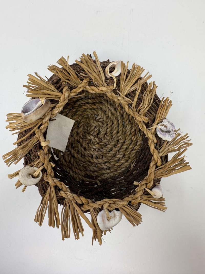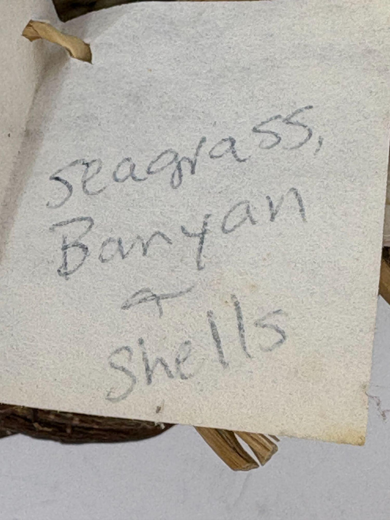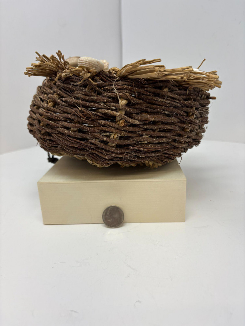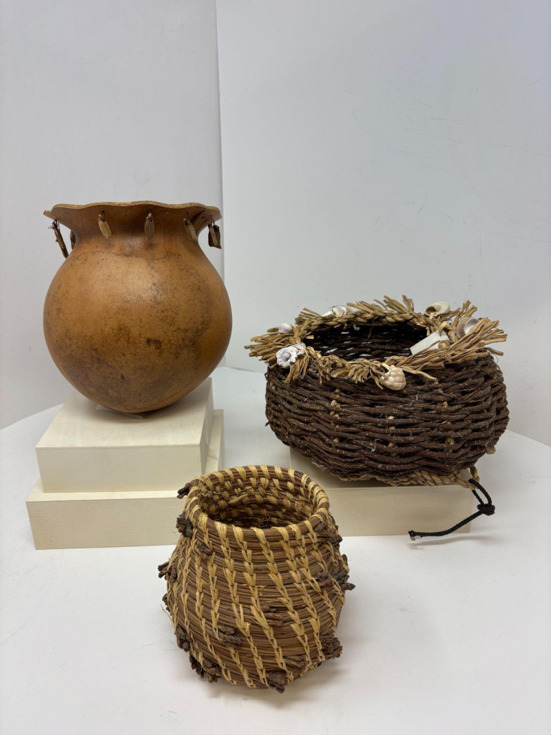 A warm, organic trio featuring one seagrass basket with shell accent (7.5" W × 4.25" H), a finely coiled pine‑needle basket (4" W × 4.5" H), and a decorated gourd vessel measuring 6" H × 5.5" W. Each piece highlights traditional craftsmanship and natural materials.