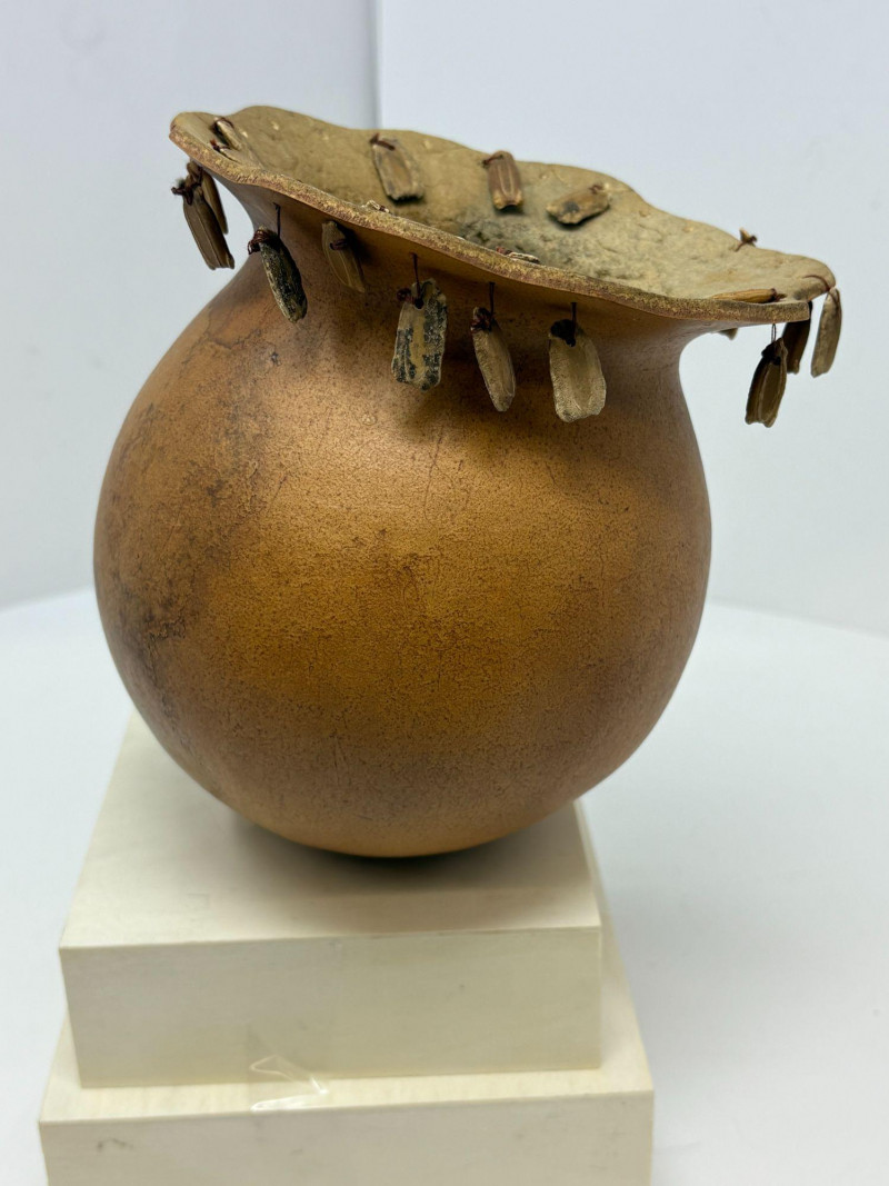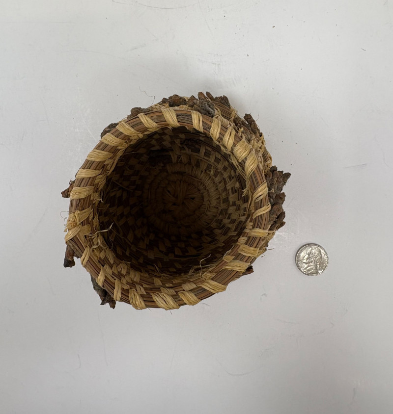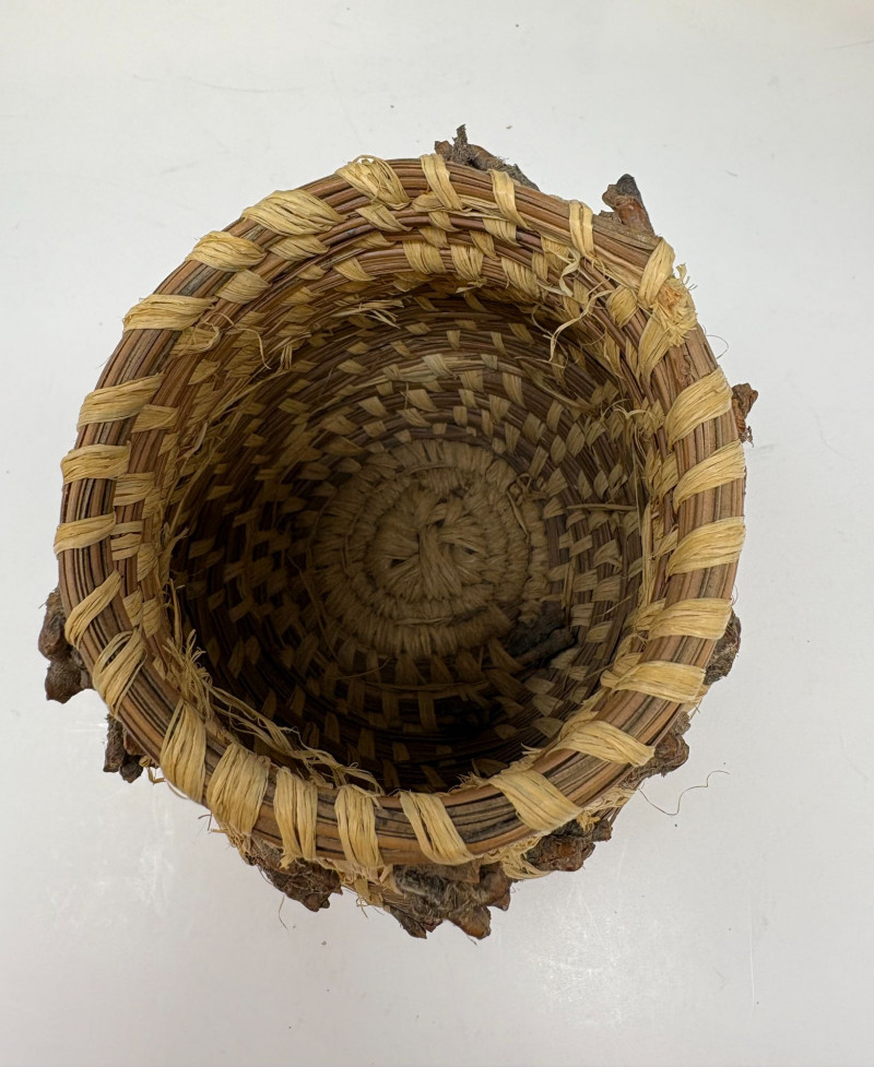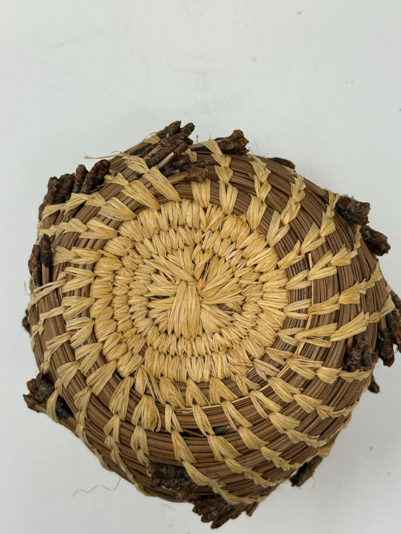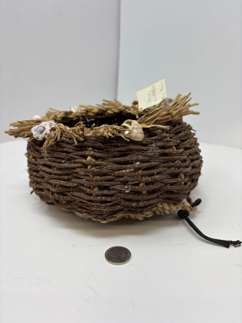 A warm, organic trio featuring one seagrass basket with shell accent (7.5" W × 4.25" H), a finely coiled pine‑needle basket (4" W × 4.5" H), and a decorated gourd vessel measuring 6" H × 5.5" W. Each piece highlights traditional craftsmanship and natural materials.