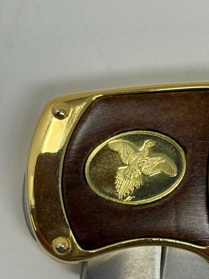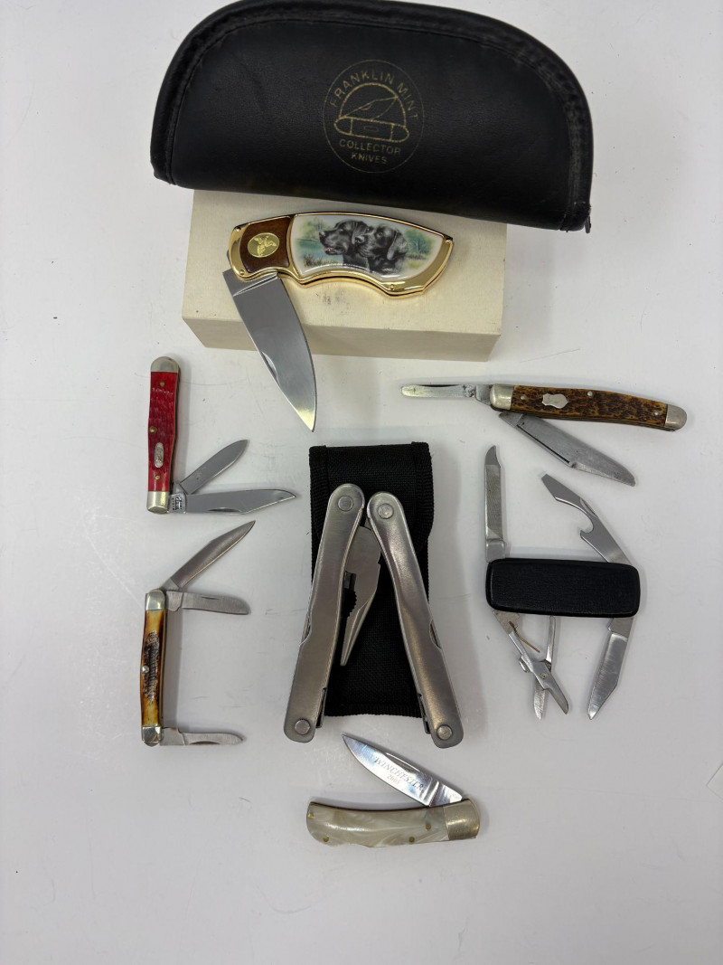 A seven‑knife collection spanning classic American makers and collectible specialty pieces Kershaw Folding Knife – Approx. 4½" x 1" closed. Clean lines, stainless blade, everyday utility. Wood‑Handled Multi‑Purpose Knife – Approx. 4½" x 1" closed. Warm wood scales with brass accents. Schrade Multi‑Purpose Knife (with case) – Approx. 4¾" x 1" closed. Multi‑tool configuration with original sheath. Franklin Mint “Bird Dogs” Knife (with case) – Approx. 4" x 1½" closed. Detailed sporting‑dog artwork on the handle. Case XX 6254 – Approx. 3¾" x 1" closed. Classic two‑blade folder with Case’s signature jigged handle. MGC Steadman‑Handle Knife – Approx. 3½" x 1" closed. Distinctive Steadman artwork inset into the handle. Winchester 2005 Bird‑Handle Knife – Approx. 3" x 1½" closed. Brass‑inlaid bird motif, collectible commemorative edition.